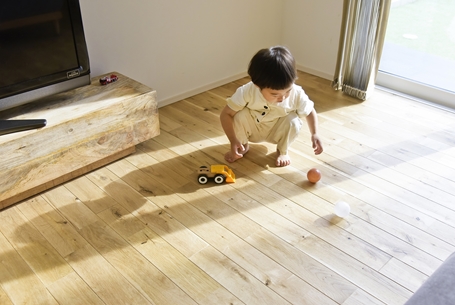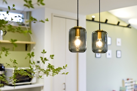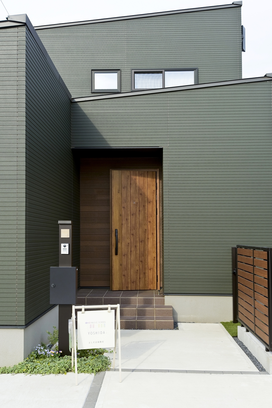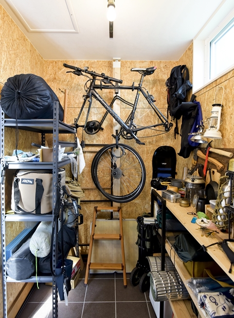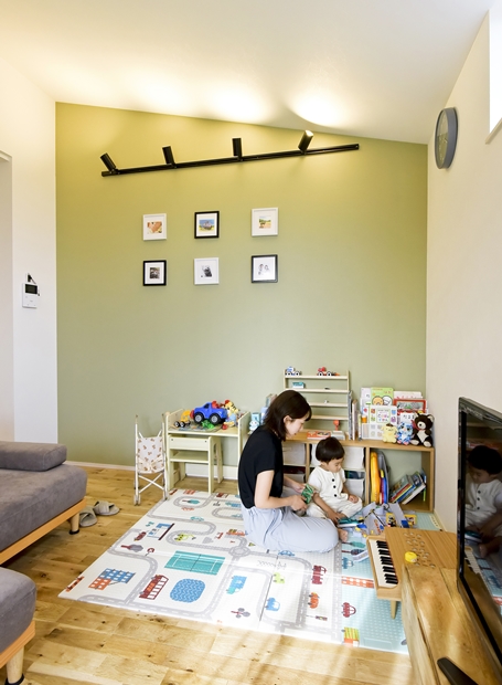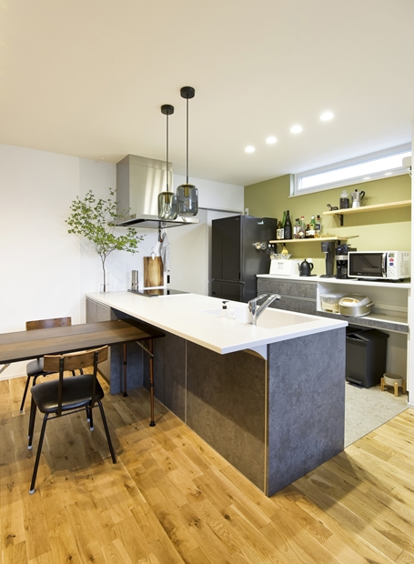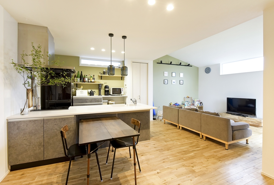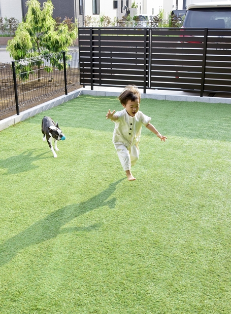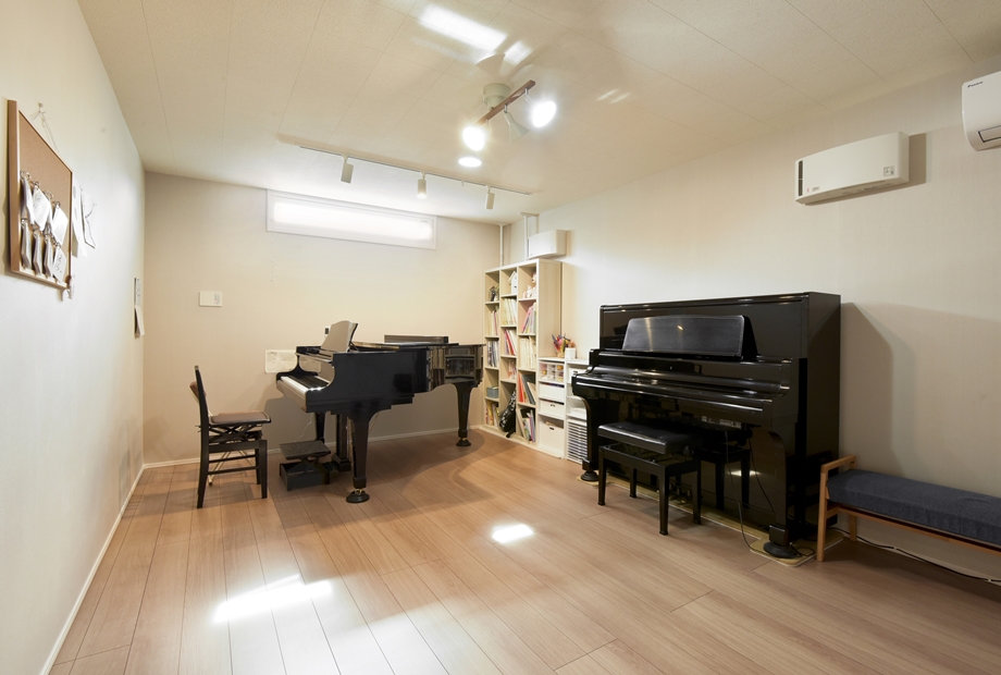 元音楽の先生である奥様が、家で音楽教室を開きたくて建てた防音室付きのおうちです。防音材や防音ドアなどを施した部屋には思い出のピアノを配置。住宅街でも周囲を気にすることなく音楽が楽しめる特別な空間です。居住部は自然素材である無垢床を使用し、優しく落ち着きのある空間に。ベージュやグリーン、グレーなど、自然色を生かしてコーディネートされています。わんちゃんが走り回れるお庭兼ドッグランや、玄関横に設けたアウトドア収納にも注目。家族の好きをたっぷり詰め込んだおうちです。