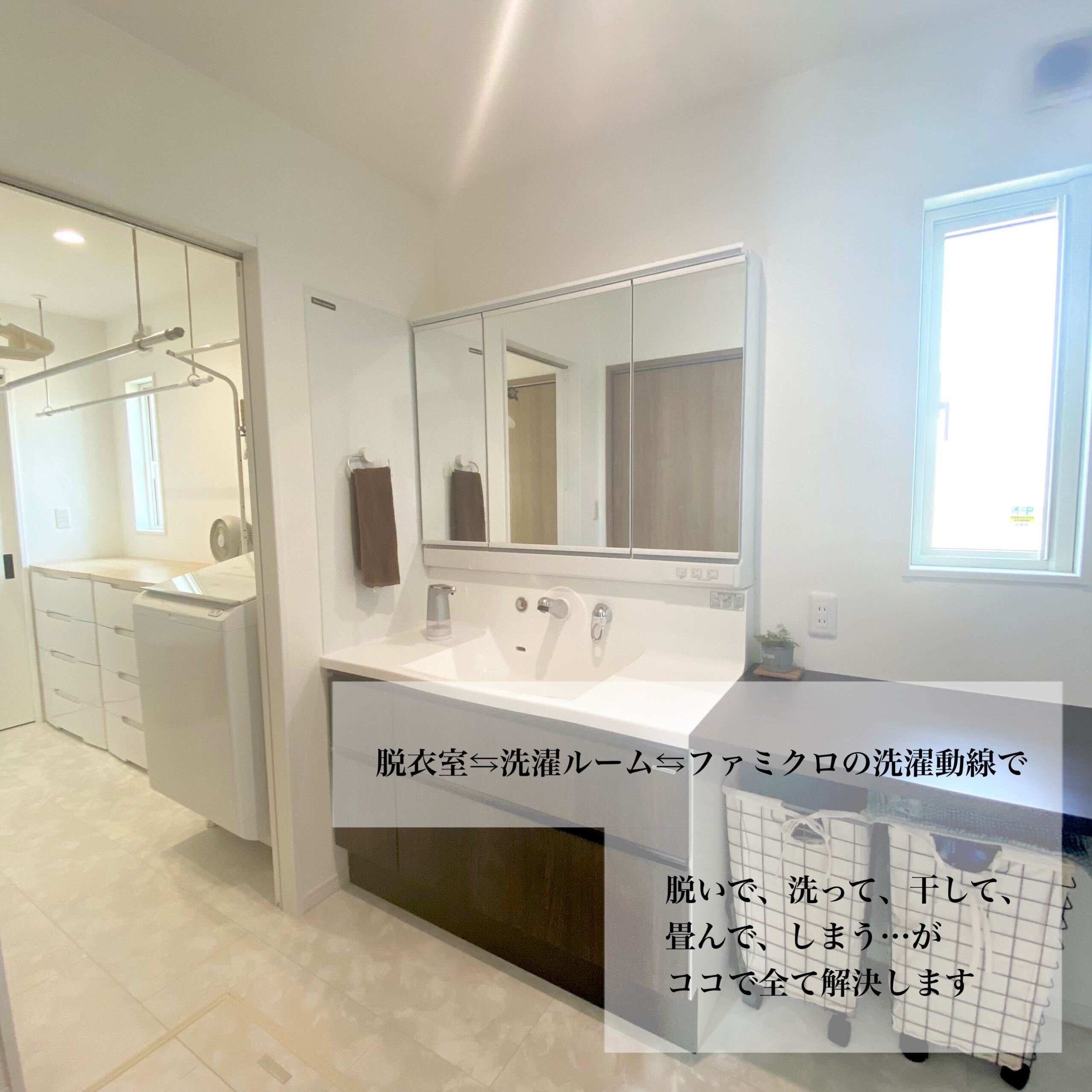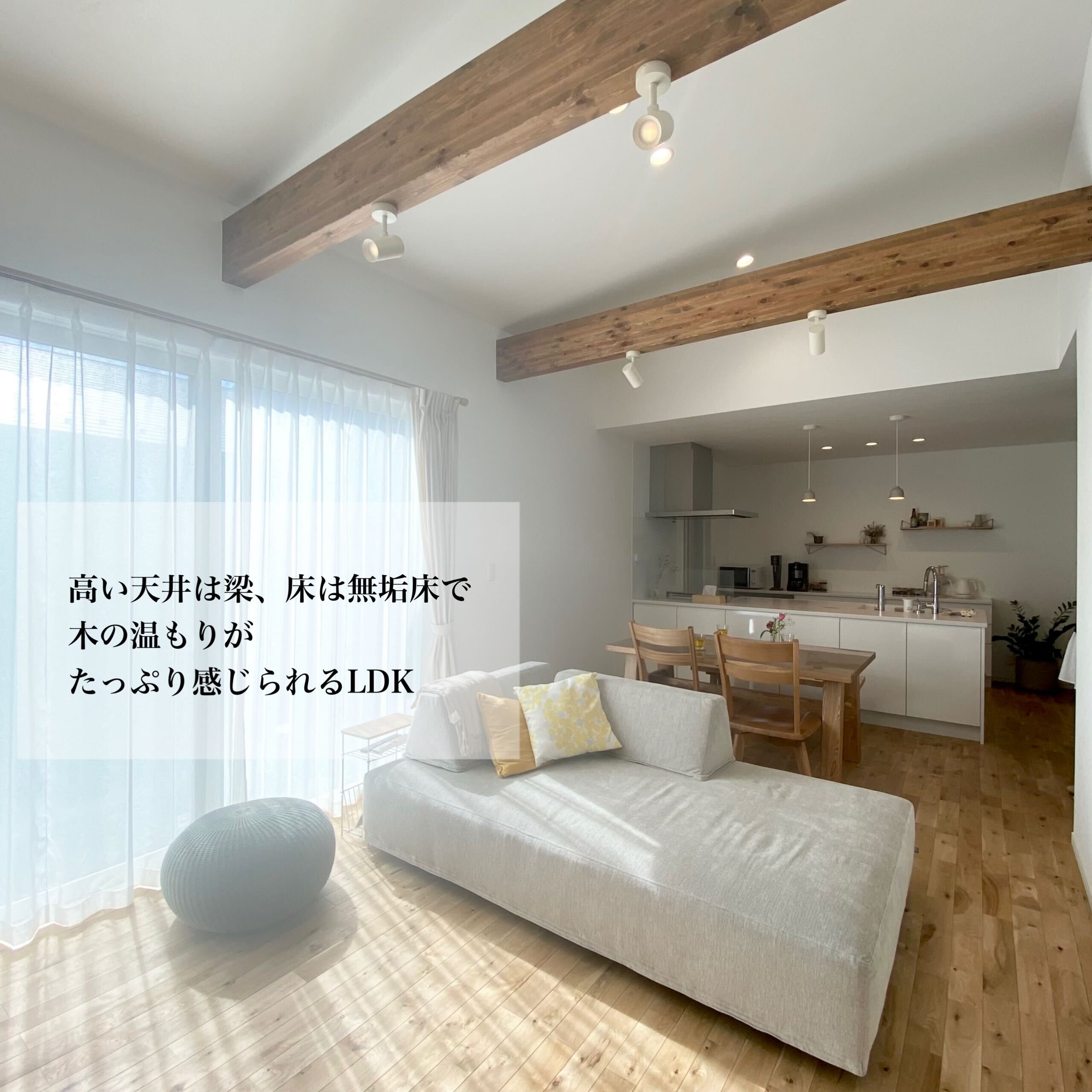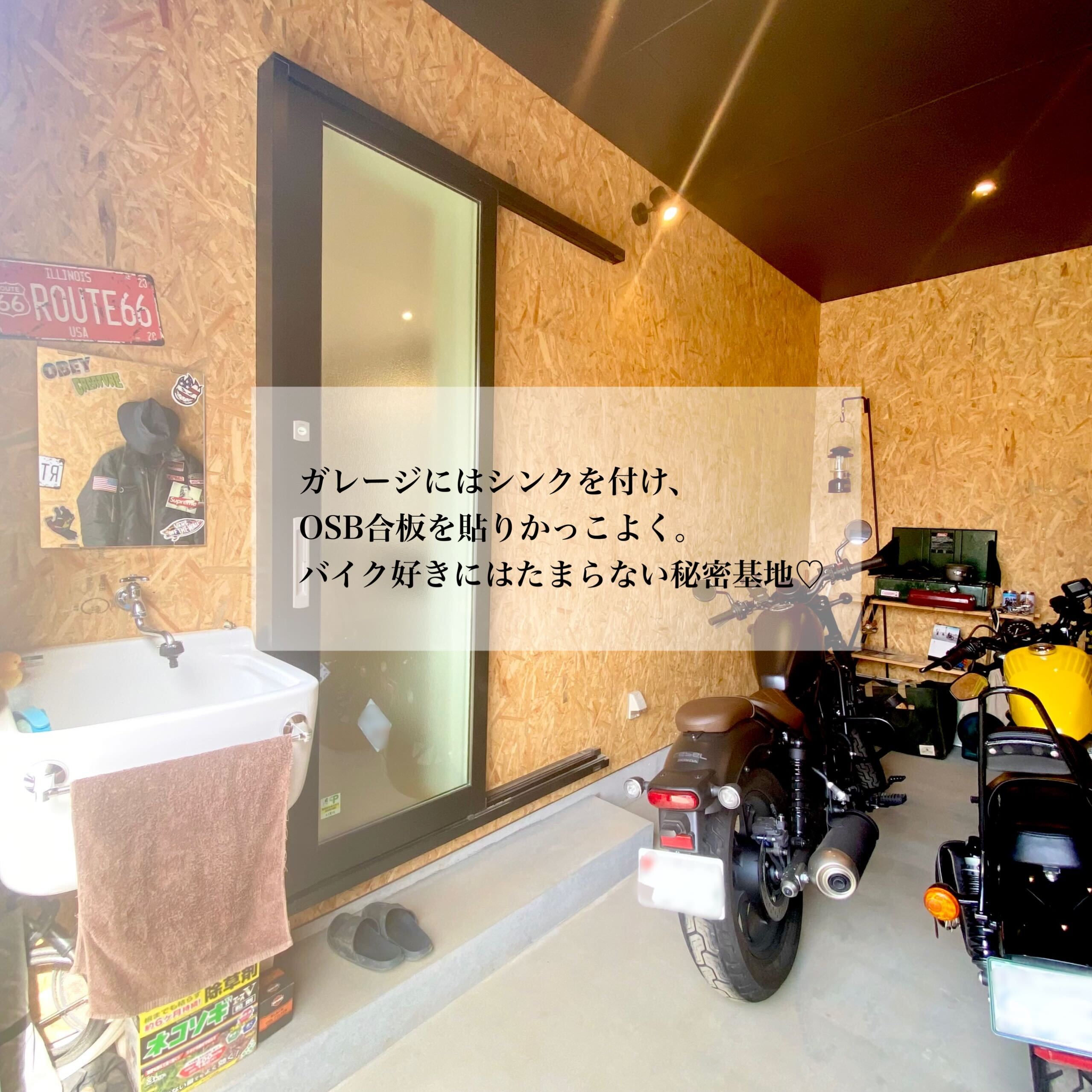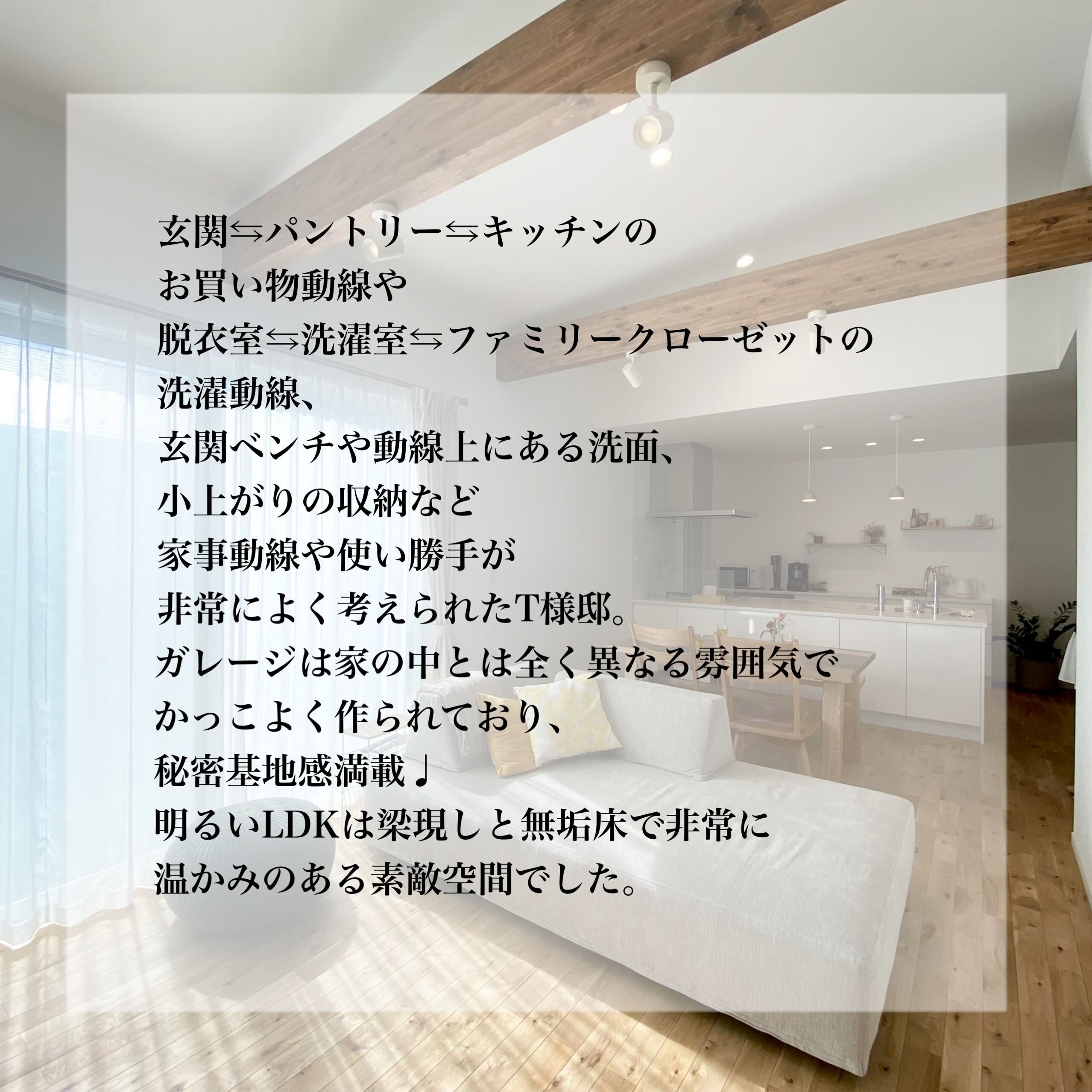 玄関・パントリー・キッチンのお買い物動線や、脱衣室・洗濯室・ファミリークローゼットの洗濯動線、玄関ベンチや動線上にある洗面、小上がりの収納など家事動線や使い勝手が非常に考えられたT様邸。ガレージは家の中とは全く異なる雰囲気でかっこよく作られており、秘密基地感満載!明るいLDKは、梁現しと無垢床で非常に温かみのある素敵な空間です。