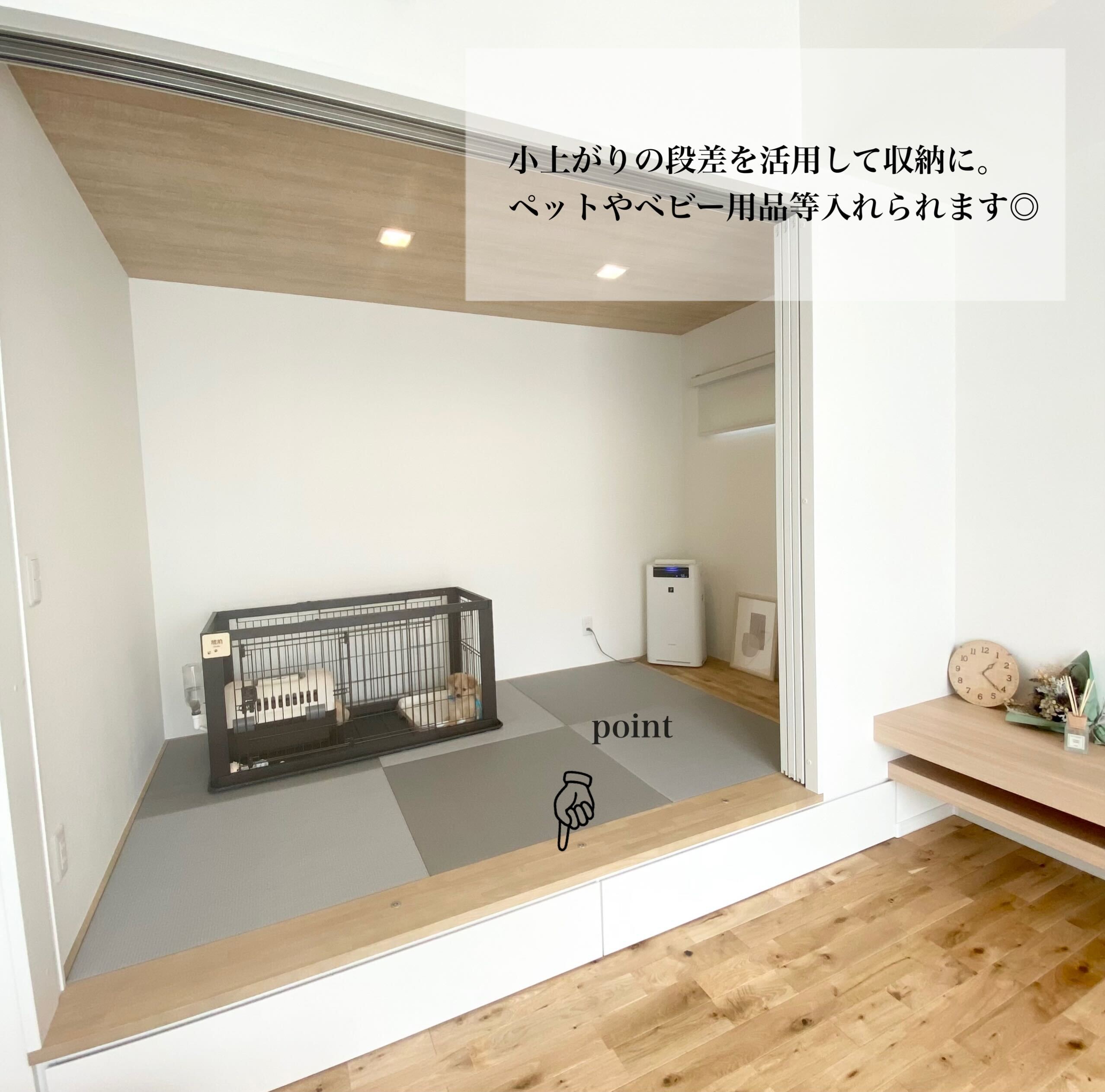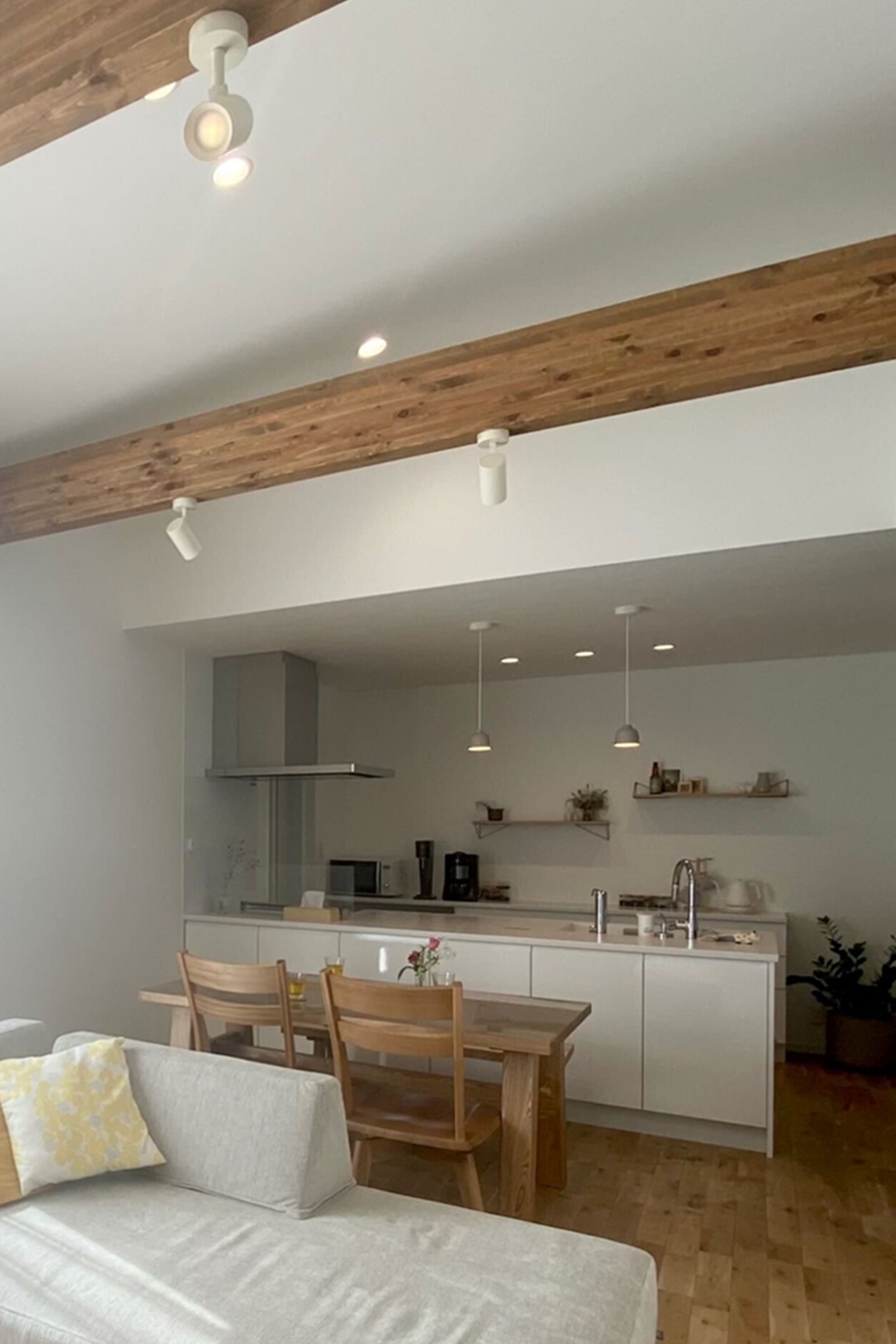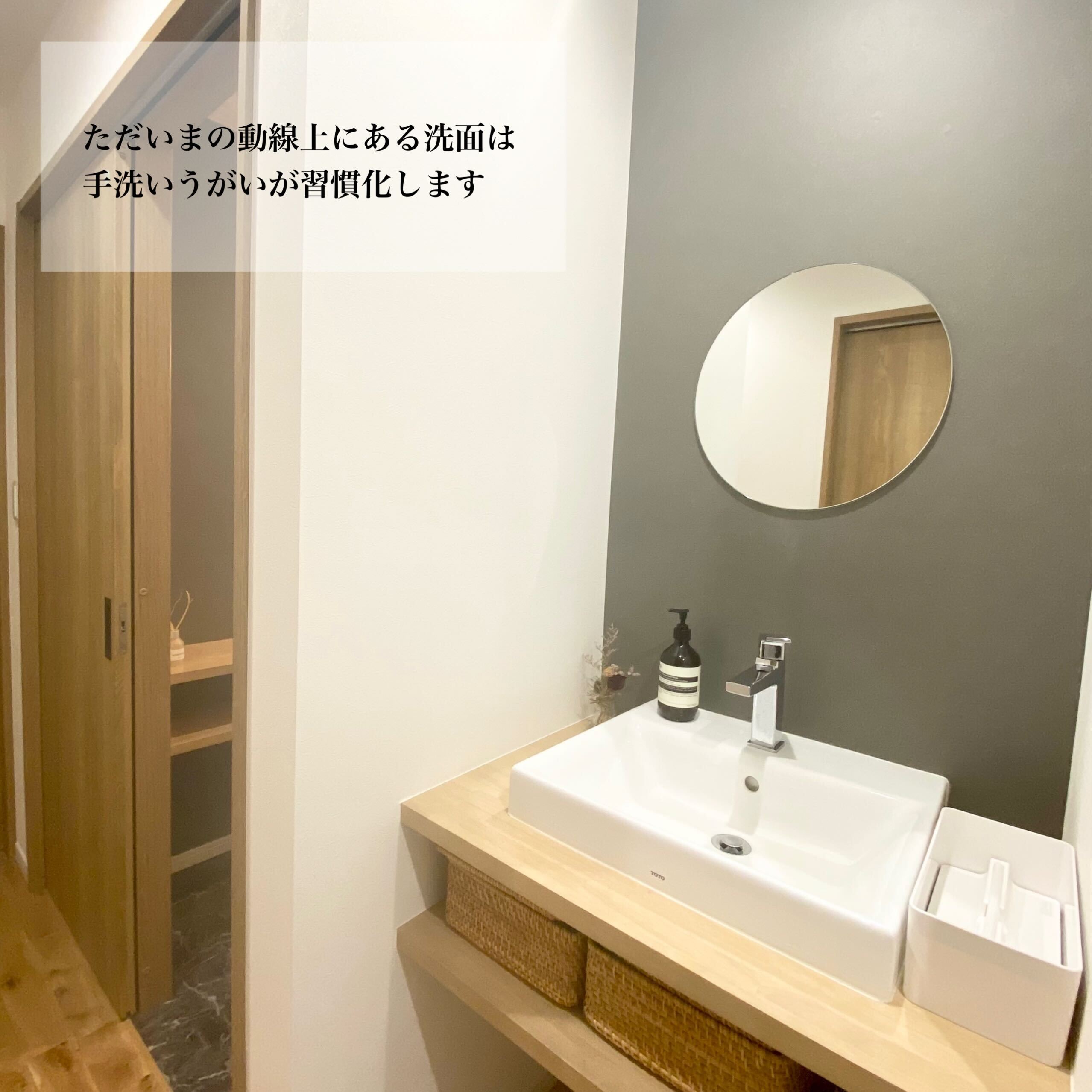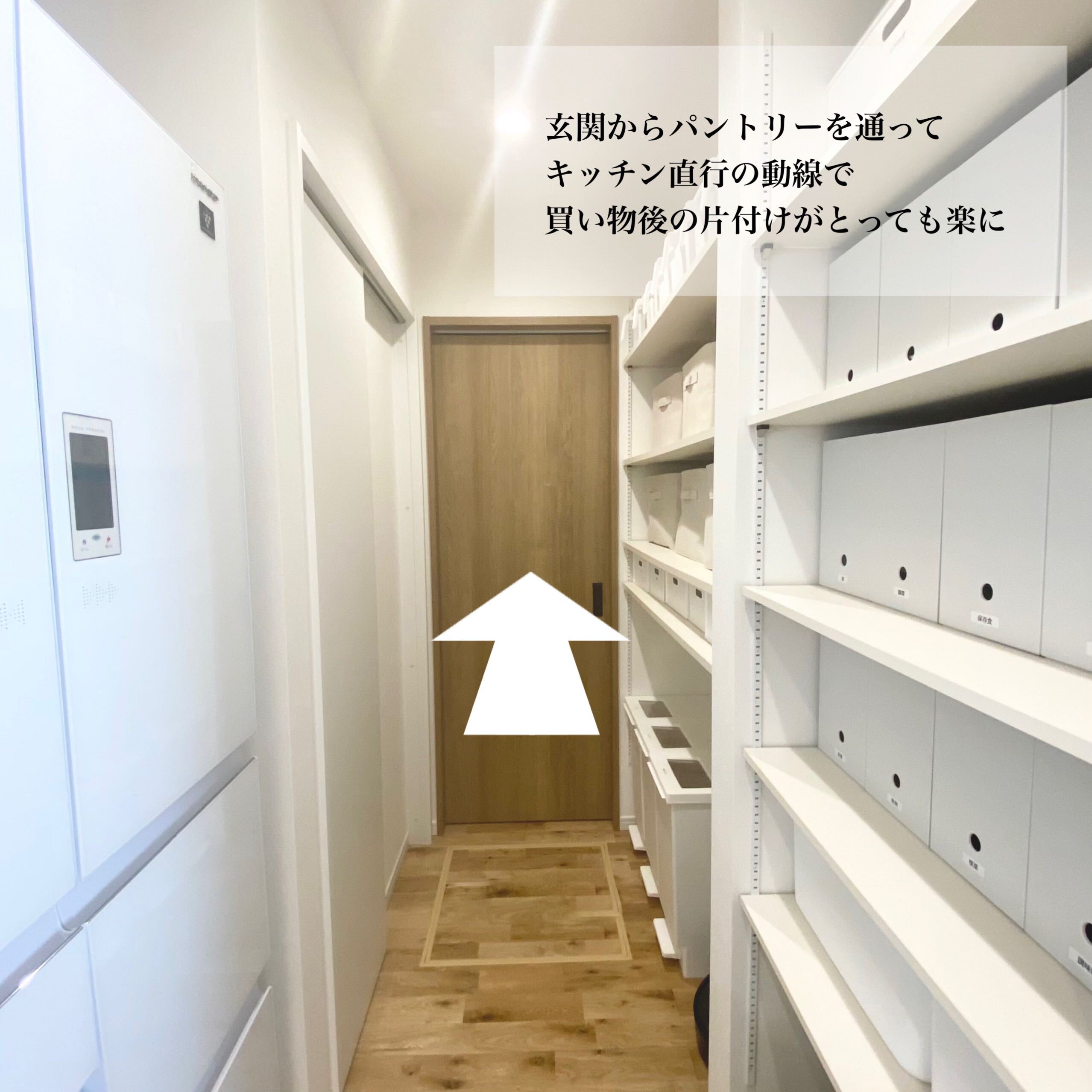 玄関・パントリー・キッチンのお買い物動線や、脱衣室・洗濯室・ファミリークローゼットの洗濯動線、玄関ベンチや動線上にある洗面、小上がりの収納など家事動線や使い勝手が非常に考えられたT様邸。ガレージは家の中とは全く異なる雰囲気でかっこよく作られており、秘密基地感満載!明るいLDKは、梁現しと無垢床で非常に温かみのある素敵な空間です。