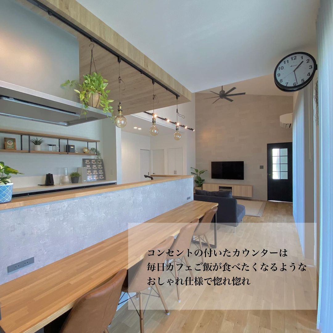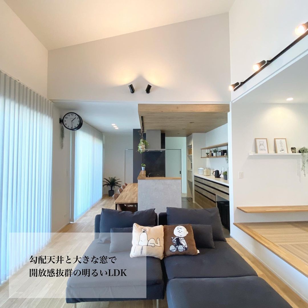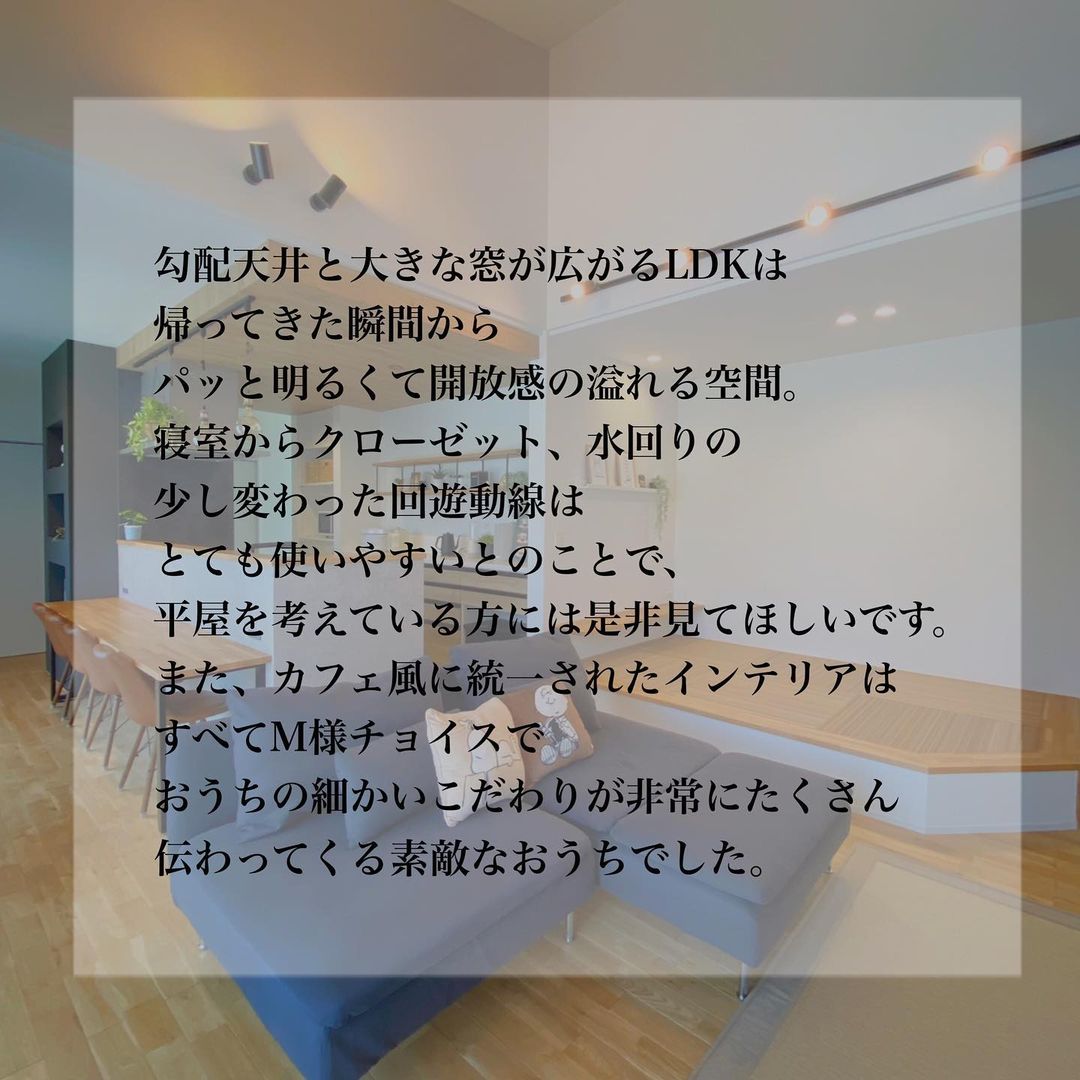 勾配天井と大きな窓が広がるLDKは、帰ってきた瞬間から明るく開放感の溢れる空間。寝室からクローゼット、水回りの少し変わった回遊動線はとても使いやすいとのことで、平屋を考えている方には是非見てほしいポイントです。また街中のカフェ風に統一されたインテリアはすべてM様のチョイスで、おうちの細かいこだわりがたくさん伝わってくる素敵なおうちです。