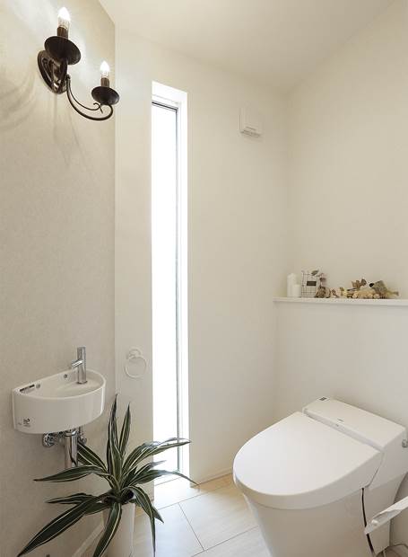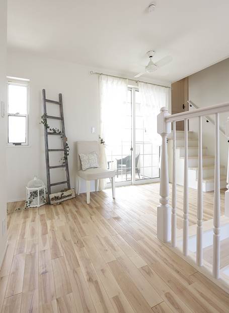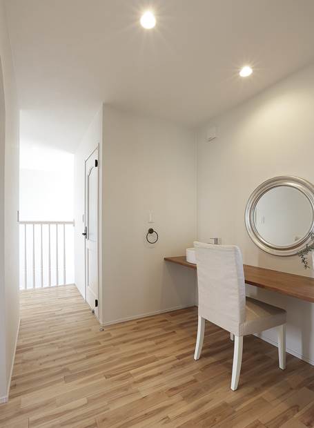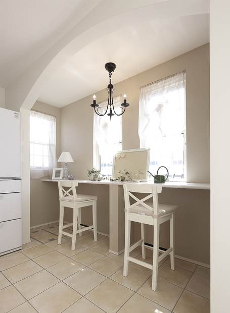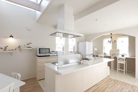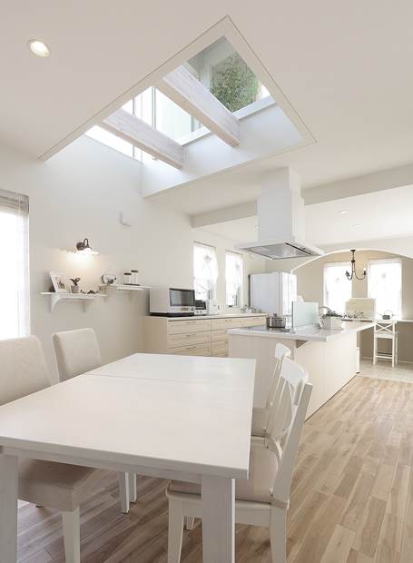 吹抜けから光がアイランドキッチンを明るく照らす。