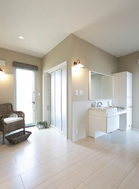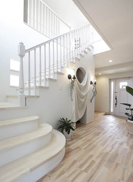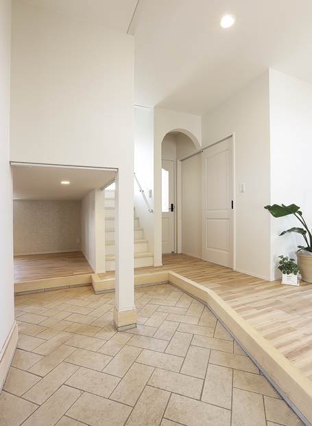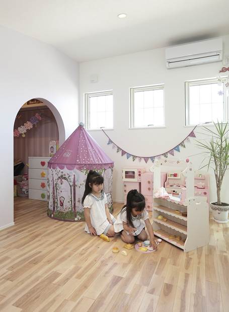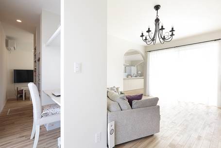 リビングでくつろぐYさんご家族。ダイニングとリビングはRの垂れ壁でゆるやかにゾーニングしたLDK。「私がキッチンに立つとリビングや玄関、吹抜けを通して2階も見えます。これにより家族をいつも身近に感じることができますね」とY夫人が空間の中から視線の抜けや室内がどう見えるか考え、こだわりを実現しました。