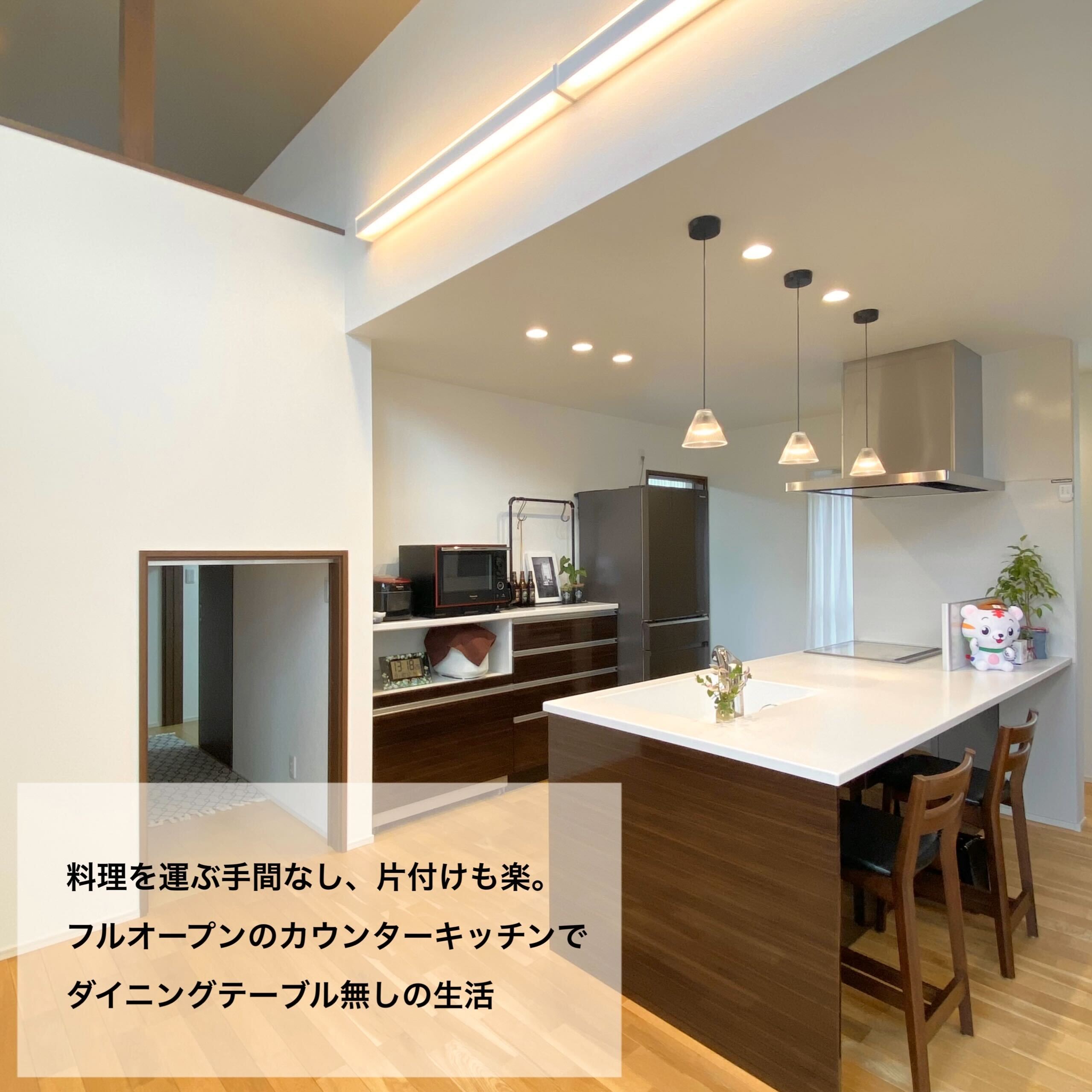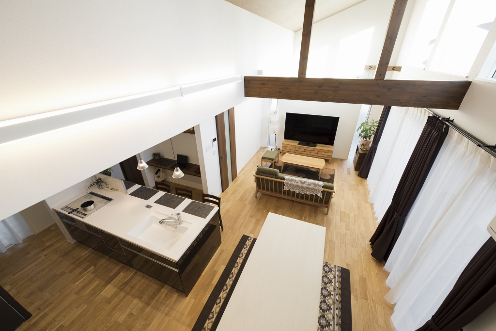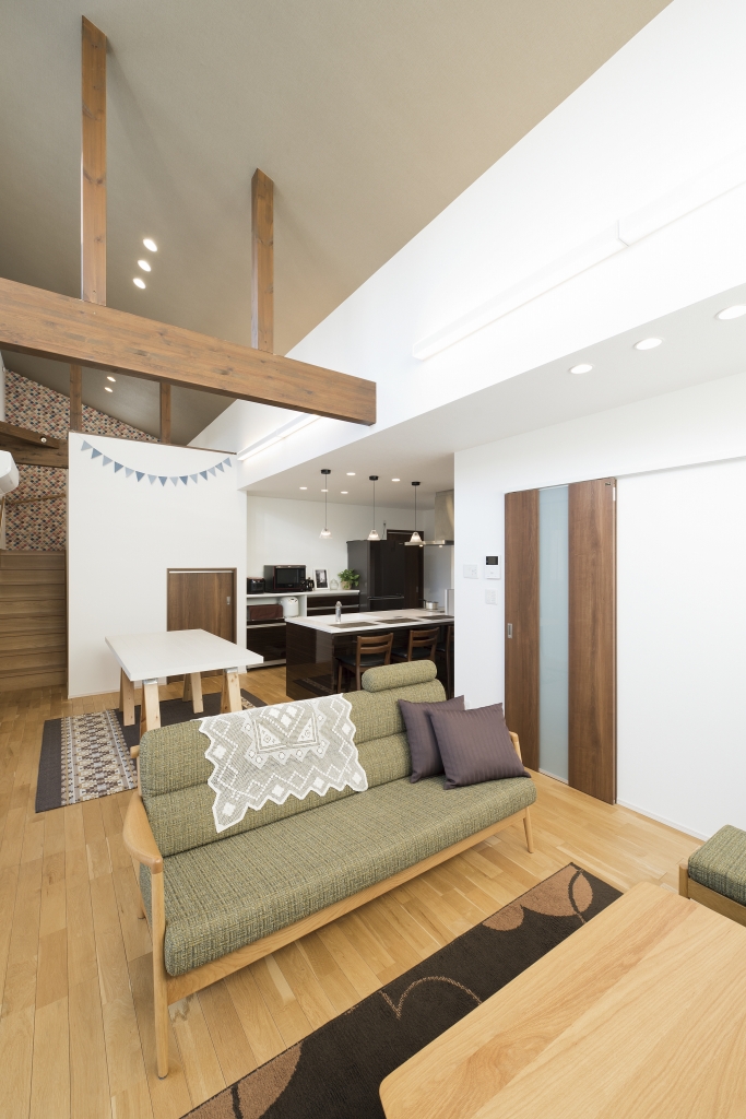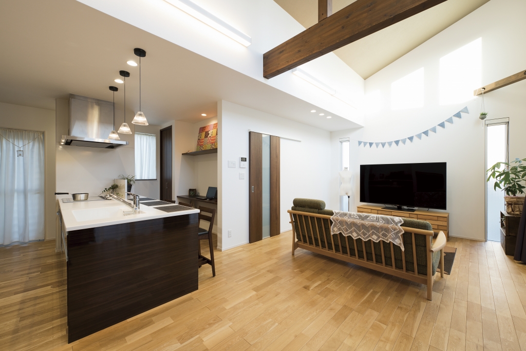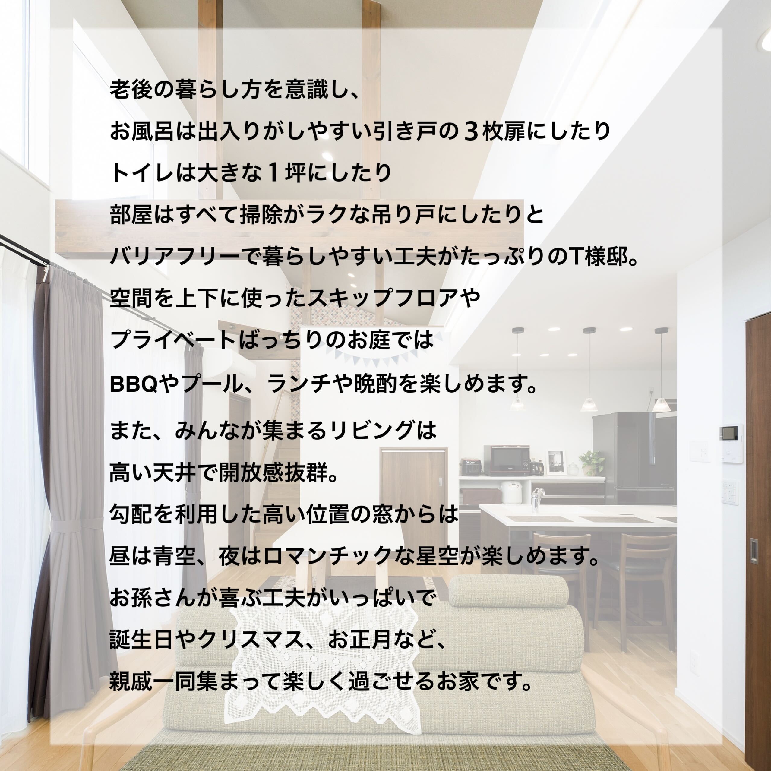 老後の暮らし方を意識し、お風呂は出入りがしやすい引き戸の3枚扉にしたりトイレは大きな1坪にしたり部屋はすべて掃除がラクな吊り戸にしたりとバリアフリーで暮らしやすい工夫がたっぷりのT様邸。空間を上下に使ったスキップフロアやプライベートばっちりのお庭ではBBQやプール、ランチや晩酌を楽しめます。また、みんなが集まるリビングは高い天井で開放感抜群。勾配を利用した高い位置の窓からは昼は青空、夜はロマンチックな星空が楽しめます。お孫さんが喜ぶ工夫がいっぱいで誕生日やクリスマス、お正月など、親戚一同集まって楽しく過ごせるお家です。
