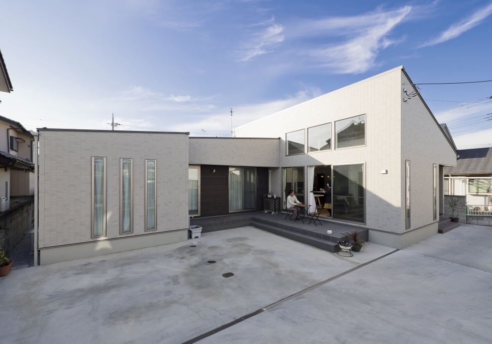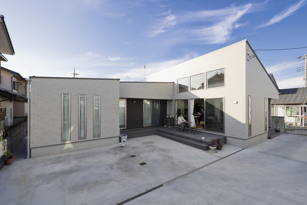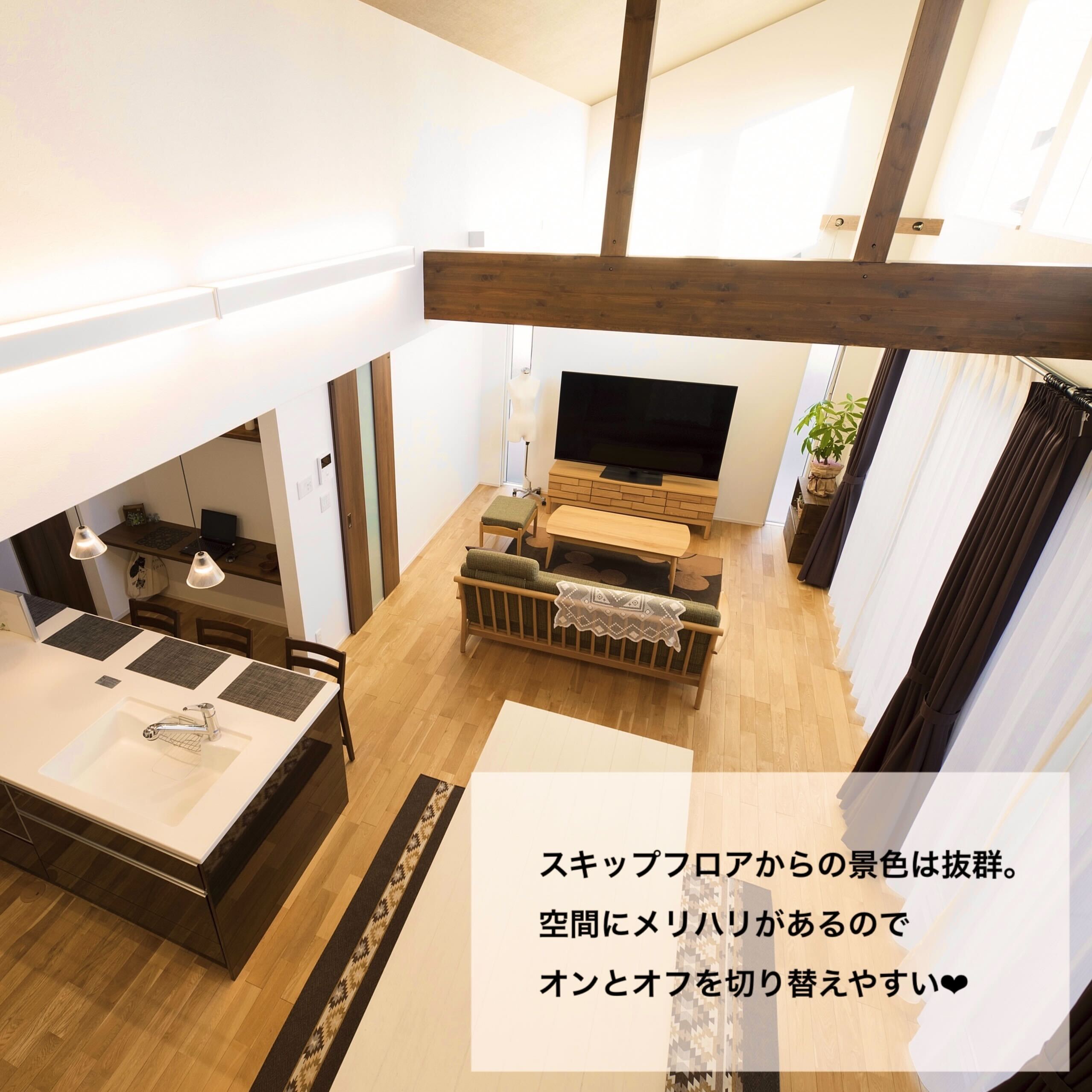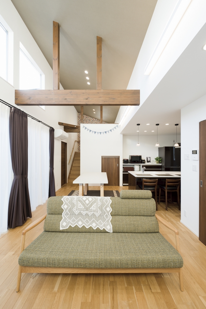 老後の暮らし方を意識し、お風呂は出入りがしやすい引き戸の3枚扉にしたりトイレは大きな1坪にしたり部屋はすべて掃除がラクな吊り戸にしたりとバリアフリーで暮らしやすい工夫がたっぷりのT様邸。空間を上下に使ったスキップフロアやプライベートばっちりのお庭ではBBQやプール、ランチや晩酌を楽しめます。また、みんなが集まるリビングは高い天井で開放感抜群。勾配を利用した高い位置の窓からは昼は青空、夜はロマンチックな星空が楽しめます。お孫さんが喜ぶ工夫がいっぱいで誕生日やクリスマス、お正月など、親戚一同集まって楽しく過ごせるお家です。
