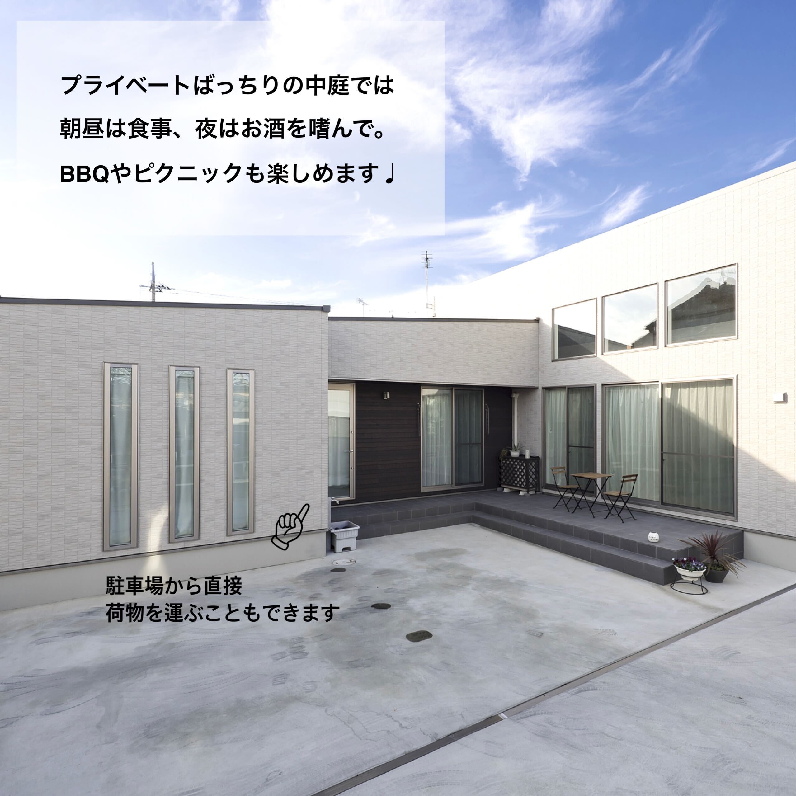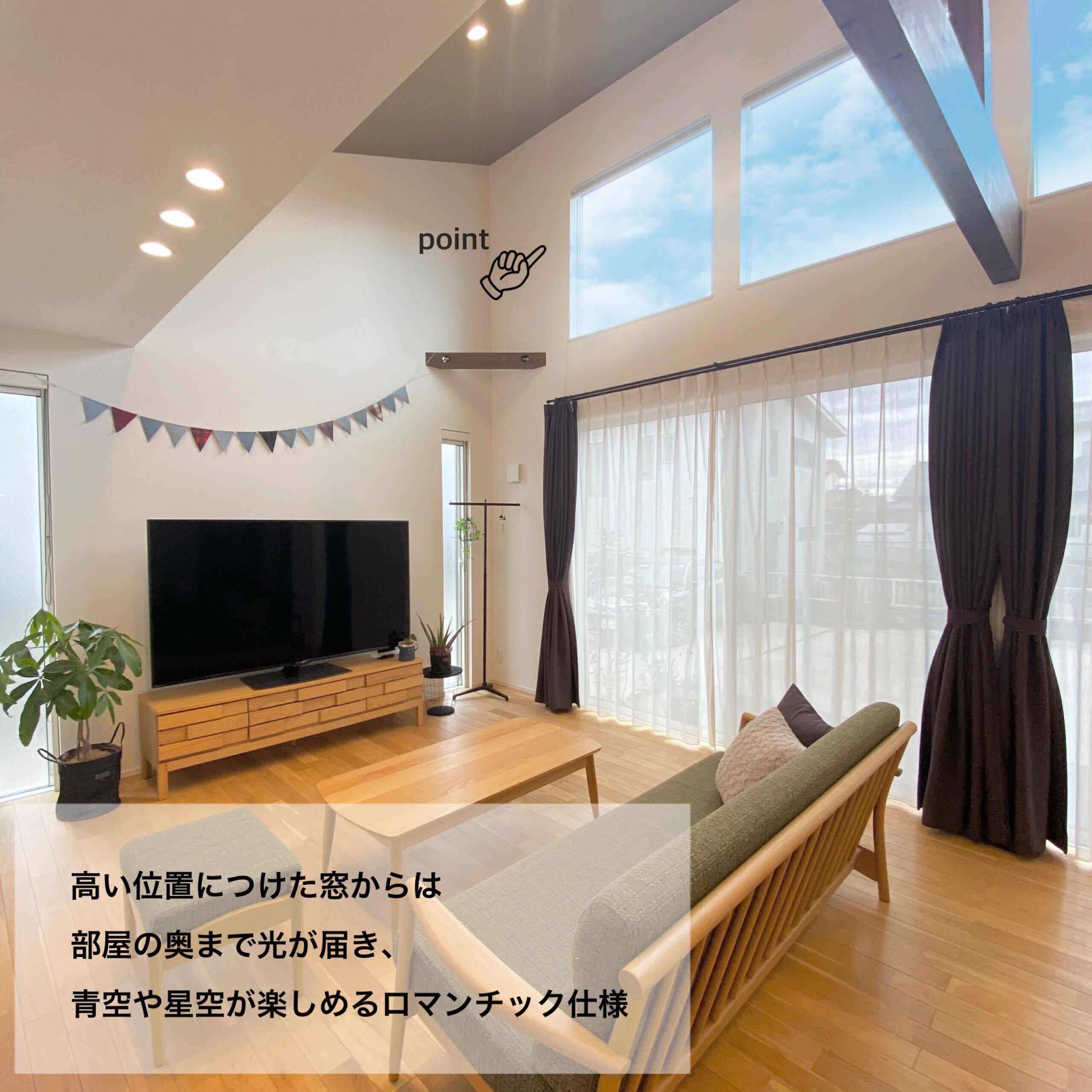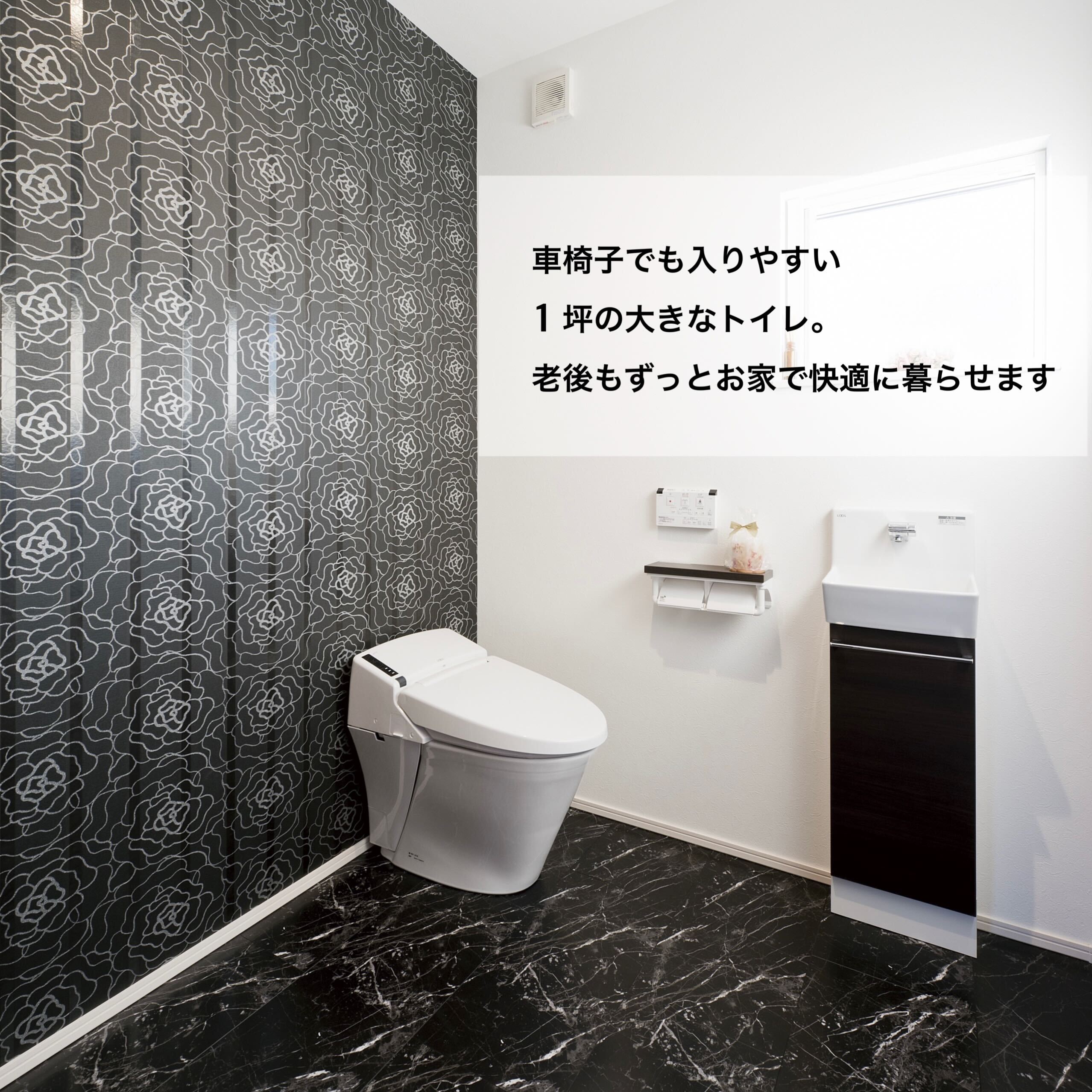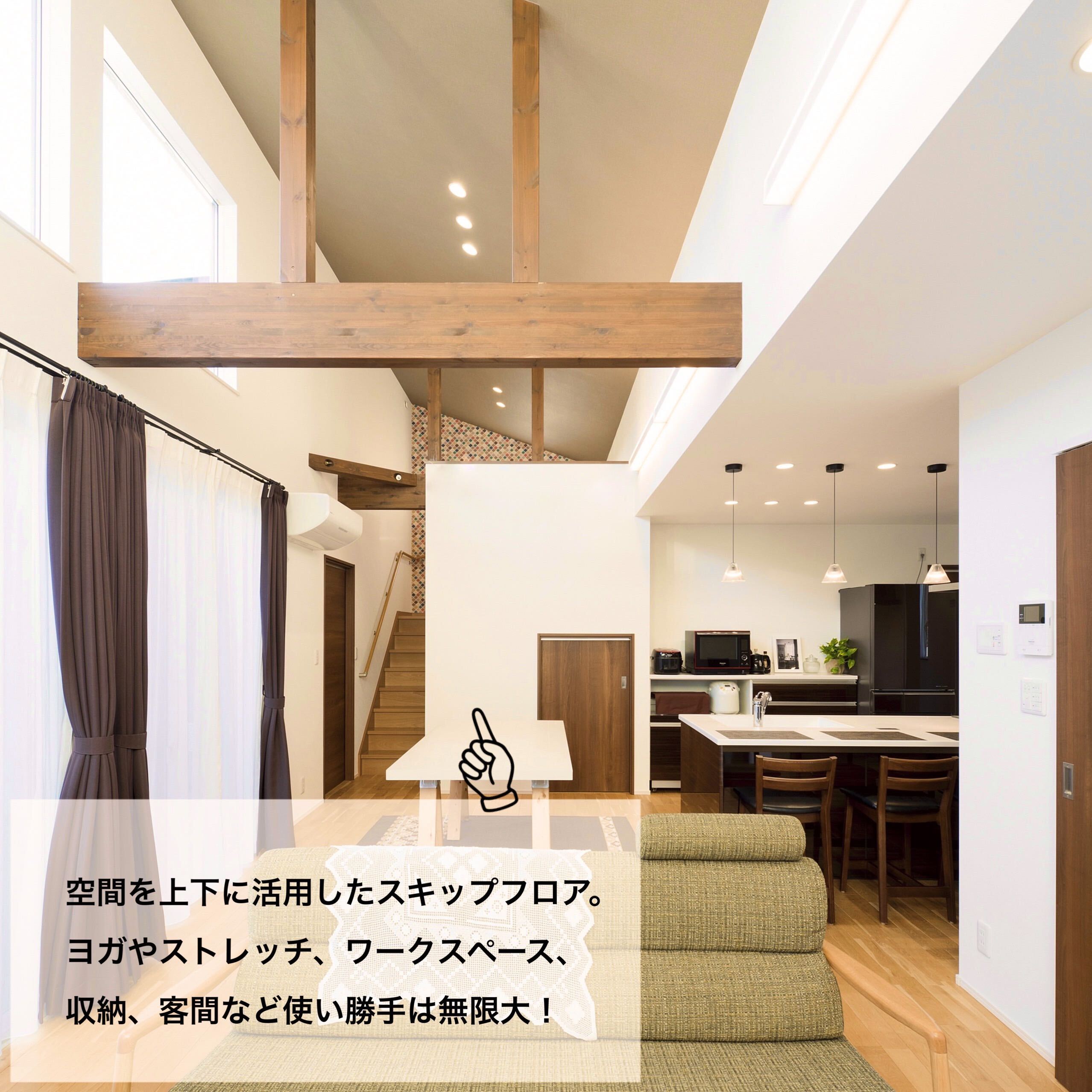 老後の暮らし方を意識し、お風呂は出入りがしやすい引き戸の3枚扉にしたりトイレは大きな1坪にしたり部屋はすべて掃除がラクな吊り戸にしたりとバリアフリーで暮らしやすい工夫がたっぷりのT様邸。空間を上下に使ったスキップフロアやプライベートばっちりのお庭ではBBQやプール、ランチや晩酌を楽しめます。また、みんなが集まるリビングは高い天井で開放感抜群。勾配を利用した高い位置の窓からは昼は青空、夜はロマンチックな星空が楽しめます。お孫さんが喜ぶ工夫がいっぱいで誕生日やクリスマス、お正月など、親戚一同集まって楽しく過ごせるお家です。