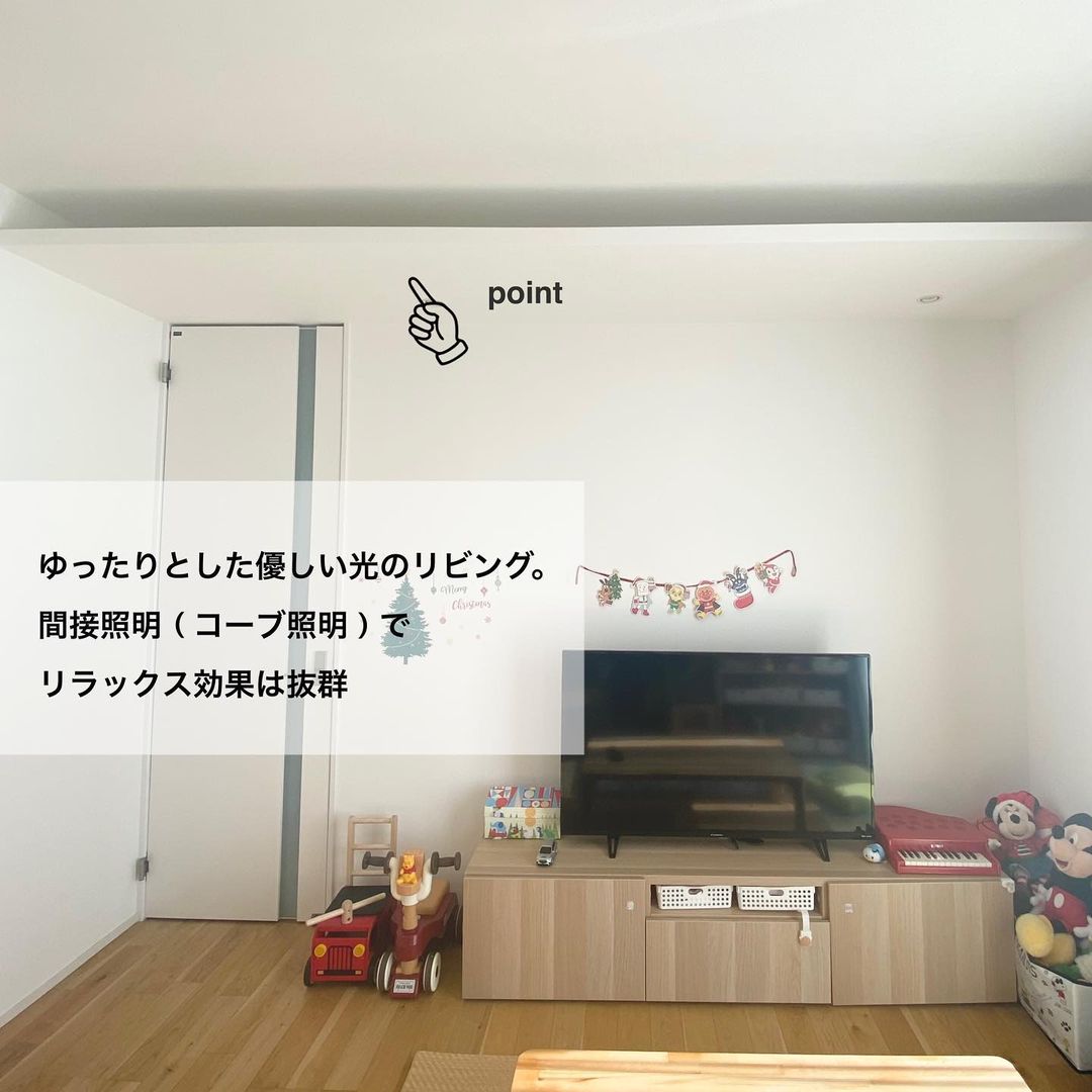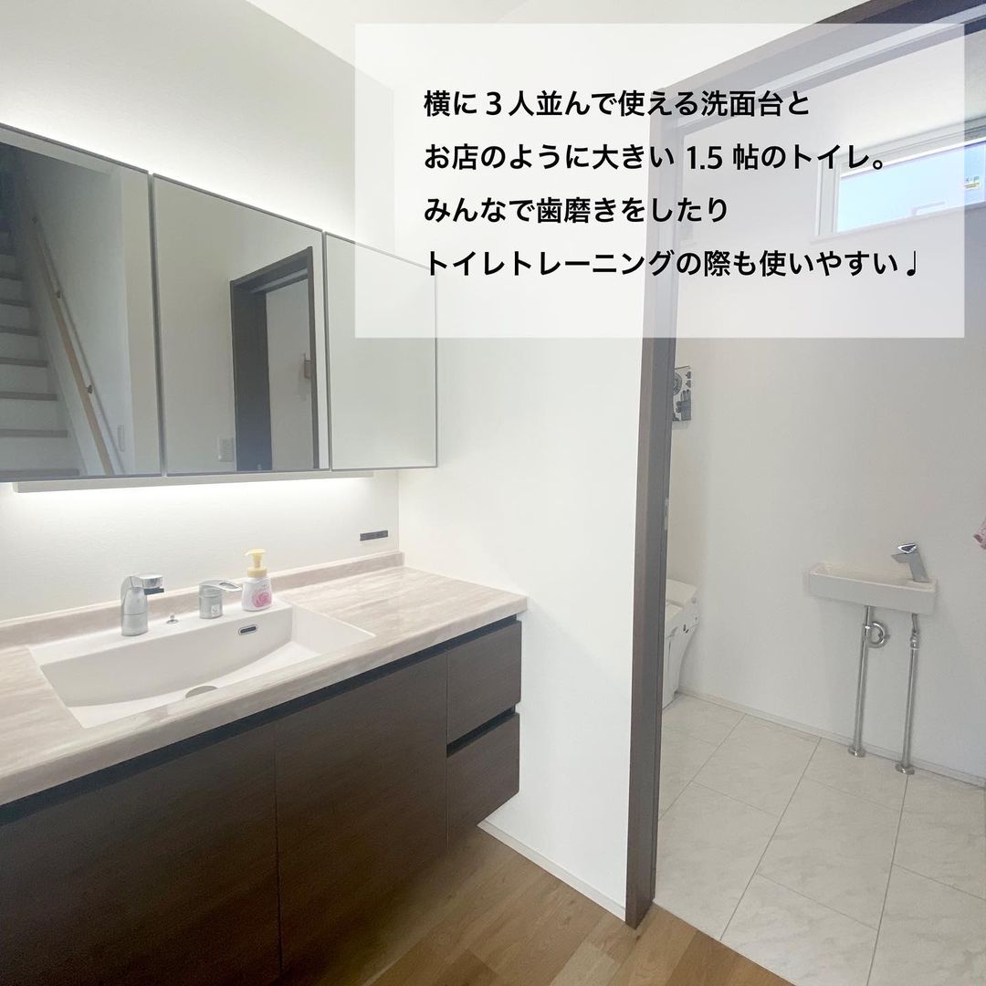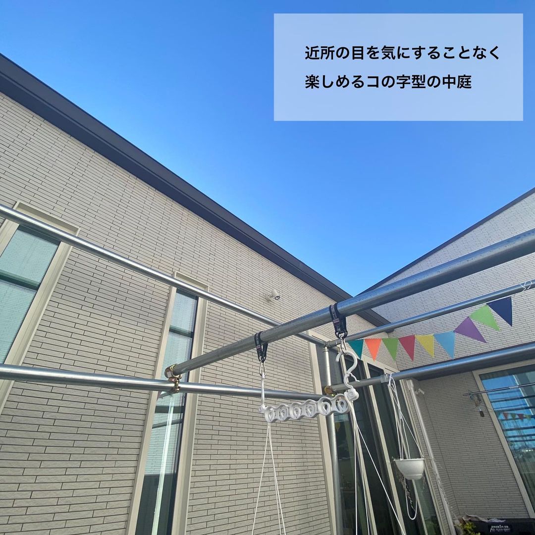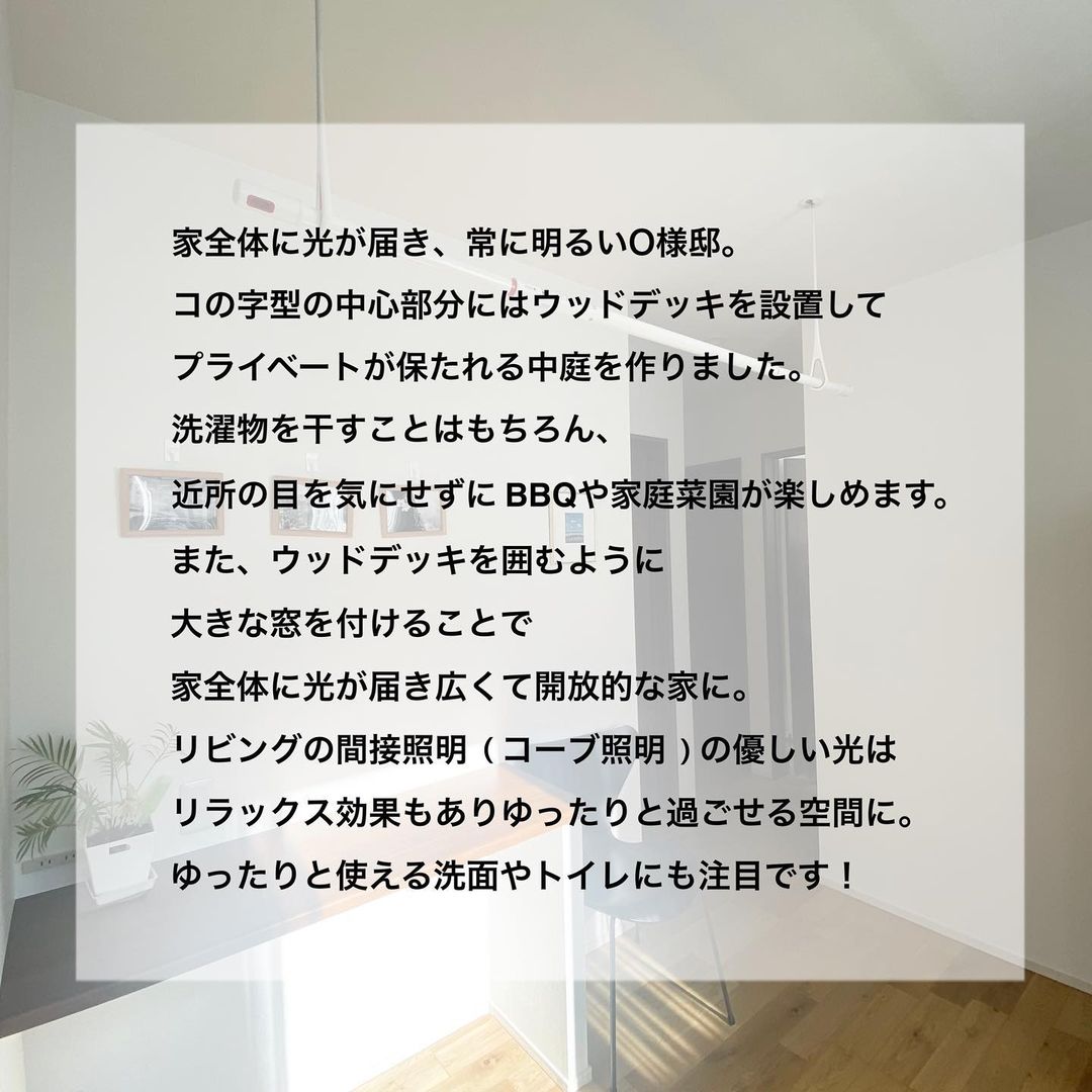 家全体に光が届き、常に明るいO様邸。コの字型の中心部分にはウッドデッキを設置して、プライベートが保たれる中庭を作りました。洗濯物を干すことはもちろん、近所の目を気にせずに BBQや家庭菜園が楽しめます。また、ウッドデッキを囲むように大きな窓を付けることで、家全体に光が届き広くて開放的な家に。リビングの間接照明(コーブ照明)の優しい光は、リラックス効果もありゆったりと過ごせる空間に。ゆったりと使える洗面やトイレにも注目です!