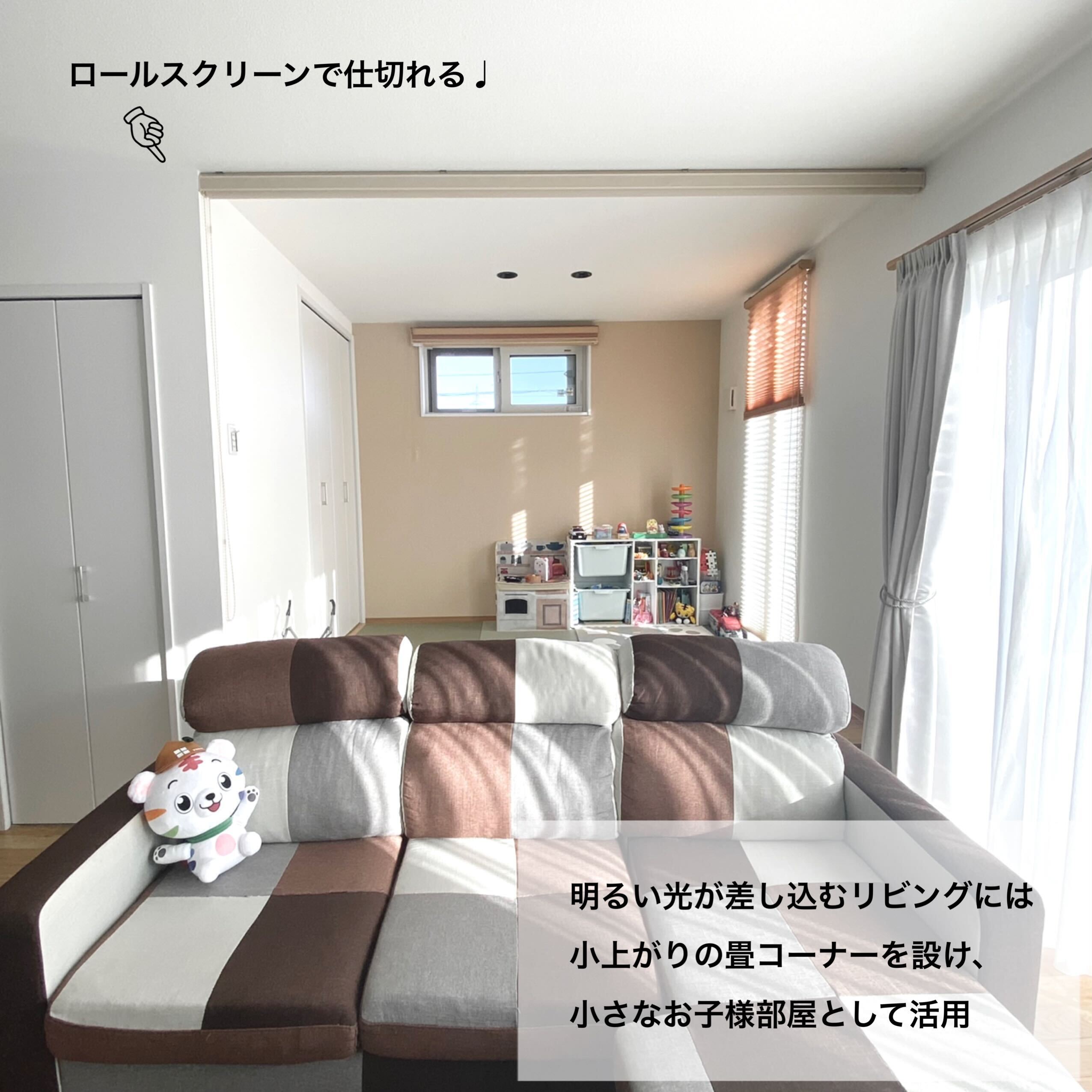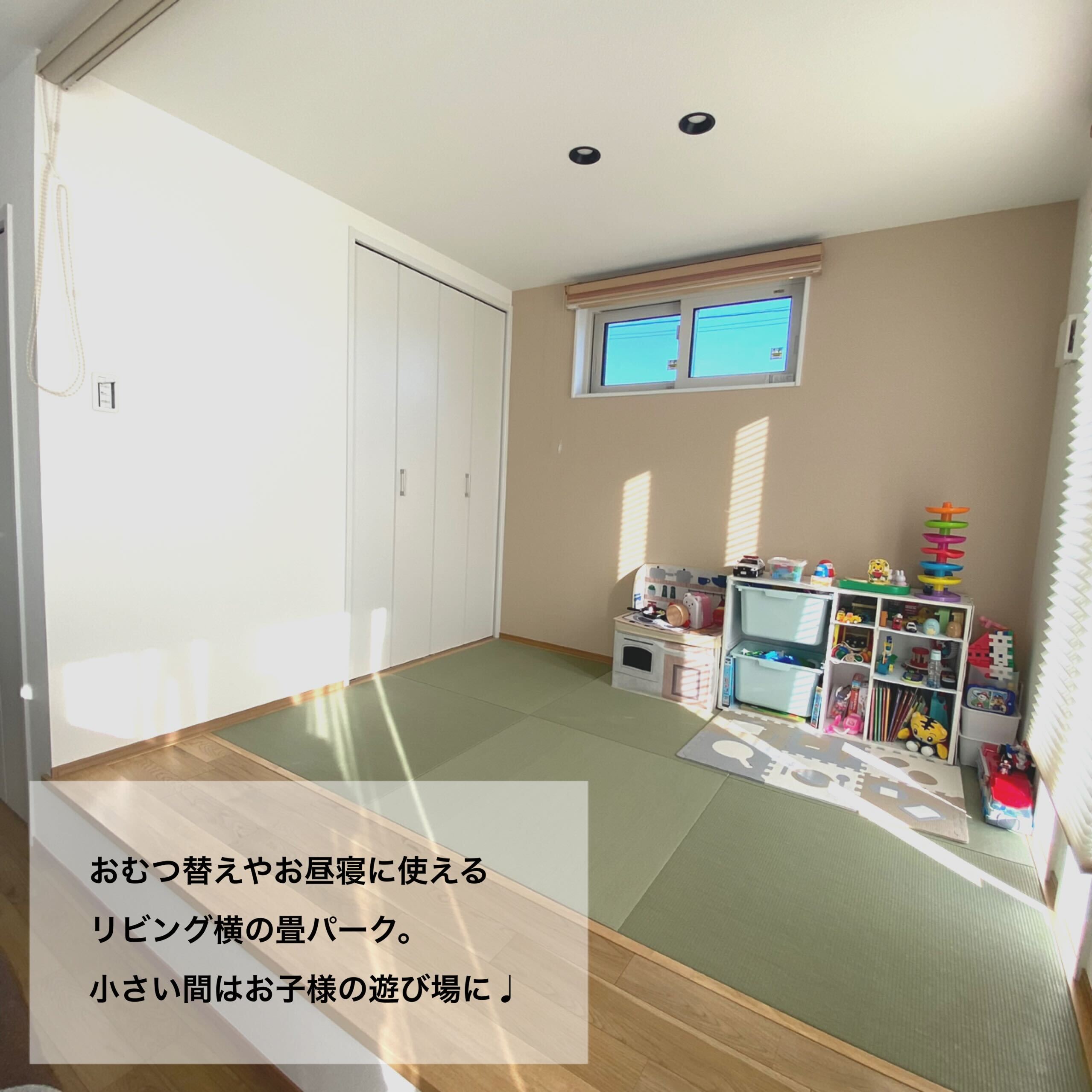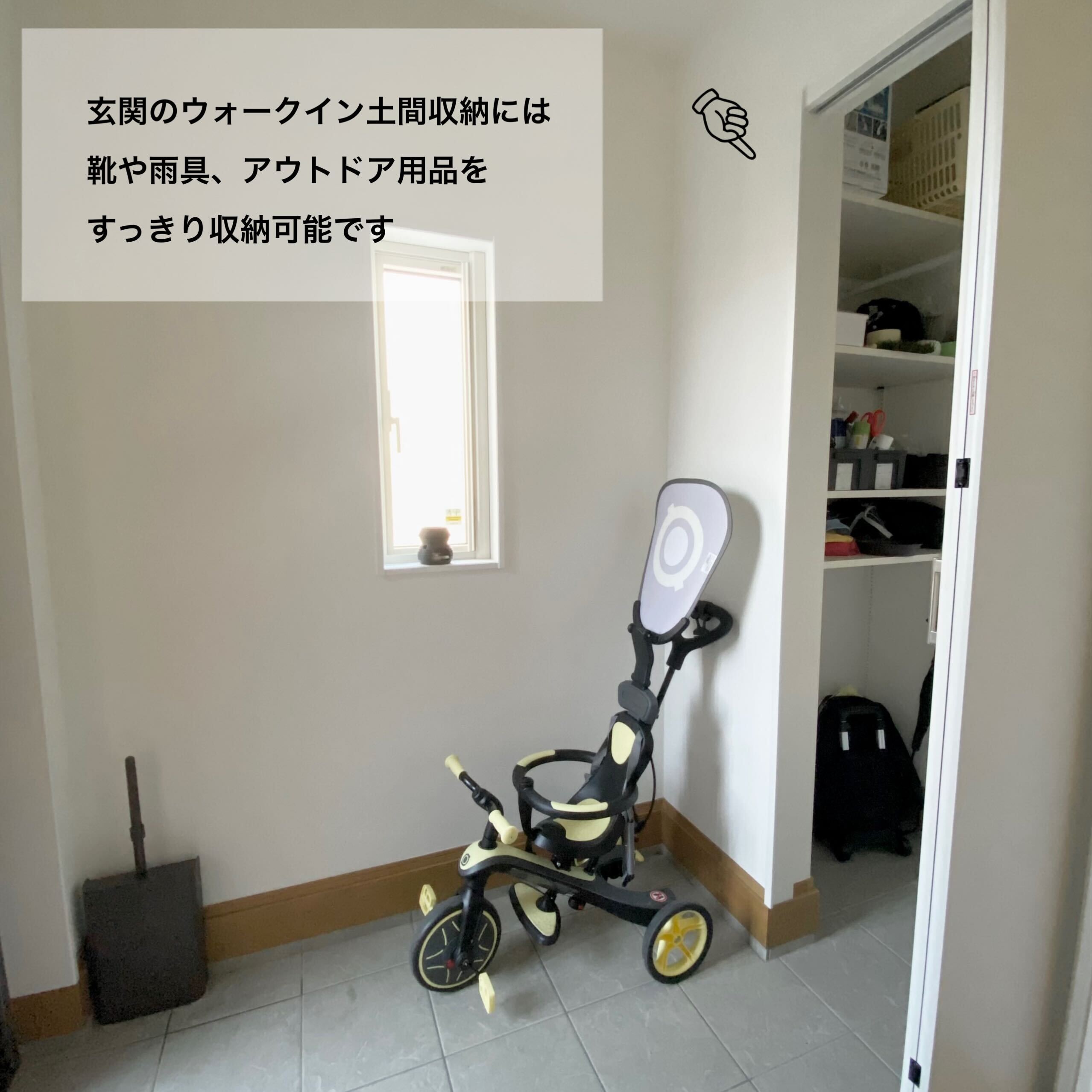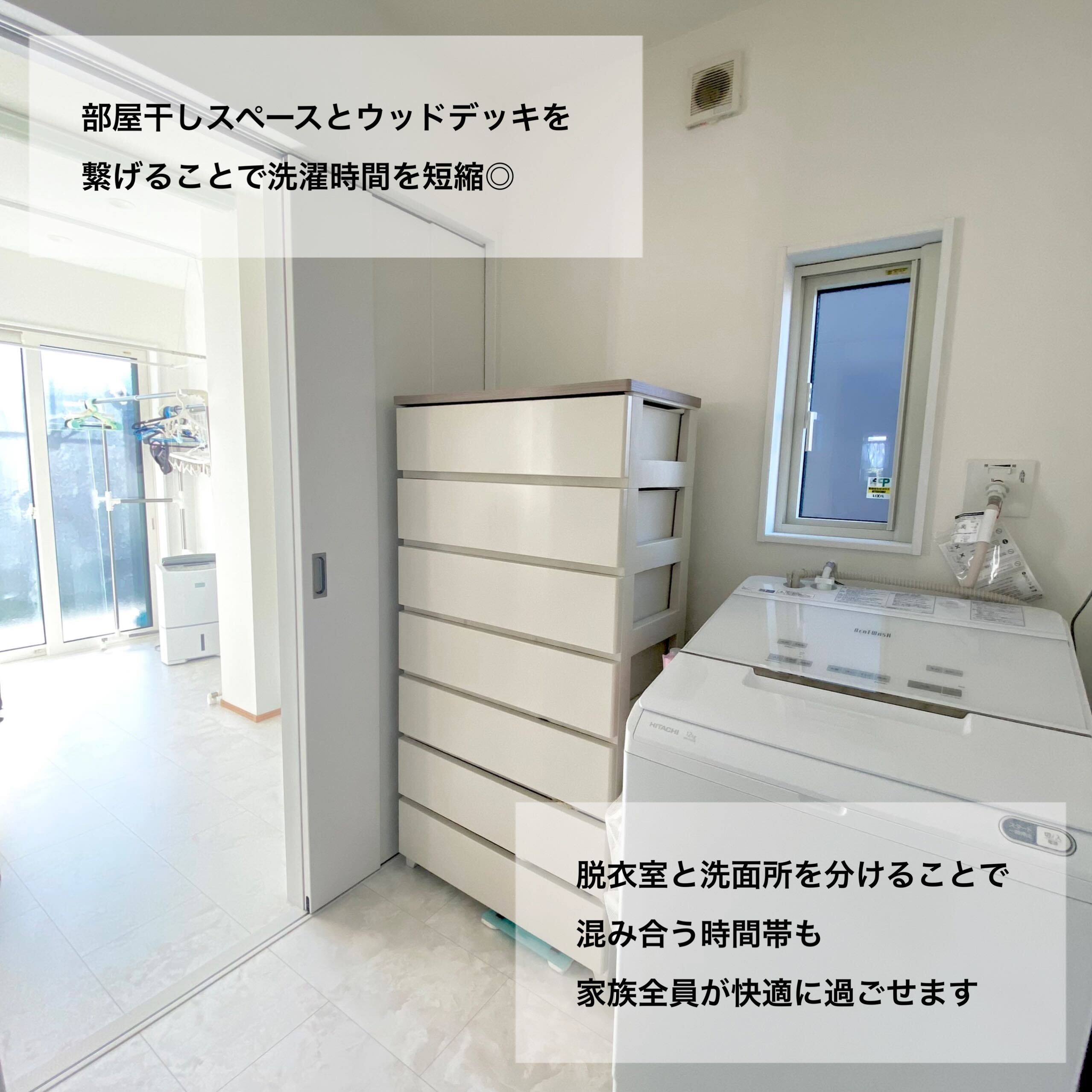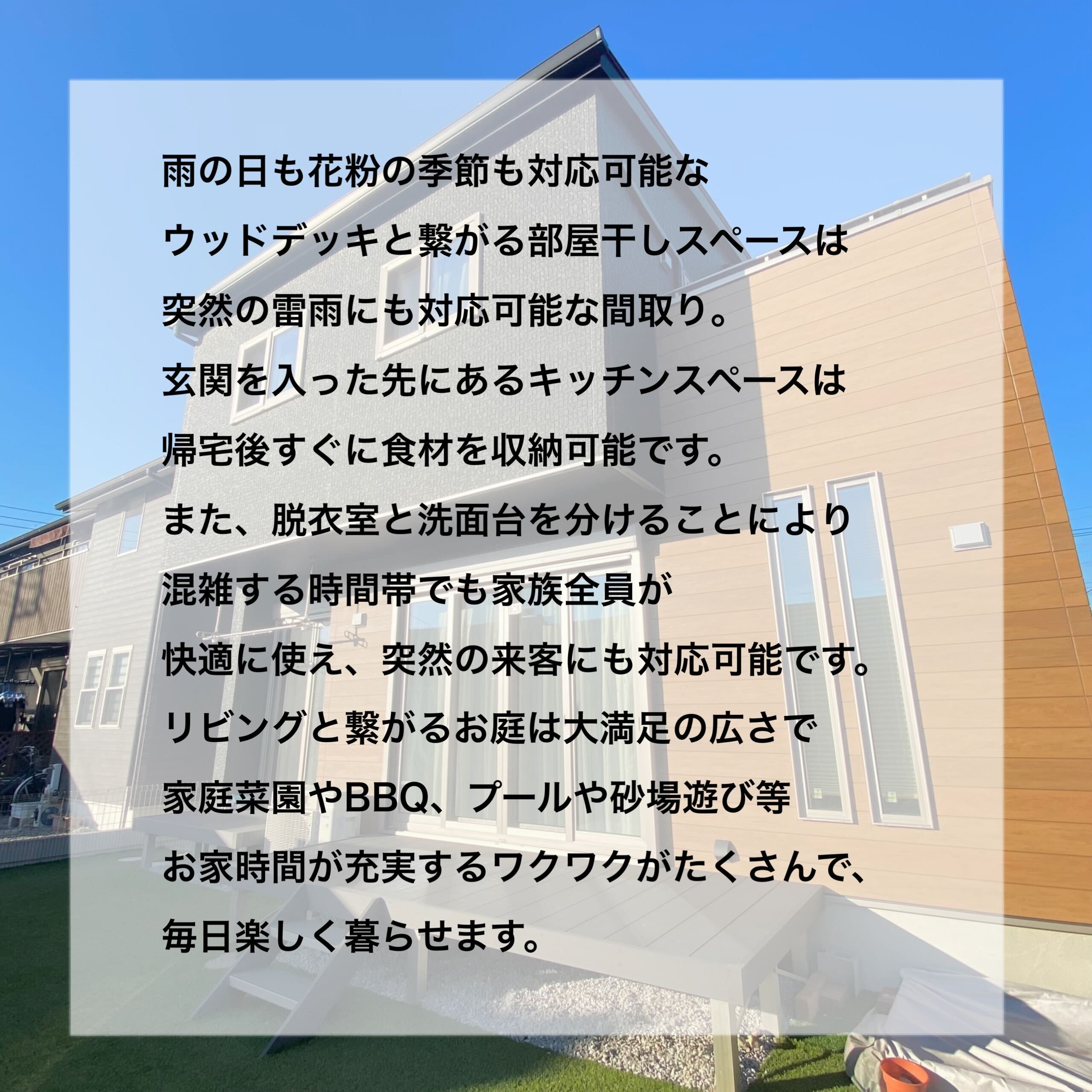 ウッドデッキと繋がる雨の日や花粉の季節に対応可能な部屋干しスペースは、突然の雷雨にも対応可能な間取り。玄関を入った先にあるキッチンスペースは帰宅後すぐに食材を収納可能です。また脱衣室と洗面台を分けることで混雑する時間帯でも家族全員が快適に使え、突然の来客にも対応が可能です。リビングと繋がるお庭は大満足の広さで家庭菜園やBBQ、プールや砂場遊び等お家時間が充実するワクワクがたくさんで、毎日が楽しく暮らせるお家です。