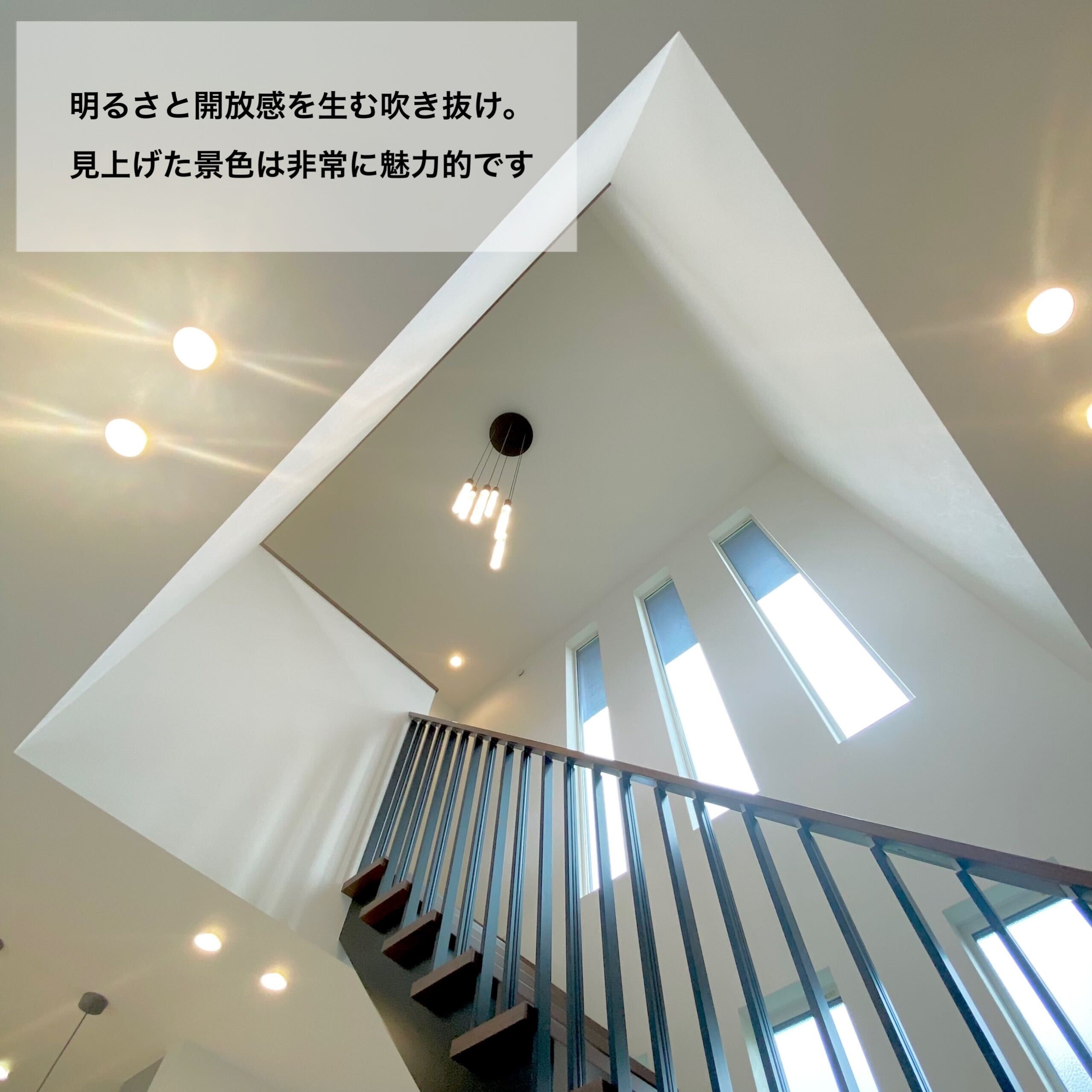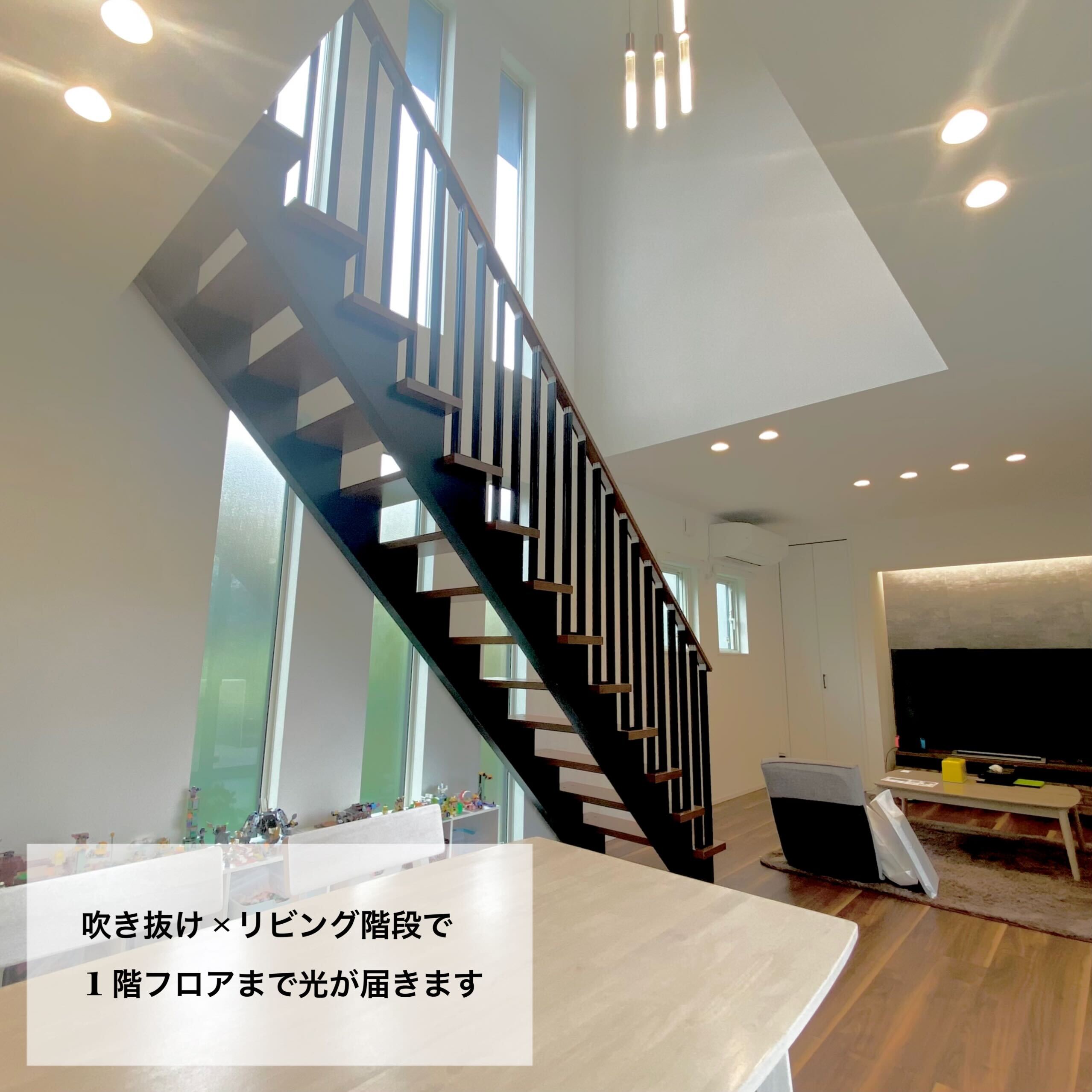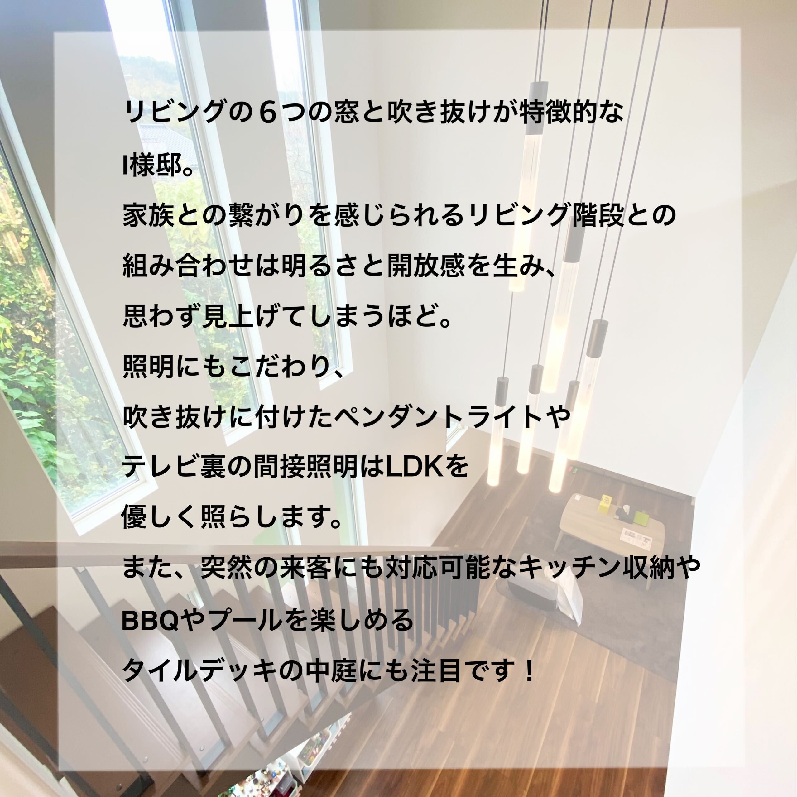 リビングの6つの大きな窓と吹き抜けが特徴的なI様邸。家族との繋がりを感じられるリビング階段と組み合わせ、思わず見上げてしまうほどの明るさと開放感!照明にもこだわり、吹き抜けに付けたペンダントライトやテレビ裏の間接照明はLDKを優しく照らします。また、突然の来客にも対応可能なキッチン収納、BBQやプールを楽しめるタイルデッキの中庭にも注目です!
