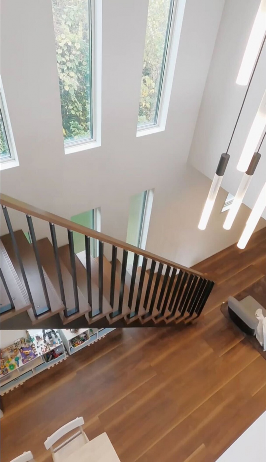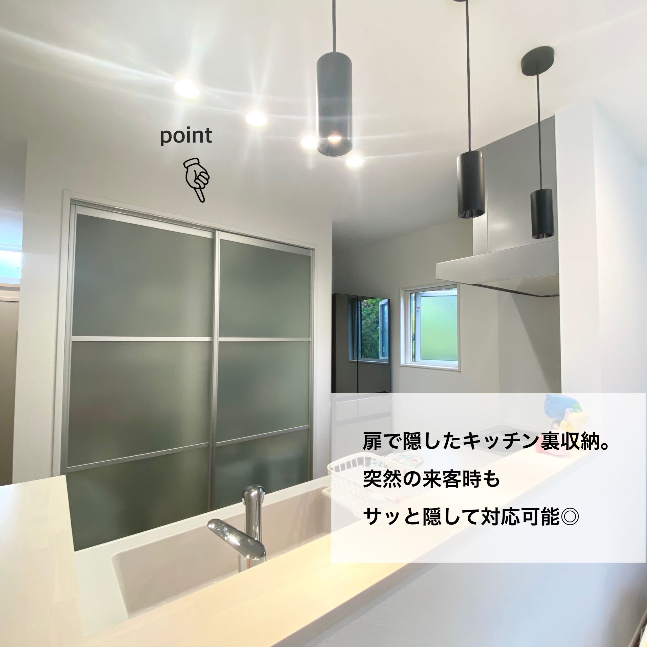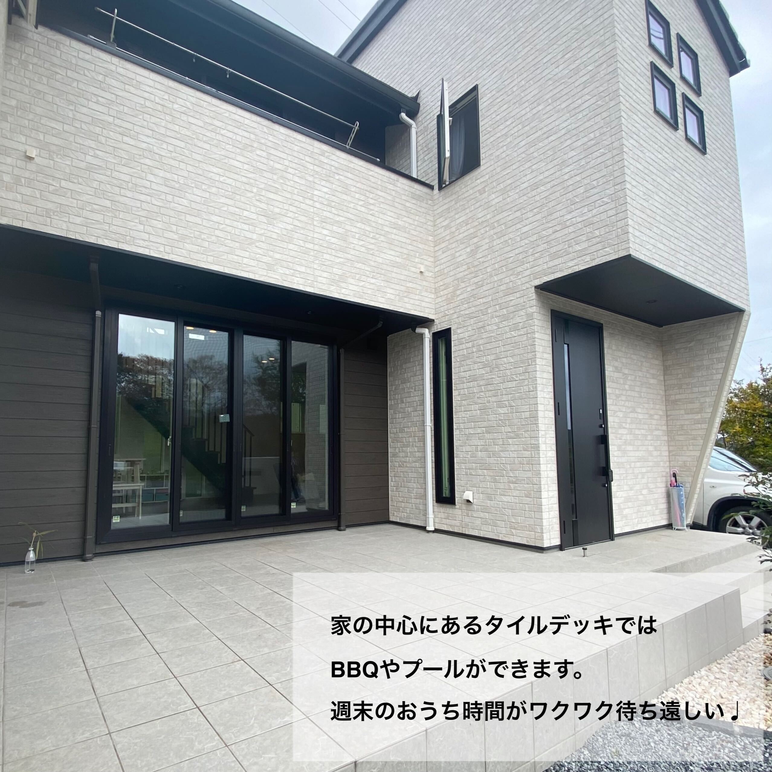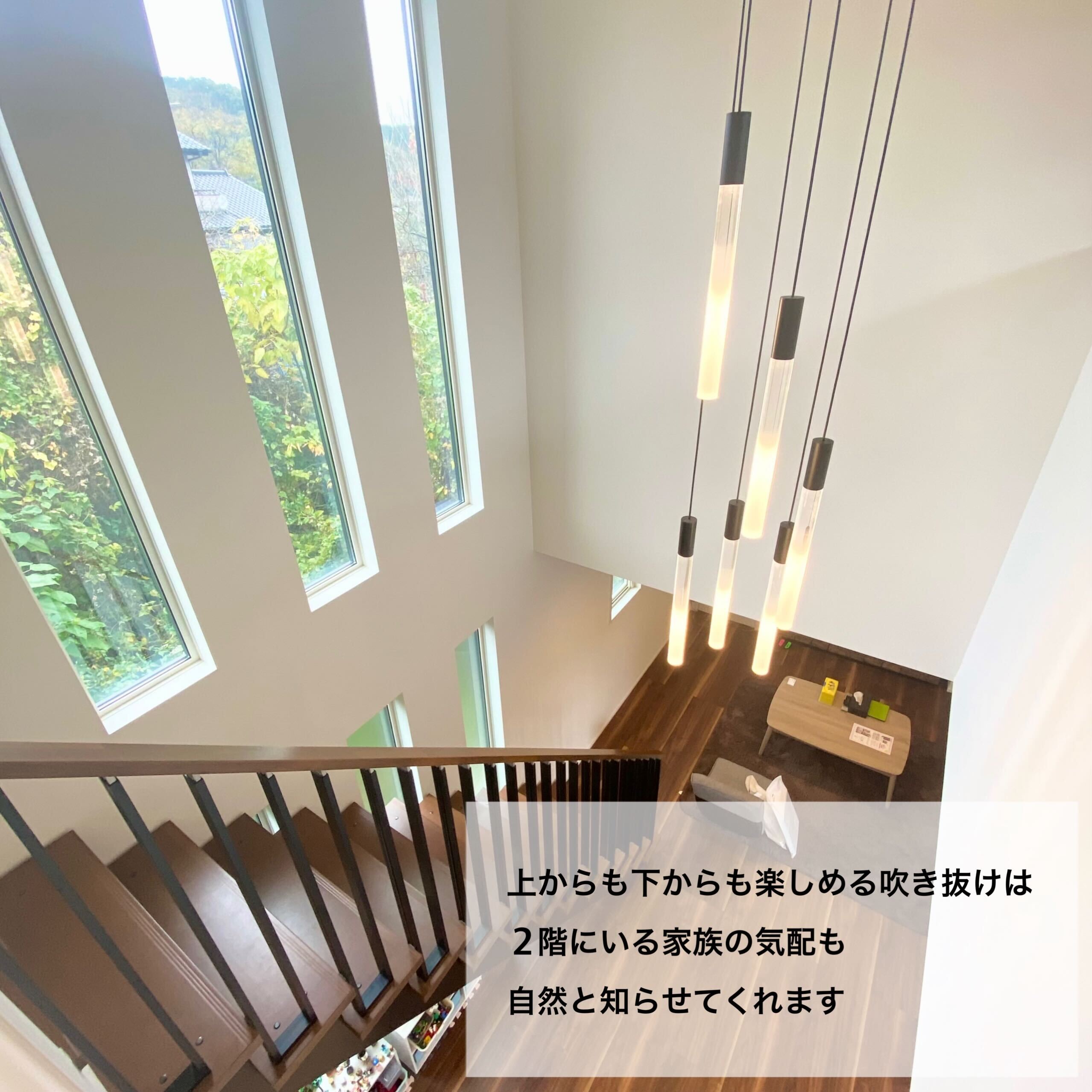 リビングの6つの大きな窓と吹き抜けが特徴的なI様邸。家族との繋がりを感じられるリビング階段と組み合わせ、思わず見上げてしまうほどの明るさと開放感!照明にもこだわり、吹き抜けに付けたペンダントライトやテレビ裏の間接照明はLDKを優しく照らします。また、突然の来客にも対応可能なキッチン収納、BBQやプールを楽しめるタイルデッキの中庭にも注目です!