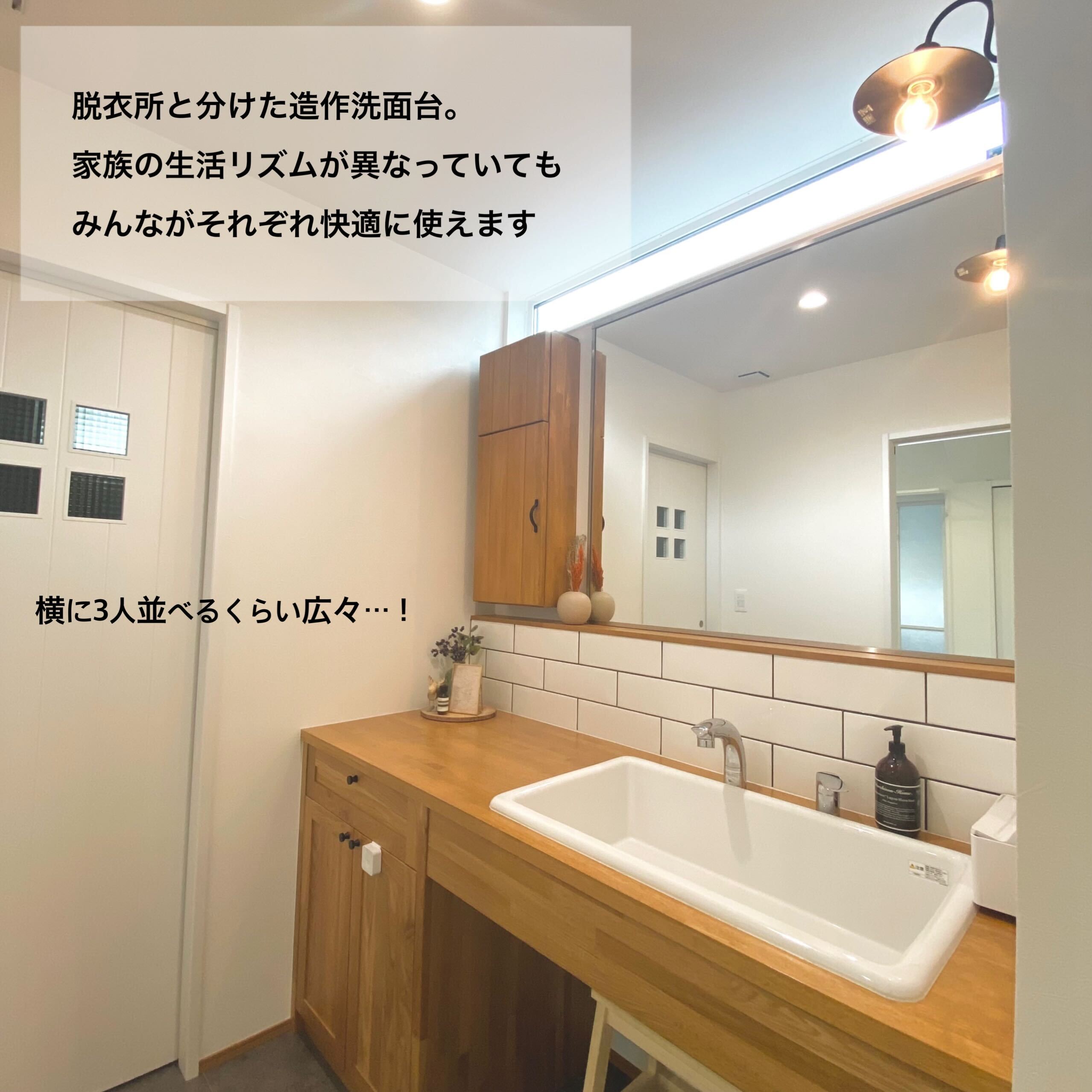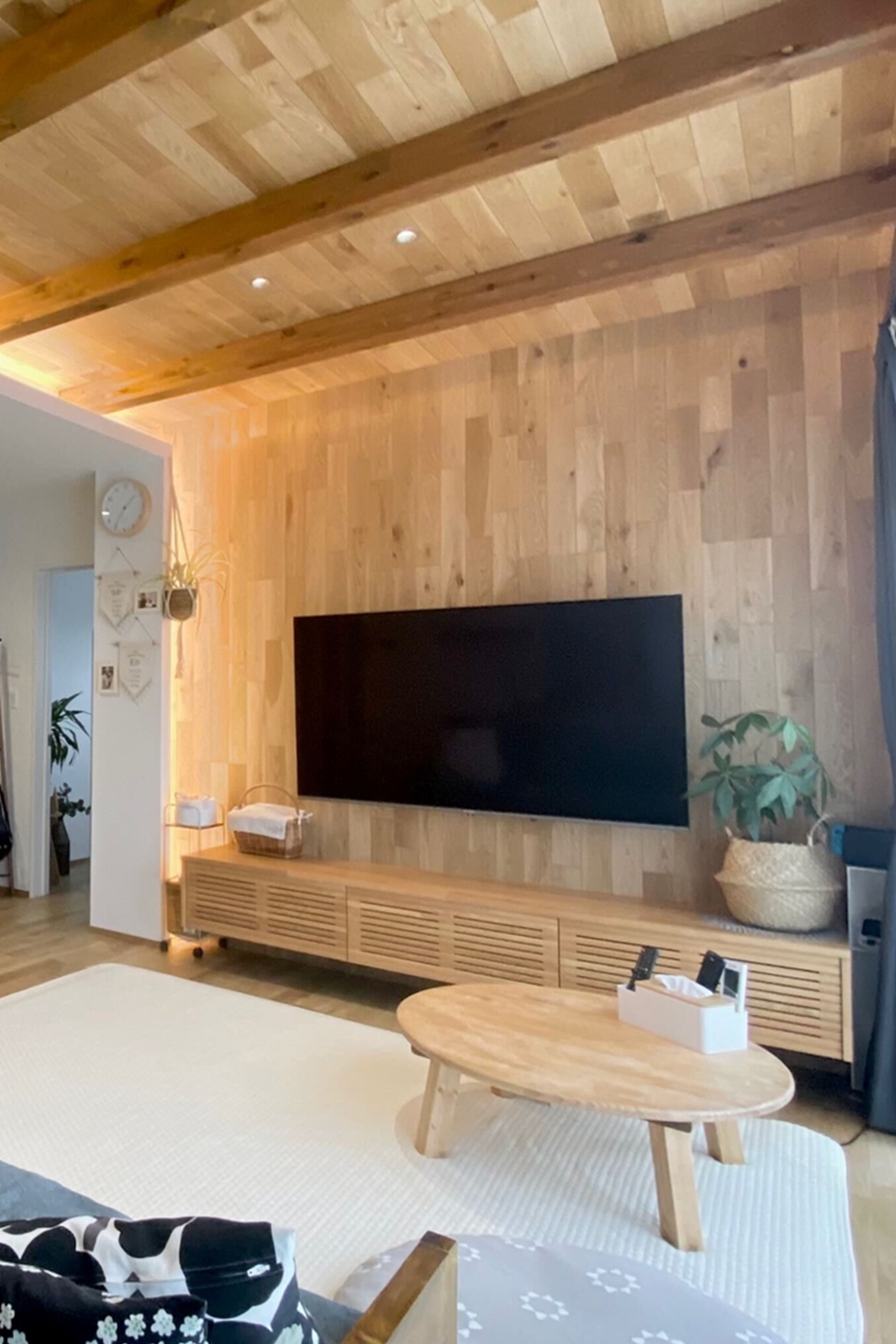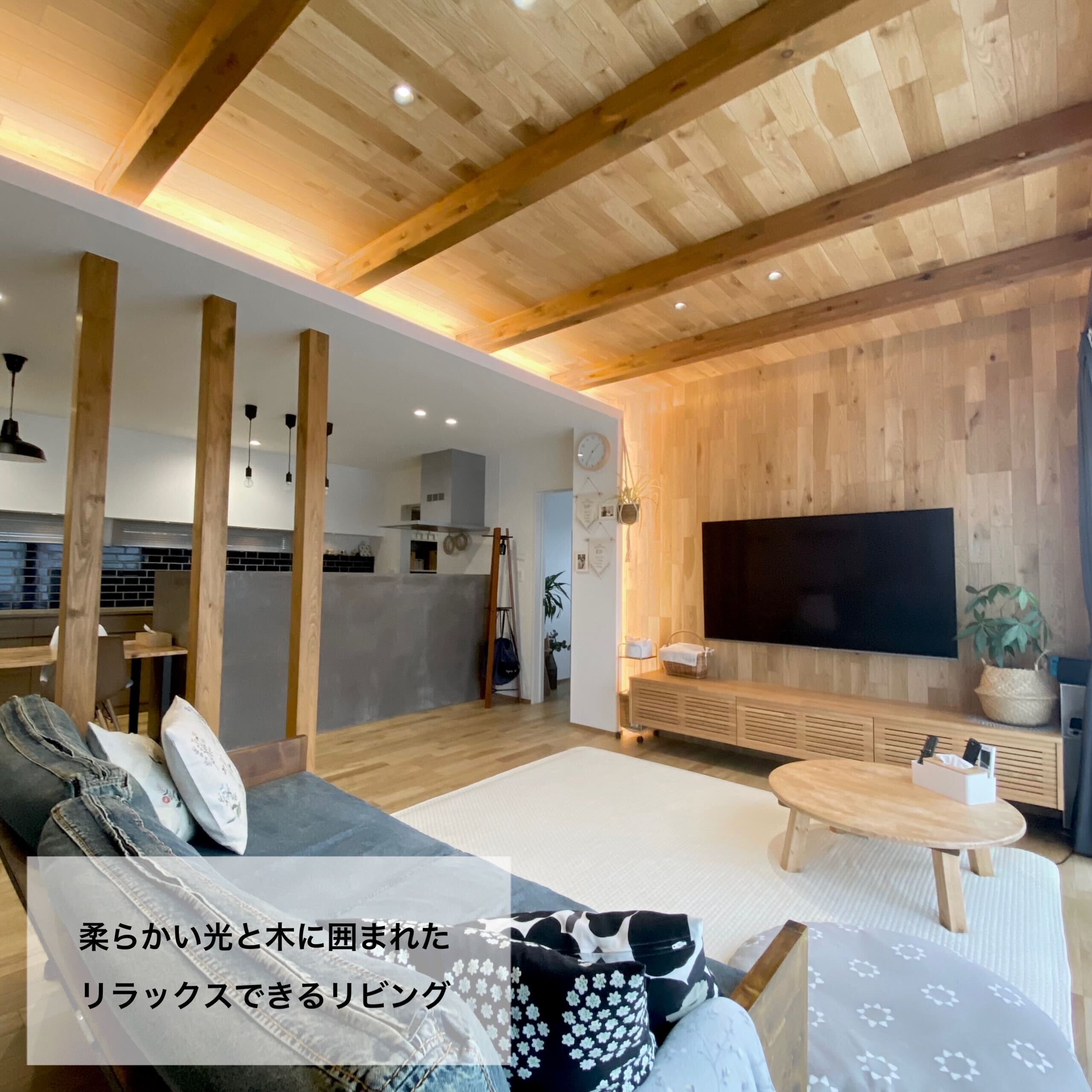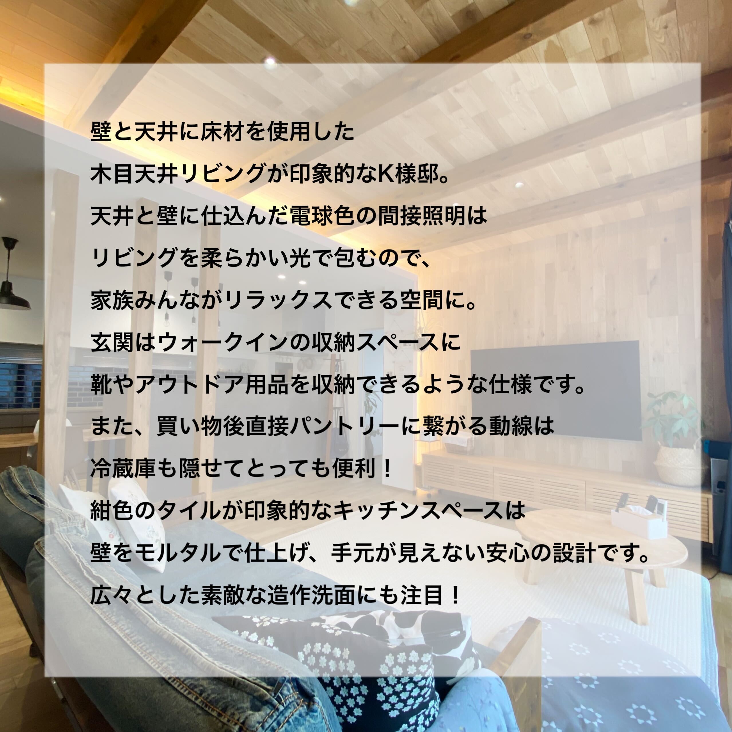 壁と天井に床材を使用した木目天井リビングが印象的なK様邸。天井と壁に仕込んだ電球色の間接照明はリビングを柔らかい光で包みこみ、家族みんながリラックスできる空間に。玄関はウォークインの収納スペースに靴やアウトドア用品を収納できるような仕様です。また買い物後に直接パントリーに繋がる動線は、冷蔵庫も隠せてとっても便利!紺色のタイルが印象的なキッチンスペースは壁をモルタルで仕上げ、手元が見えない安心の設計です。広々とした素敵な造作洗面にも注目です!