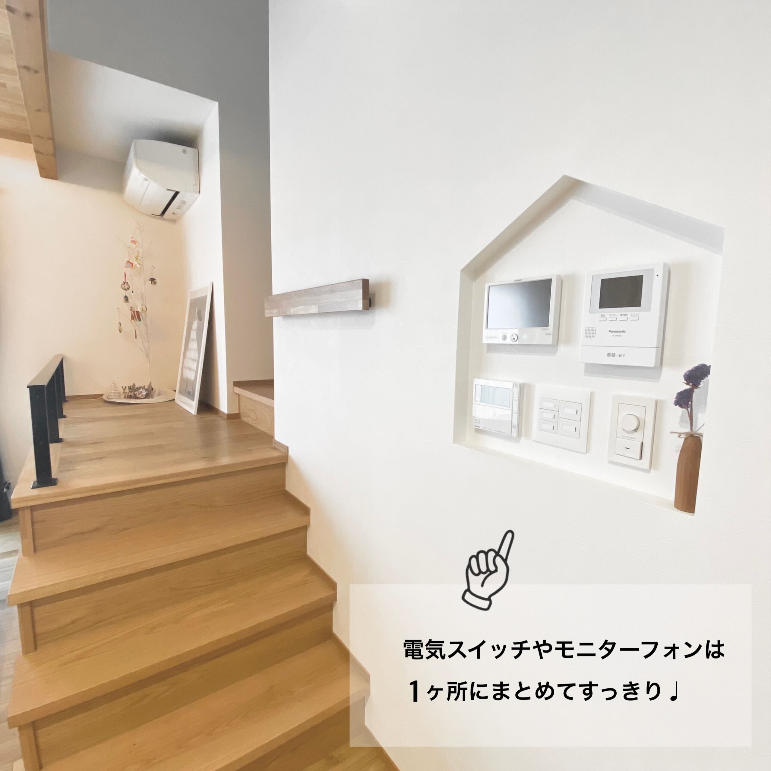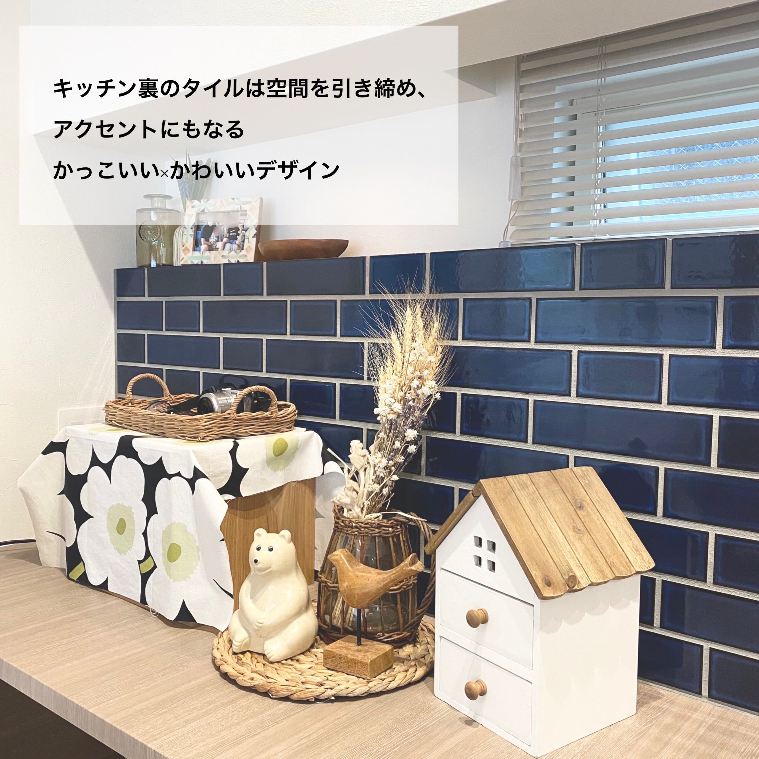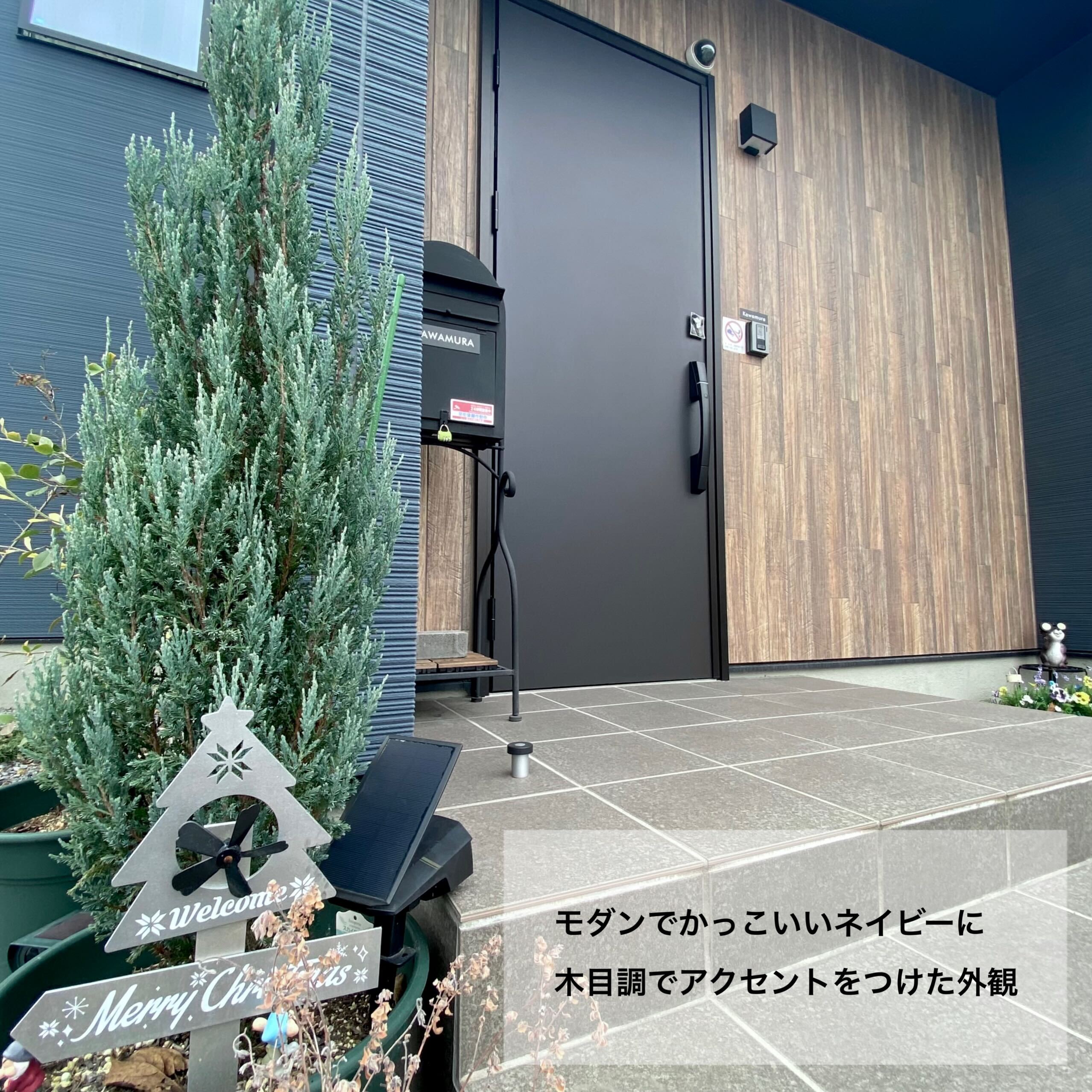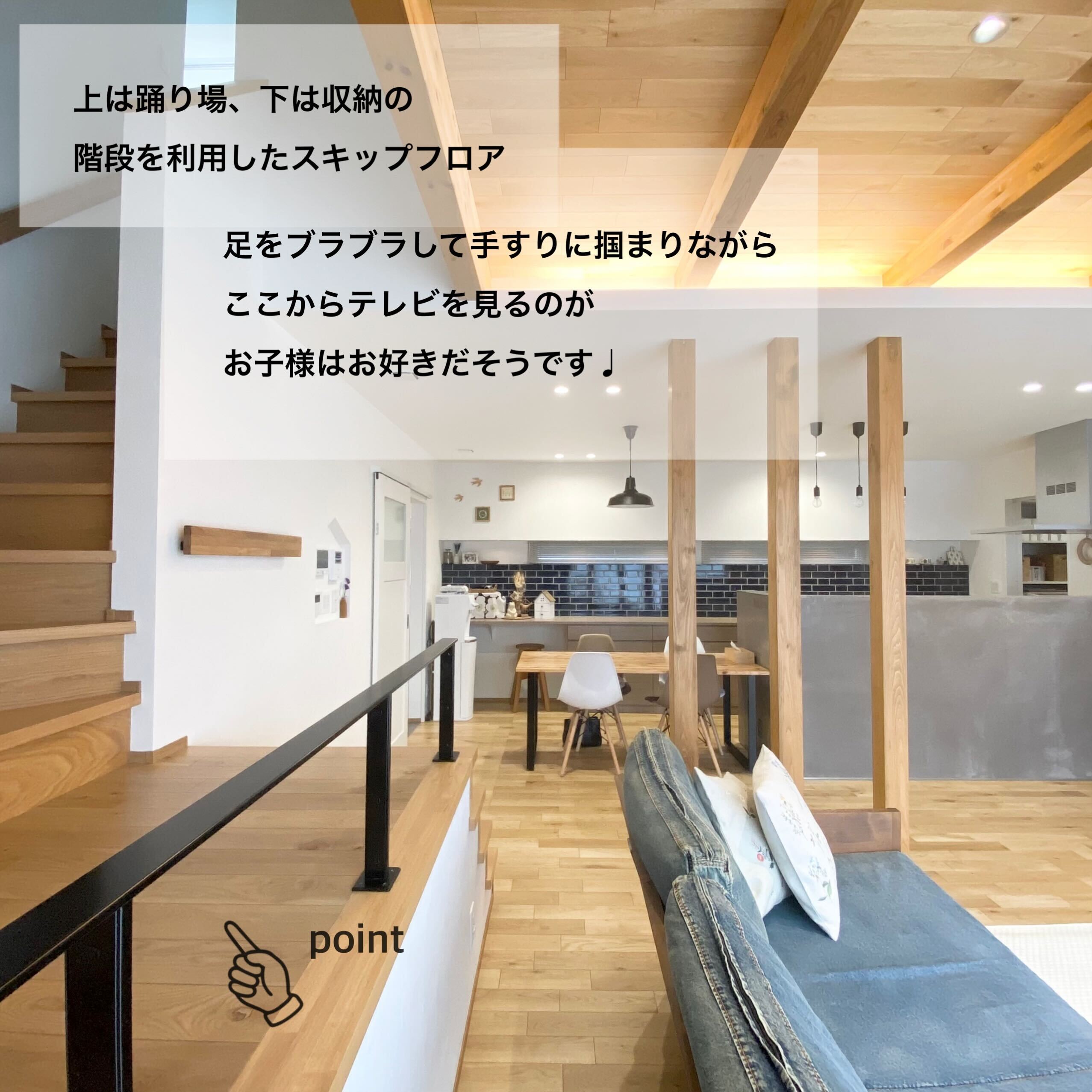 壁と天井に床材を使用した木目天井リビングが印象的なK様邸。天井と壁に仕込んだ電球色の間接照明はリビングを柔らかい光で包みこみ、家族みんながリラックスできる空間に。玄関はウォークインの収納スペースに靴やアウトドア用品を収納できるような仕様です。また買い物後に直接パントリーに繋がる動線は、冷蔵庫も隠せてとっても便利!紺色のタイルが印象的なキッチンスペースは壁をモルタルで仕上げ、手元が見えない安心の設計です。広々とした素敵な造作洗面にも注目です!