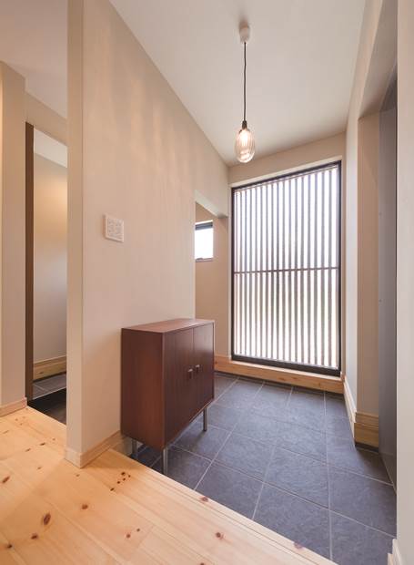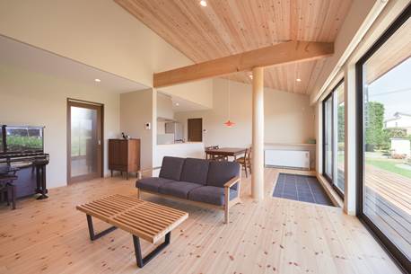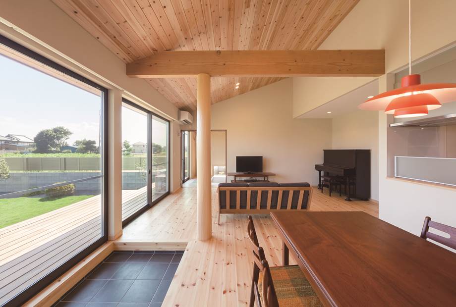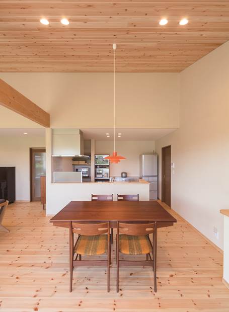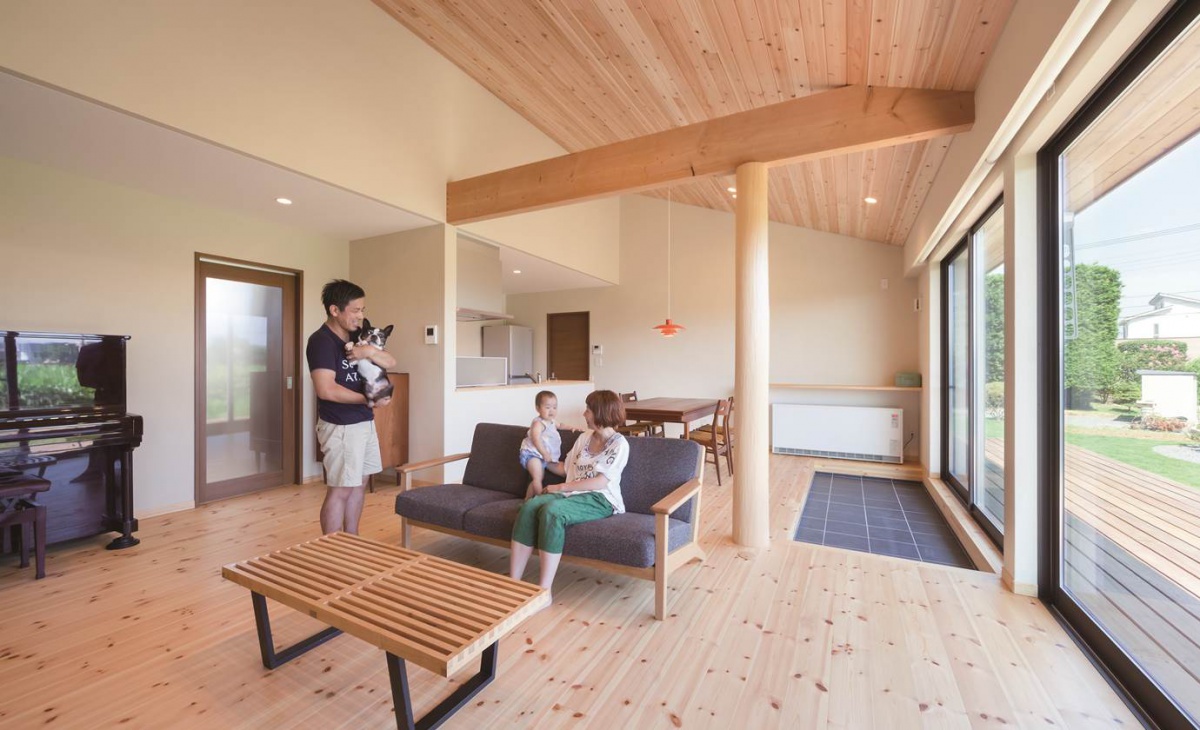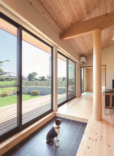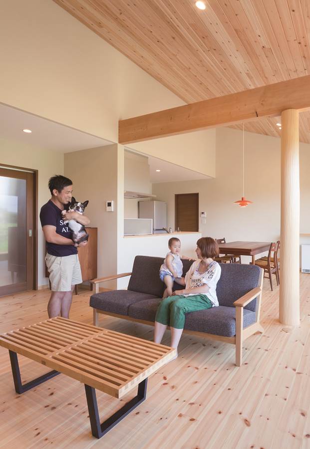 約26畳の広さを持つLDK。パイン材の床、珪藻土の壁など自然素材の心地よい空間だ。リビングで目を引く土間。普段は愛犬の寛ぎの場。美容師の夫人に土間で髪を切ることもあるそう。「外と内がつながる空間の感じがいいですね」とYさん。