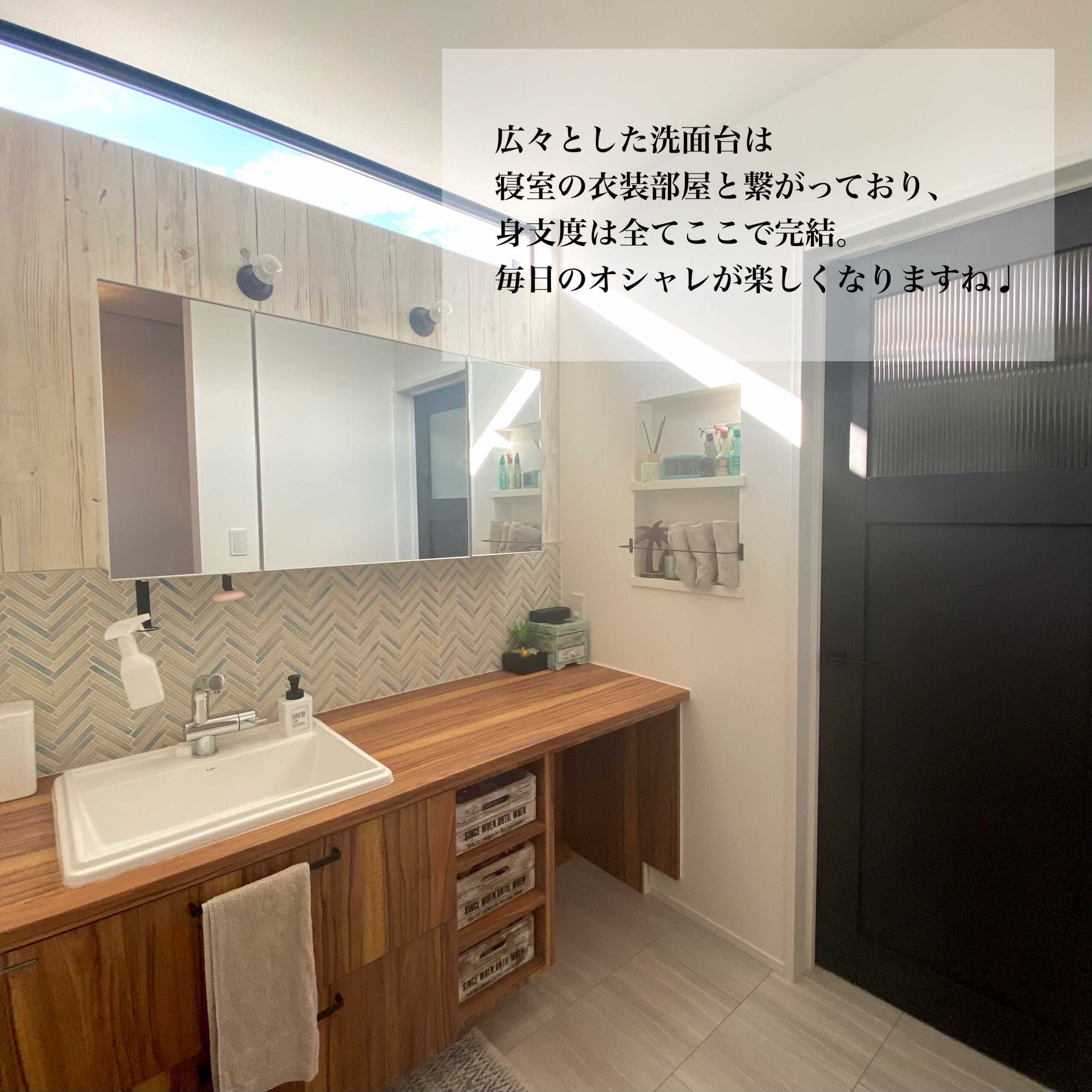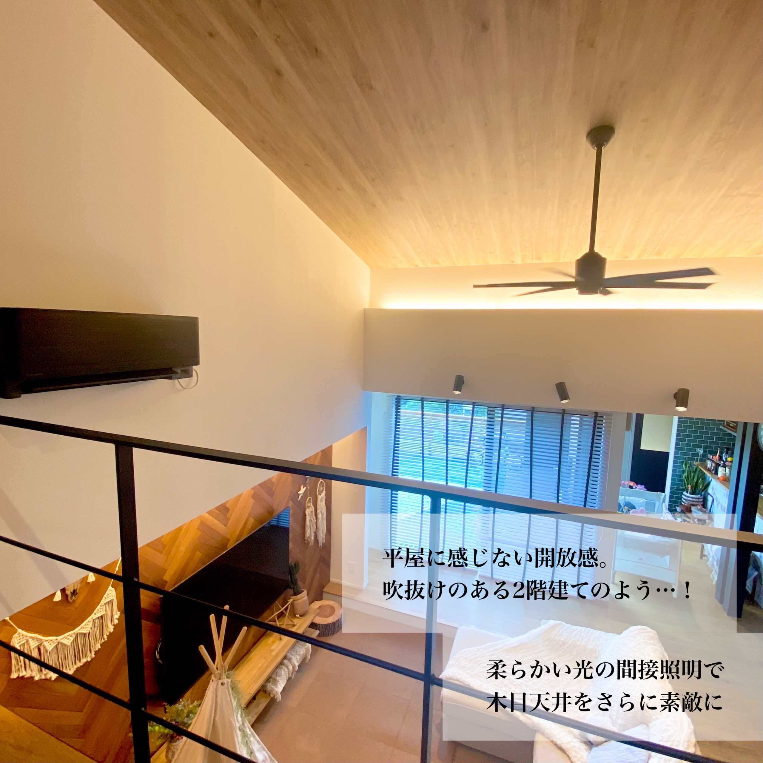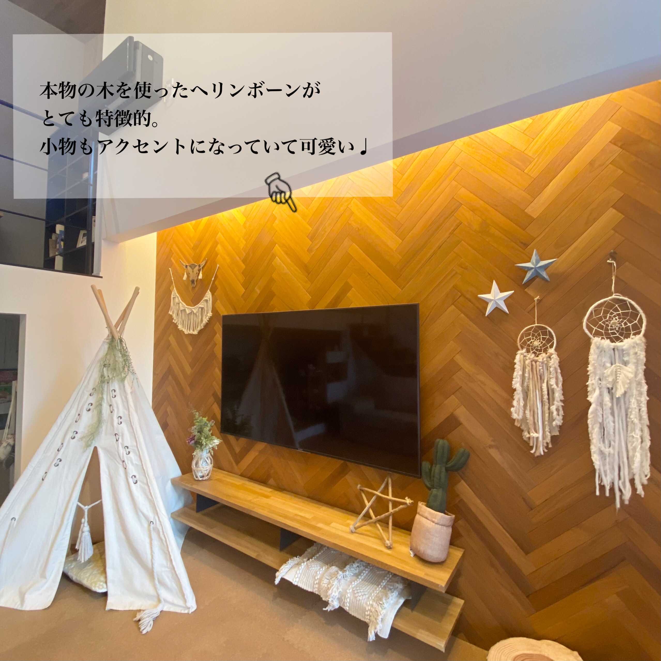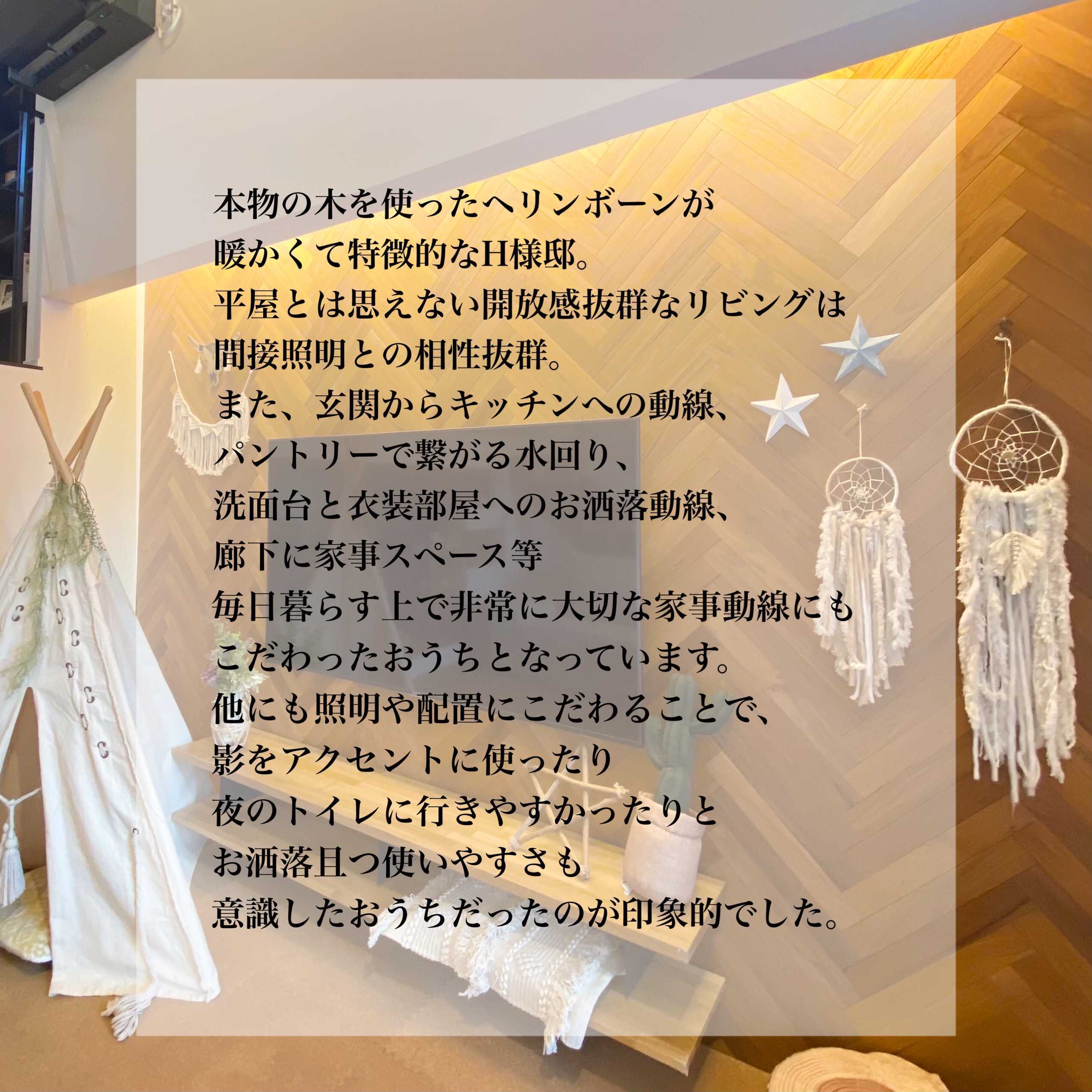 本物の木を使ったヘリンボーンが暖かくて特徴的なH様邸。平屋とは思えない開放感抜群なリビングは間接照明との相性抜群。また玄関からキッチンへの動線、パントリーで繋がる水回り、洗面台と衣装部屋への動線、廊下に家事スペース等、毎日暮らす上で大切な家事動線にもこだわったお家です。他にも照明や配置にこだわることで、影をアクセントに使ったり夜のトイレに行きやすかったりとお洒落且つ使いやすさも意識したお家です。
