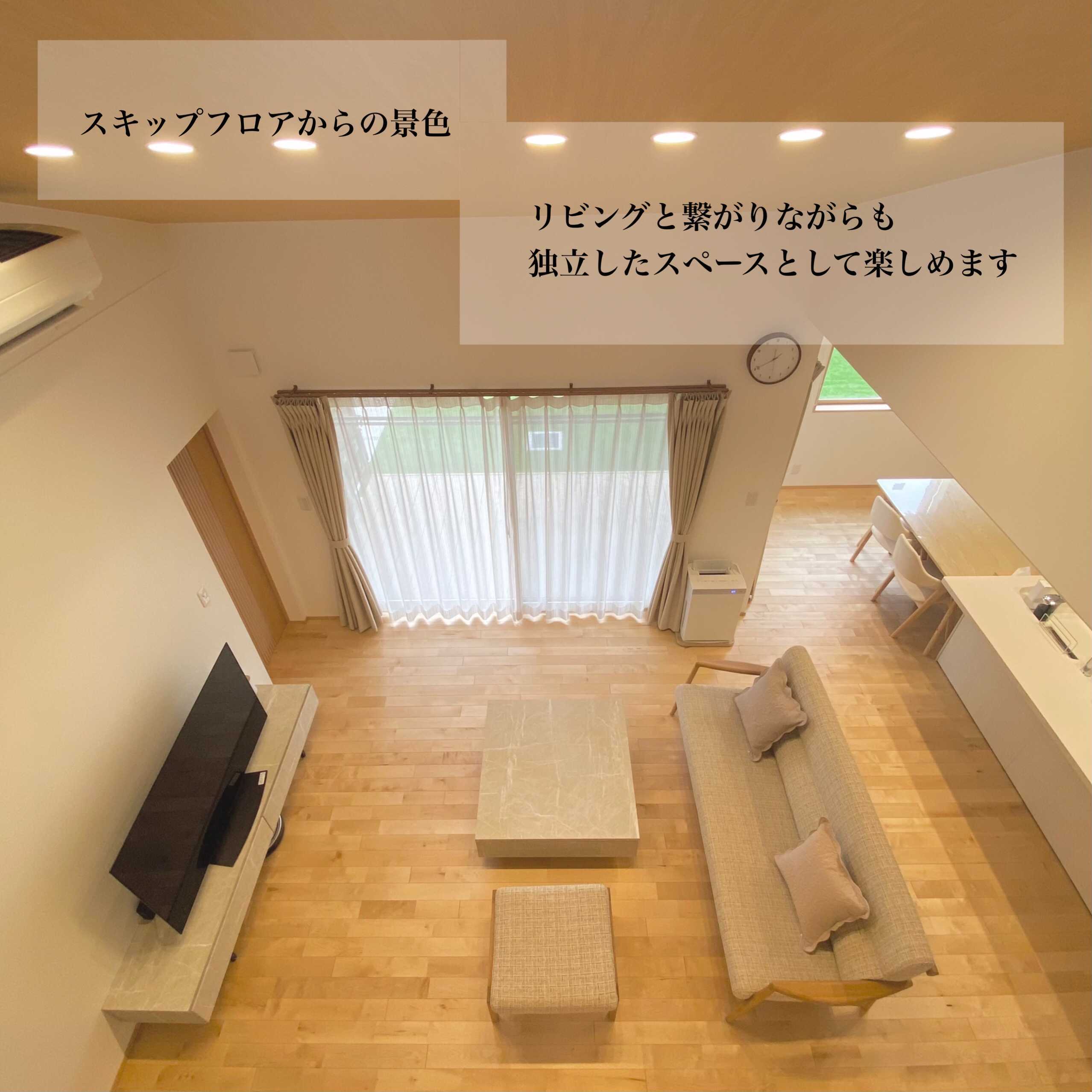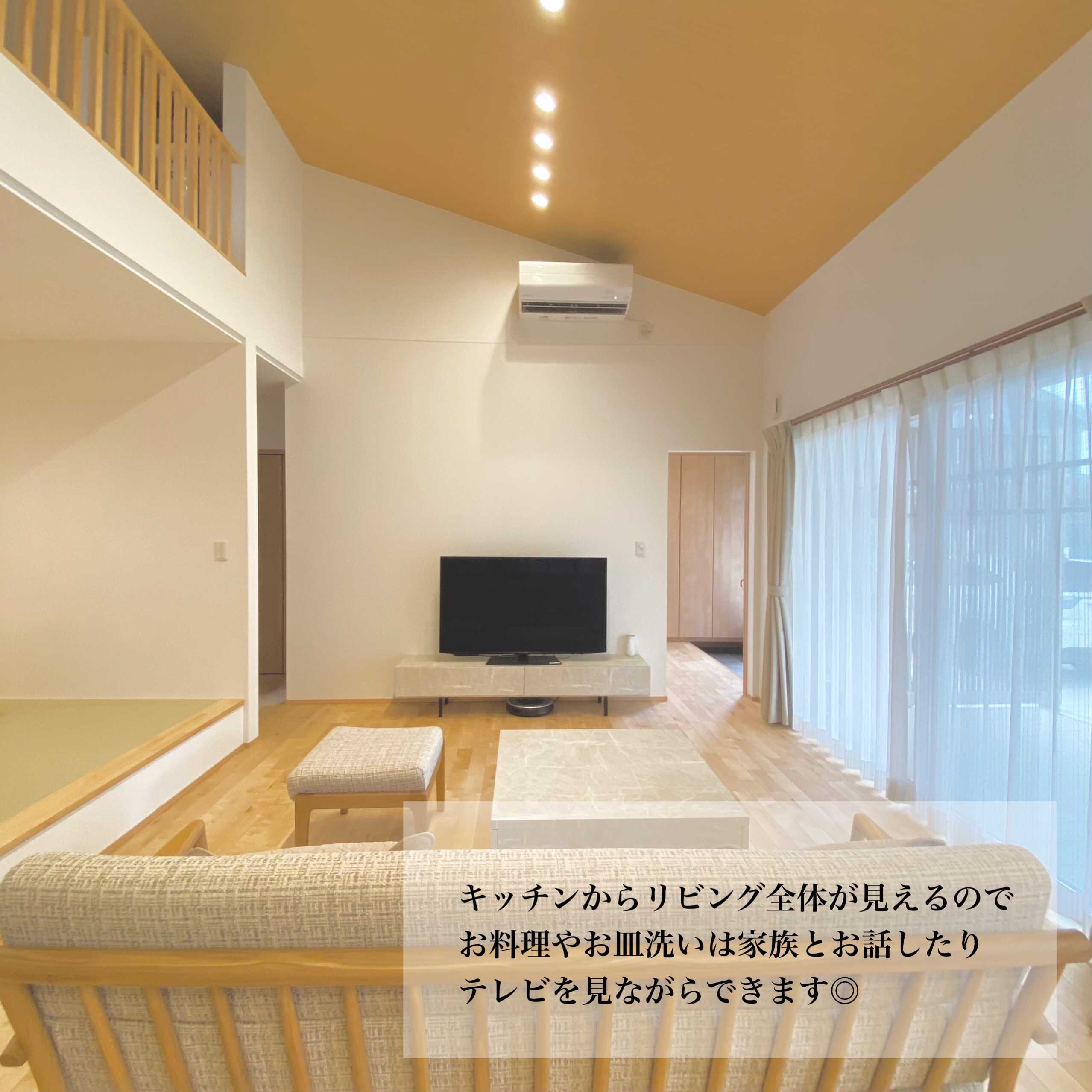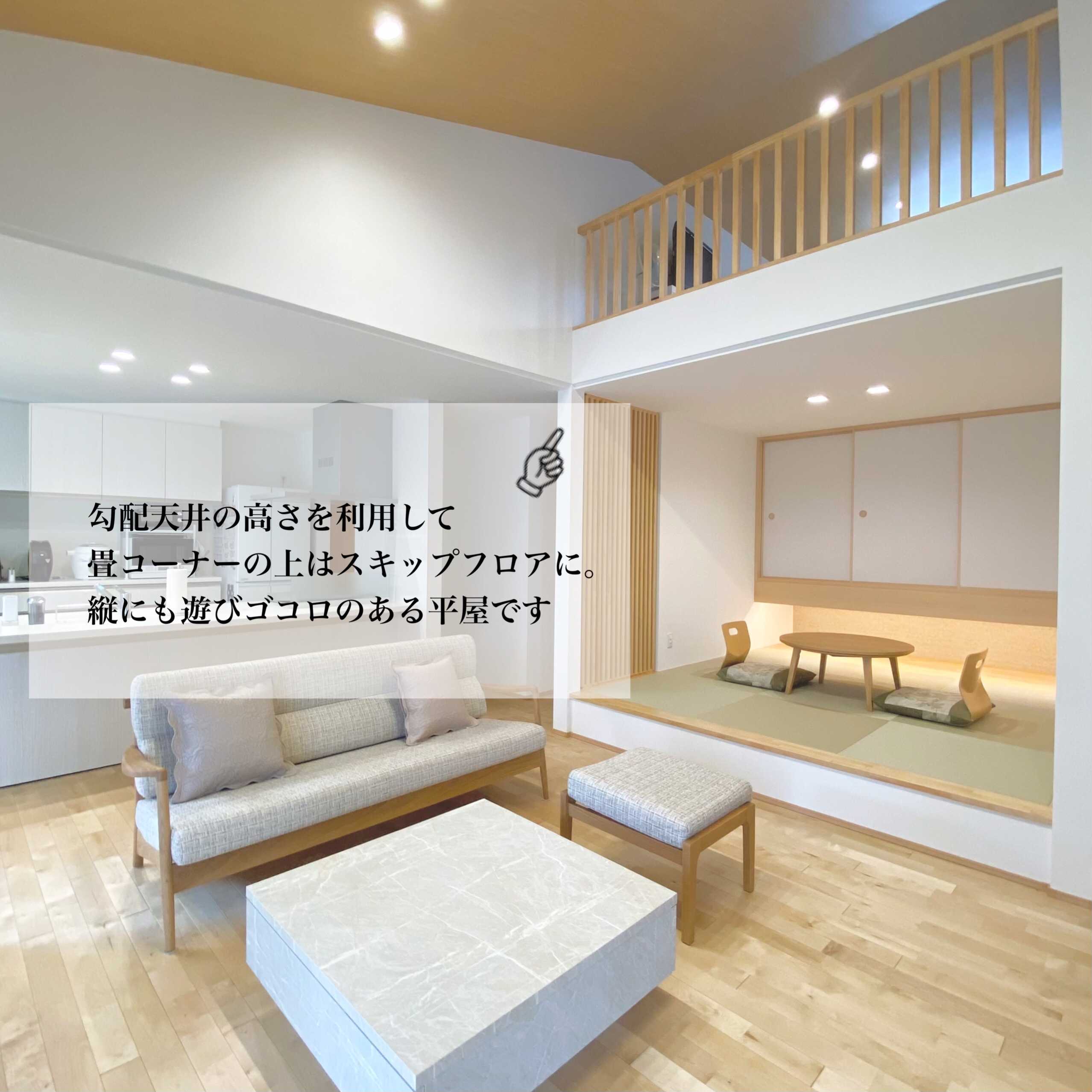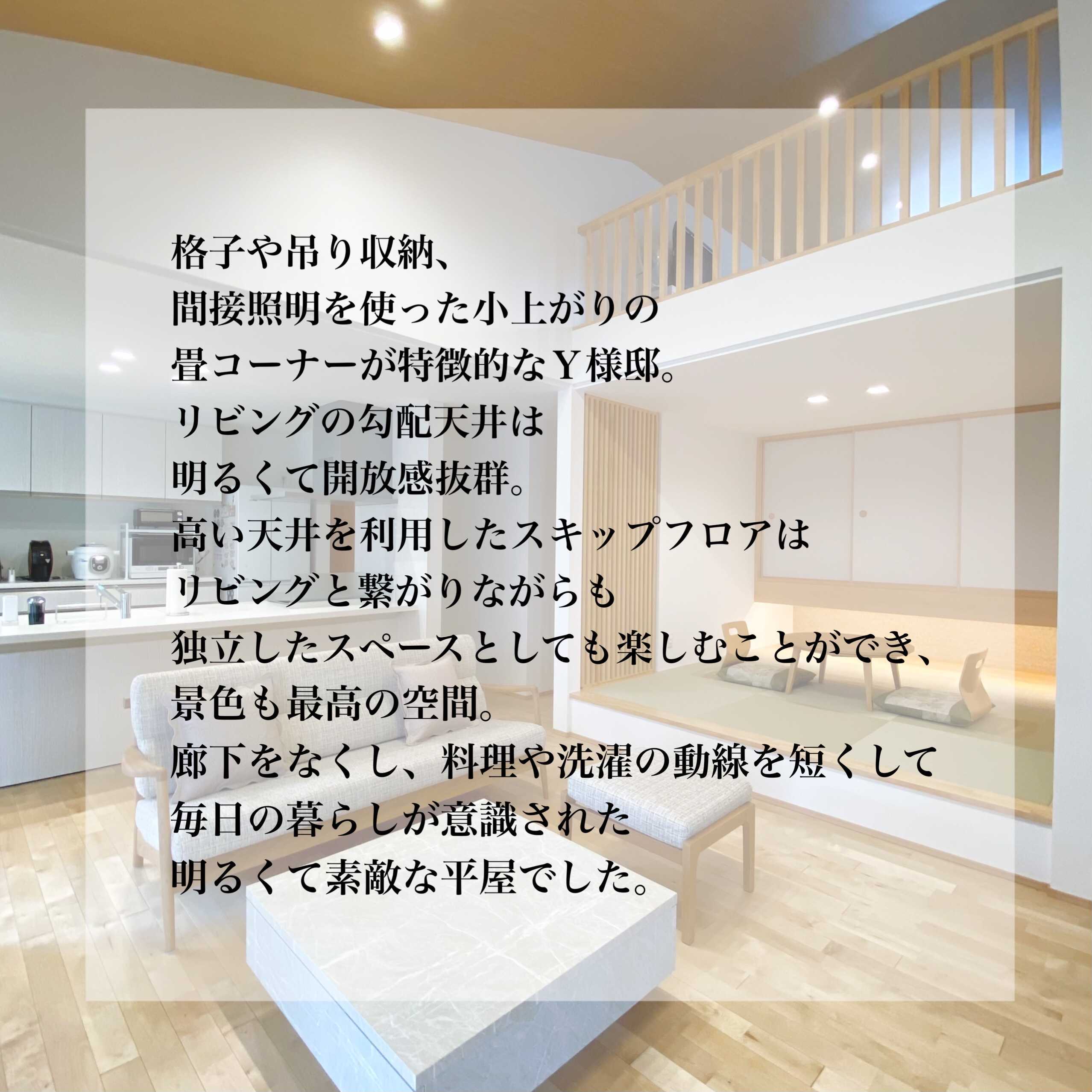 格子や吊り収納、間接照明を使った小上がりの畳コーナーが特徴的なY様邸。リビングの勾配天井は明るくて開放感抜群。高い天井を利用したスキップフロアはリビングと繋がりながらも独立したスペースとしても楽しむことができ、景色も最高の空間。廊下をなくし、料理や洗濯の動線を短くして毎日の暮らしが意識された明るくて素敵な平屋です。