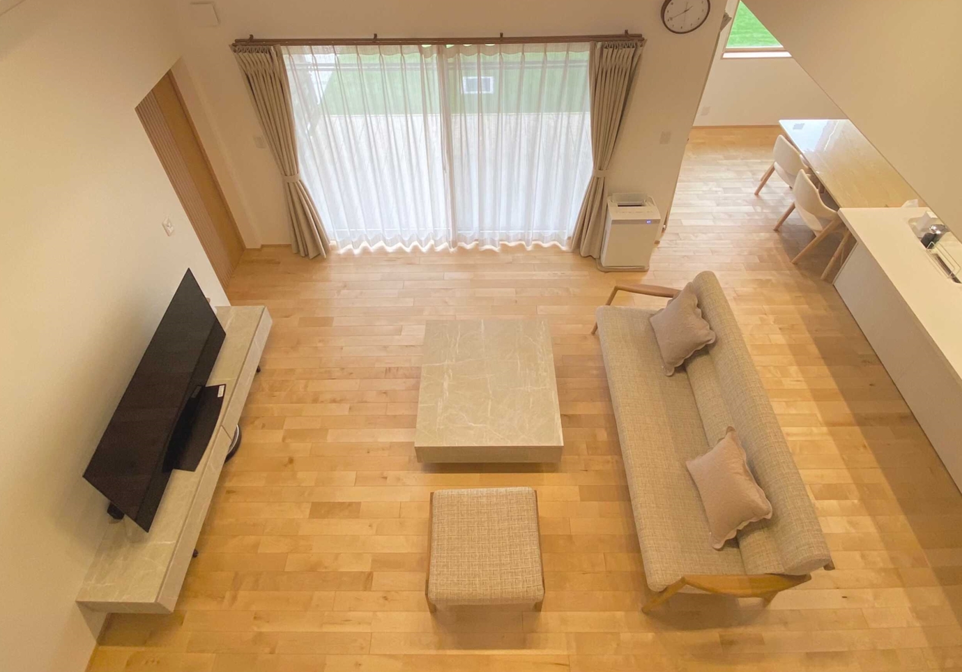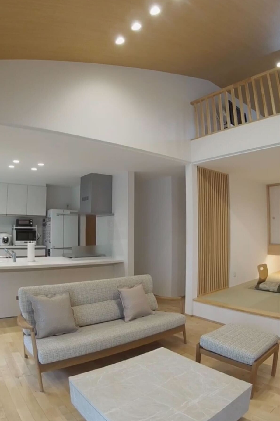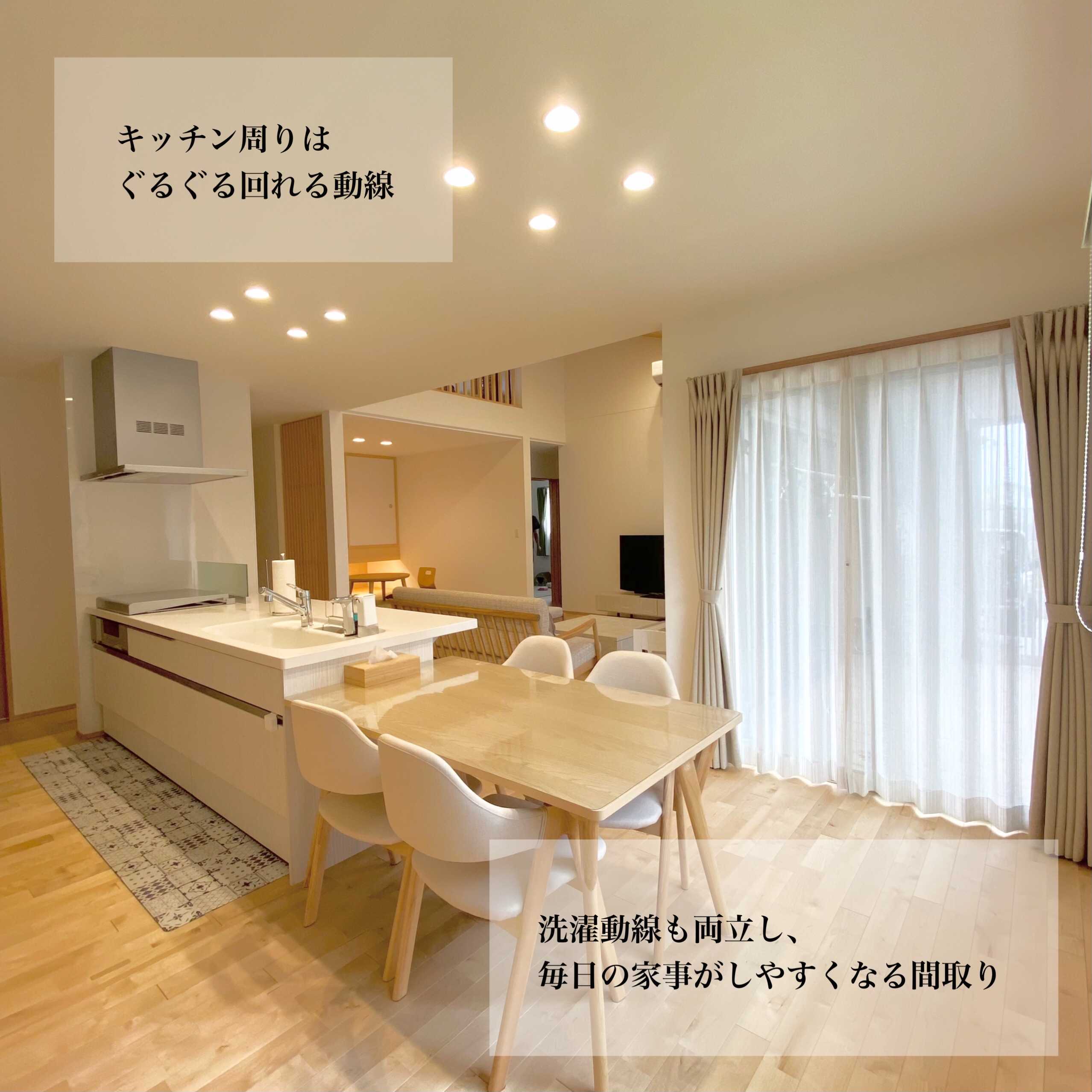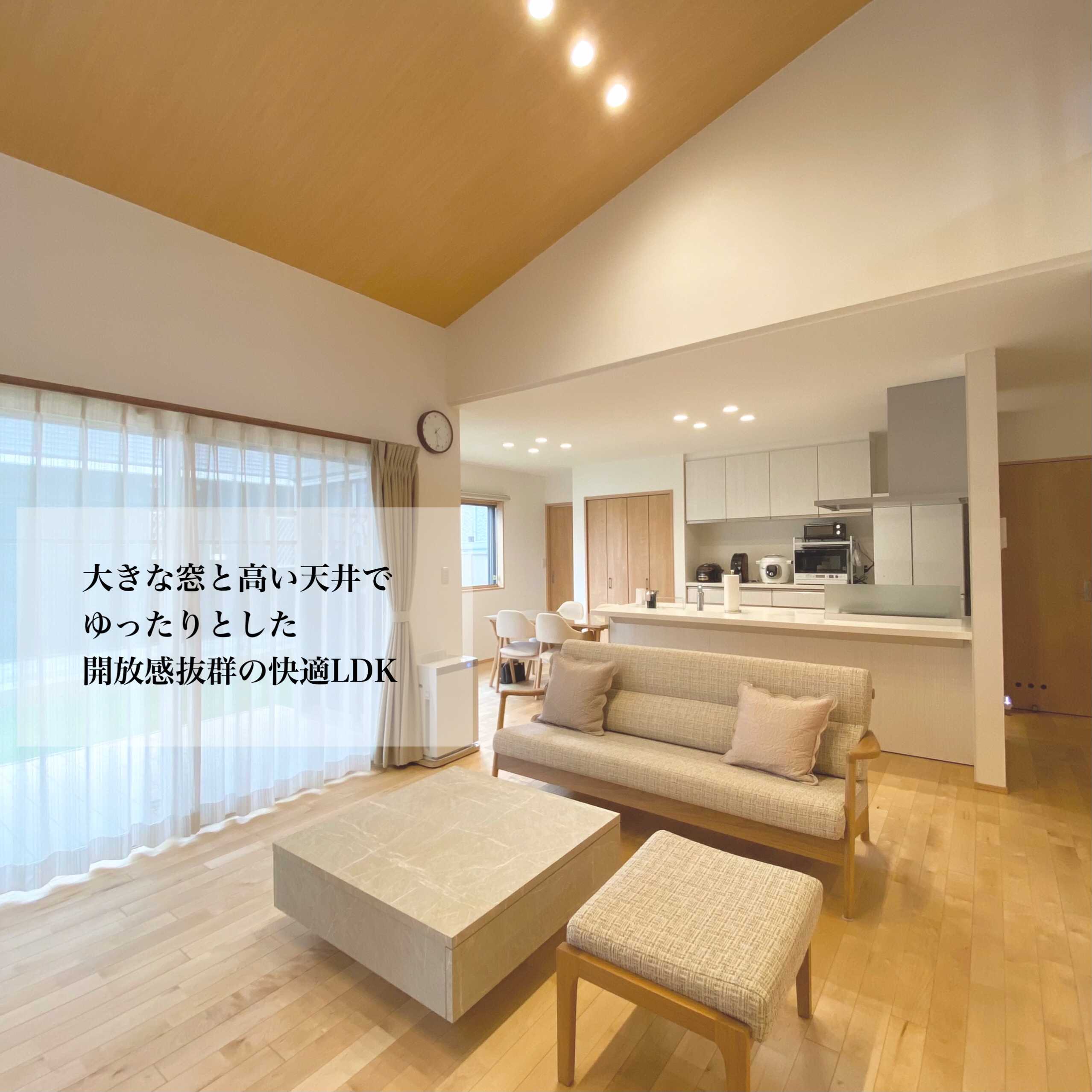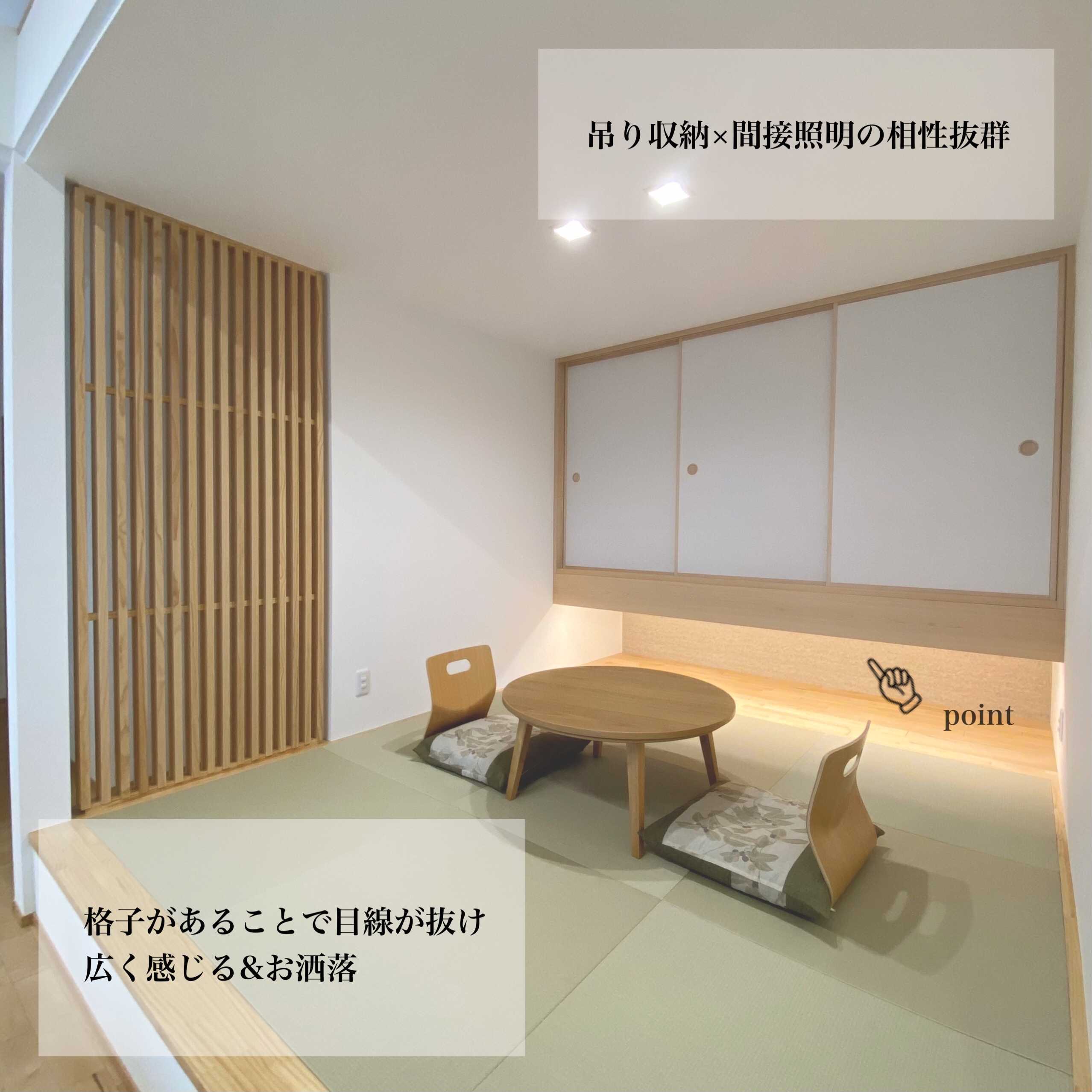 格子や吊り収納、間接照明を使った小上がりの畳コーナーが特徴的なY様邸。リビングの勾配天井は明るくて開放感抜群。高い天井を利用したスキップフロアはリビングと繋がりながらも独立したスペースとしても楽しむことができ、景色も最高の空間。廊下をなくし、料理や洗濯の動線を短くして毎日の暮らしが意識された明るくて素敵な平屋です。
