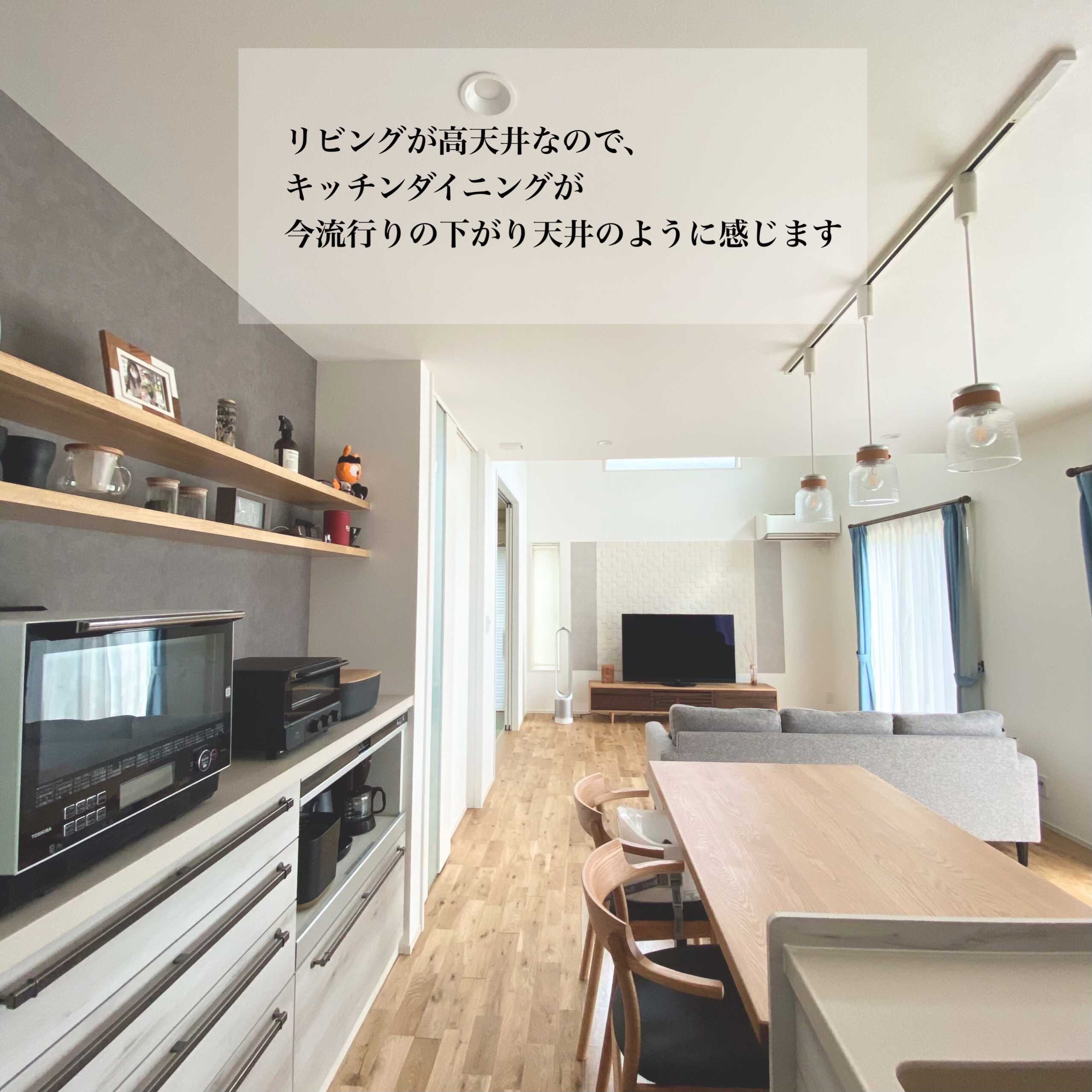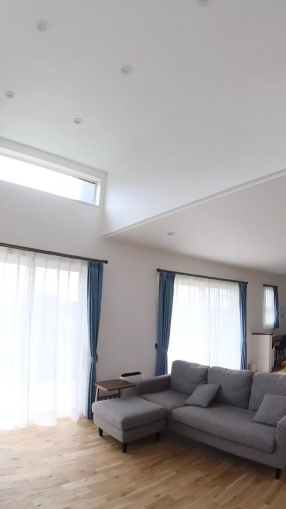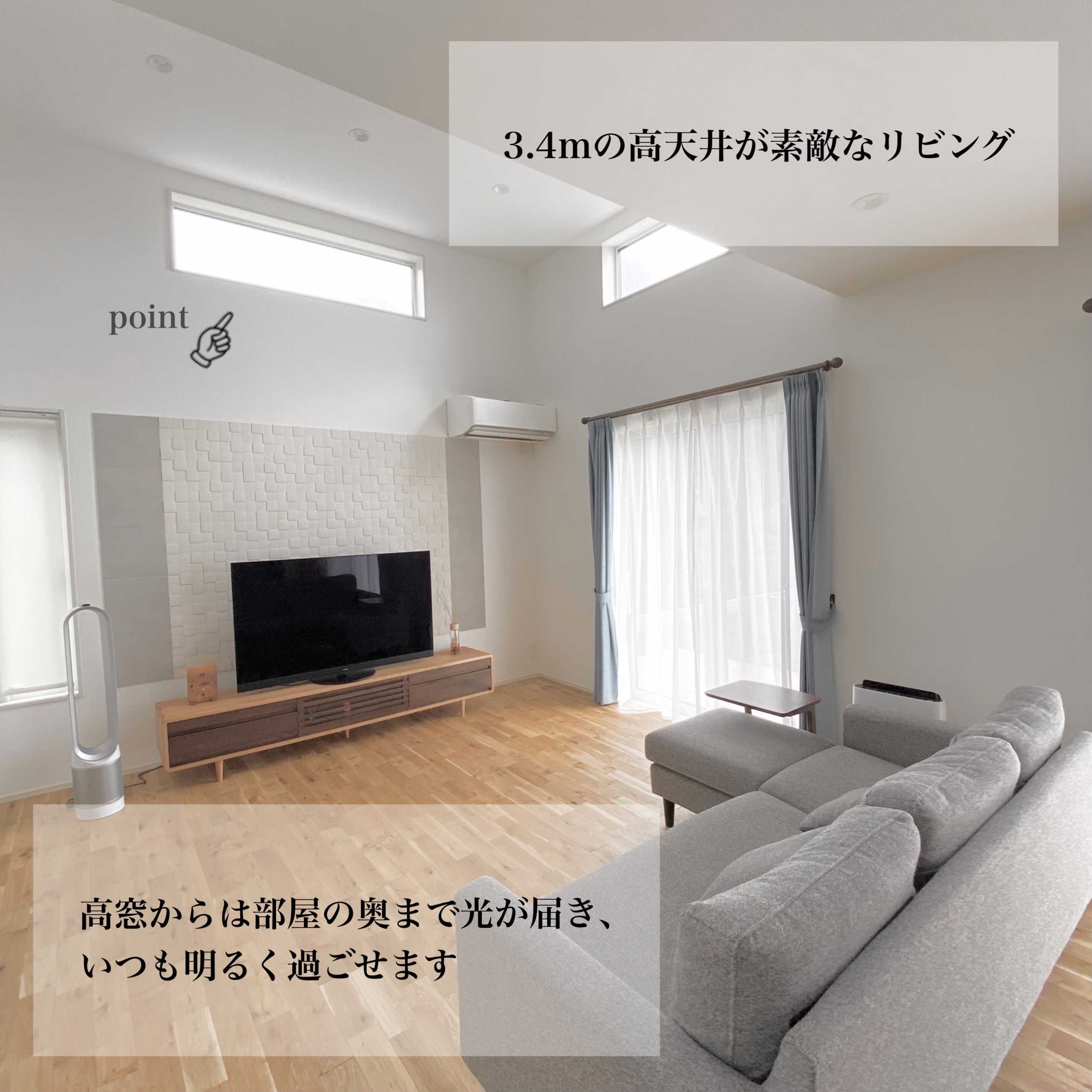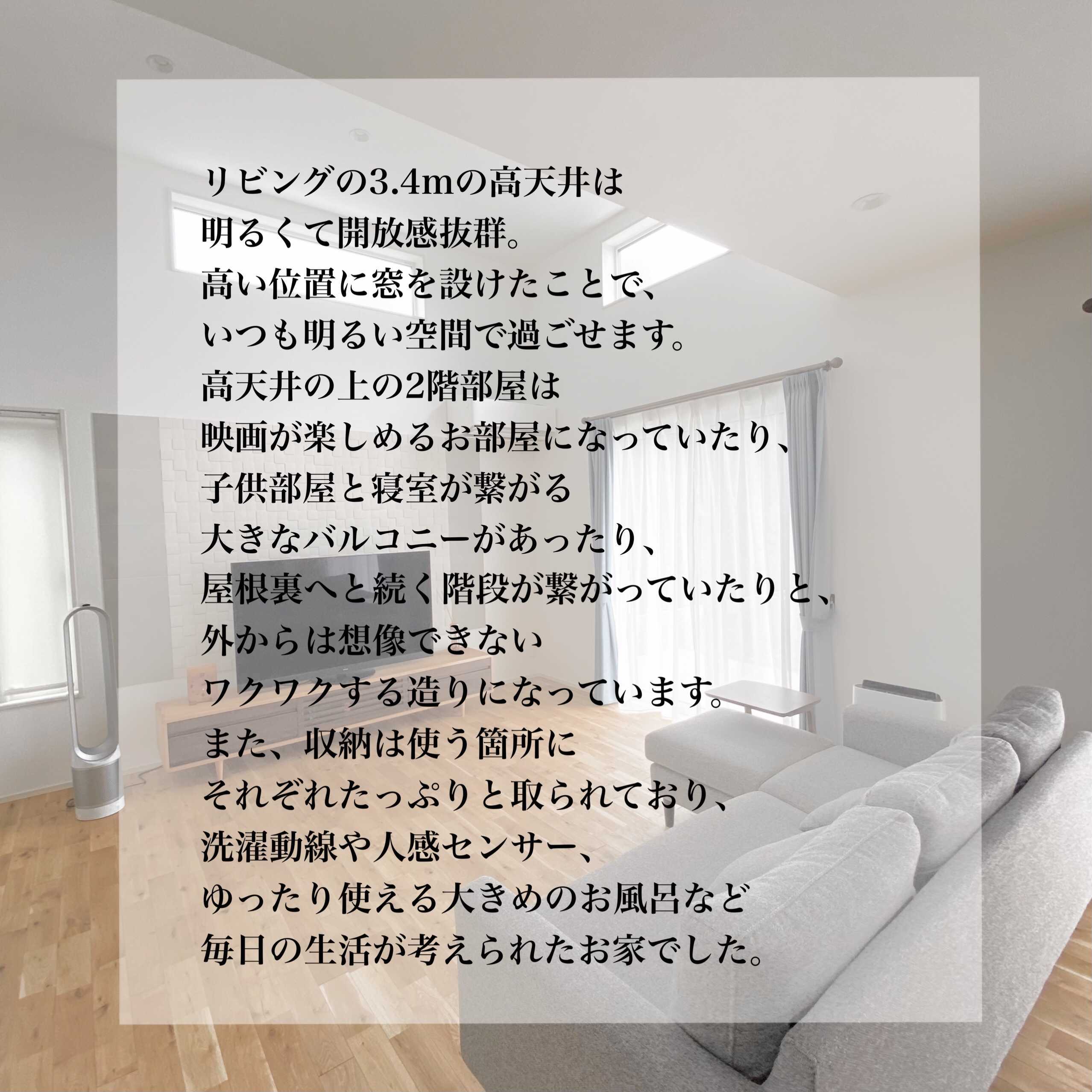 リビングの3.4mの高天井は明るくて開放感抜群。高い位置に窓を設けたことで、いつも明るい空間で過ごせます。高天井の上の2階部屋は映画が楽しめるお部屋になっていたり、子供部屋と寝室が繋がる大きなバルコニーがあったり、屋根裏へと続く階段が繋がっていたりと、外からは想像できないワクワクする造りになっています。また、収納は使う箇所にそれぞれたっぷりと取られており、洗濯動線や人感センサー、ゆったり使える大きめのお風呂など毎日の生活が考えられたお家です。