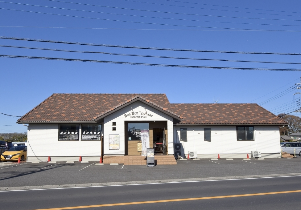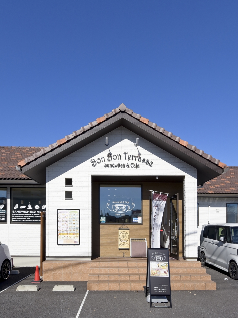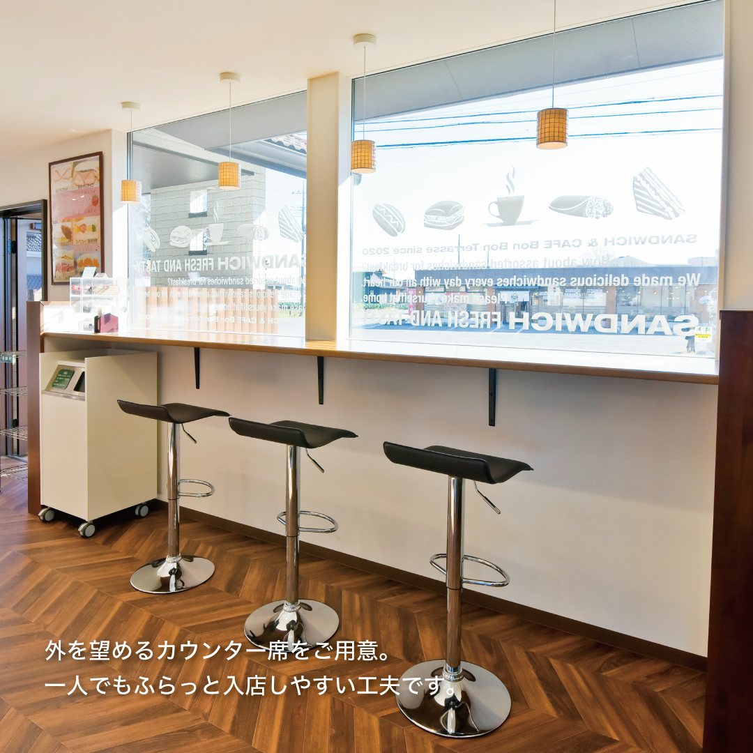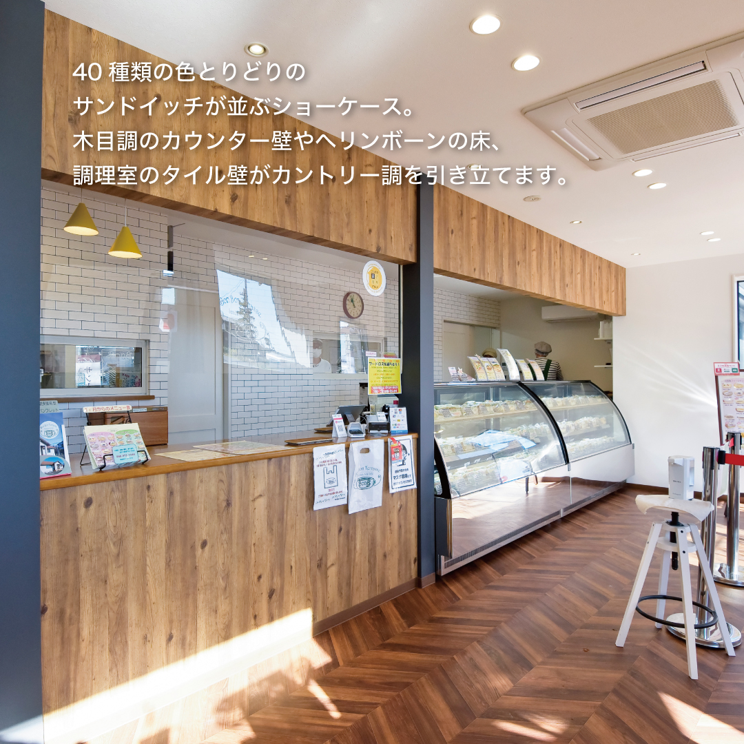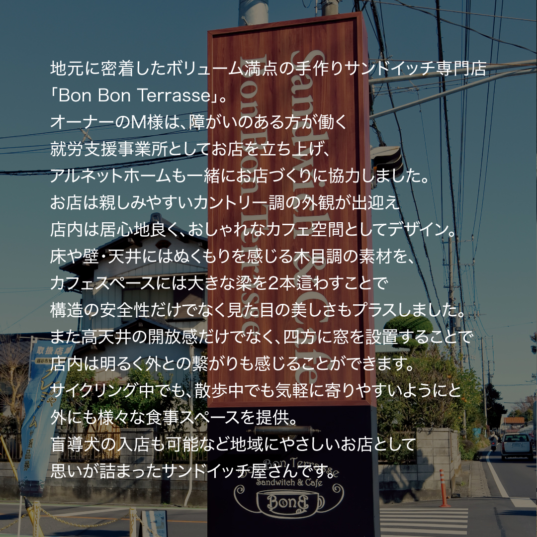 地元に密着したボリューム満点の手作りサンドイッチ専門店「Bon Bon Terrasse」。オーナーのM様は、障がいのある方が働く就労支援事業所としてお店を立ち上げました。お店は親しみやすいカントリー調の外観が出迎え店内は居心地良く、おしゃれなカフェ空間としてデザイン。床や壁・天井にはぬくもりを感じる木目調の素材を、カフェスペースには大きな梁を2本這わすことで構造の安全性だけでなく見た目の美しさもプラスしました。また高天井の開放感だけでなく、四方に窓を設置することで店内は明るく外との繋がりも感じることができます。サイクリング中でも、散歩中でも気軽に寄りやすいようにと外にも様々な食事スペースを提供。盲導犬の入店も可能など地域にやさしいお店として思いが詰まったサンドイッチ屋さんです。