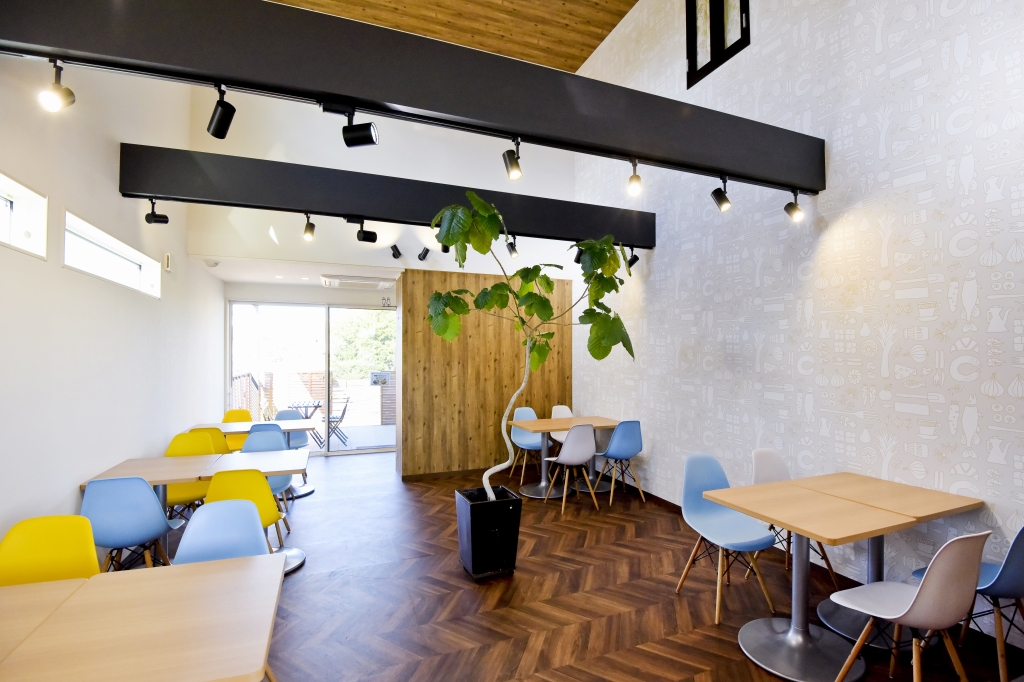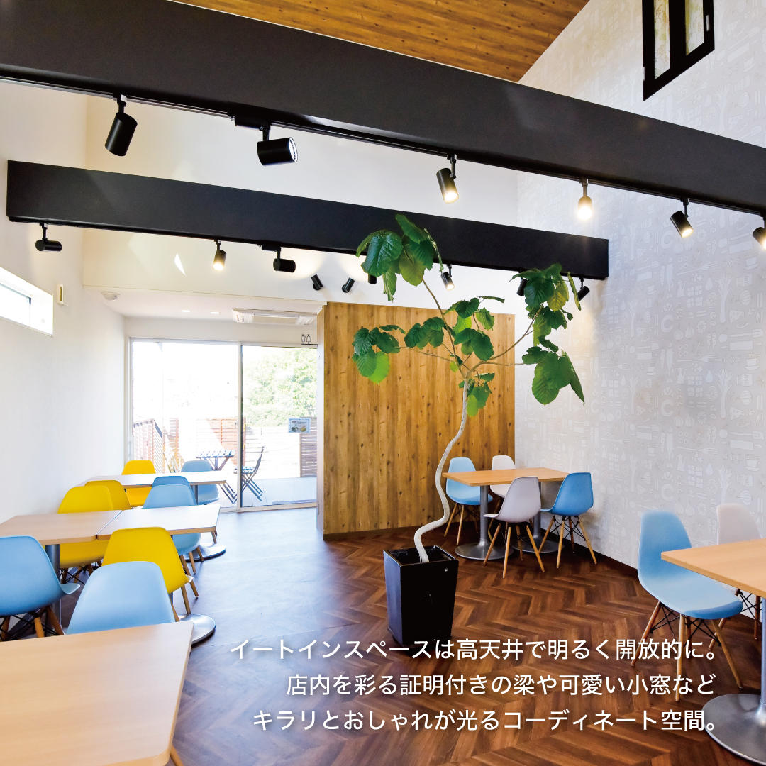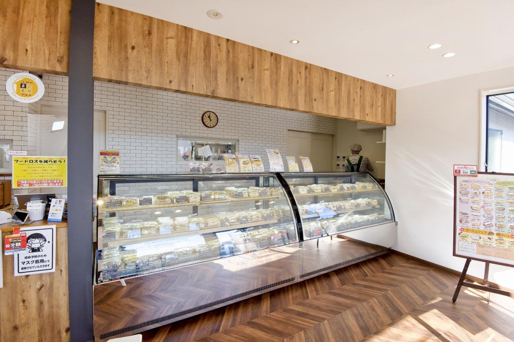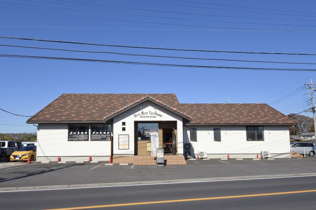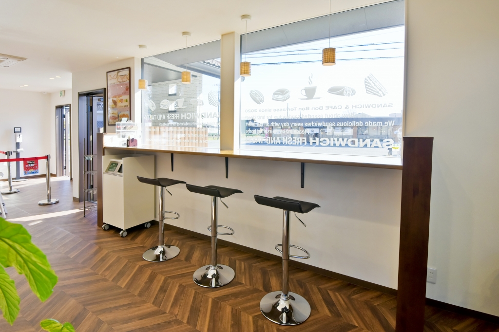 地元に密着したボリューム満点の手作りサンドイッチ専門店「Bon Bon Terrasse」。オーナーのM様は、障がいのある方が働く就労支援事業所としてお店を立ち上げました。お店は親しみやすいカントリー調の外観が出迎え店内は居心地良く、おしゃれなカフェ空間としてデザイン。床や壁・天井にはぬくもりを感じる木目調の素材を、カフェスペースには大きな梁を2本這わすことで構造の安全性だけでなく見た目の美しさもプラスしました。また高天井の開放感だけでなく、四方に窓を設置することで店内は明るく外との繋がりも感じることができます。サイクリング中でも、散歩中でも気軽に寄りやすいようにと外にも様々な食事スペースを提供。盲導犬の入店も可能など地域にやさしいお店として思いが詰まったサンドイッチ屋さんです。
