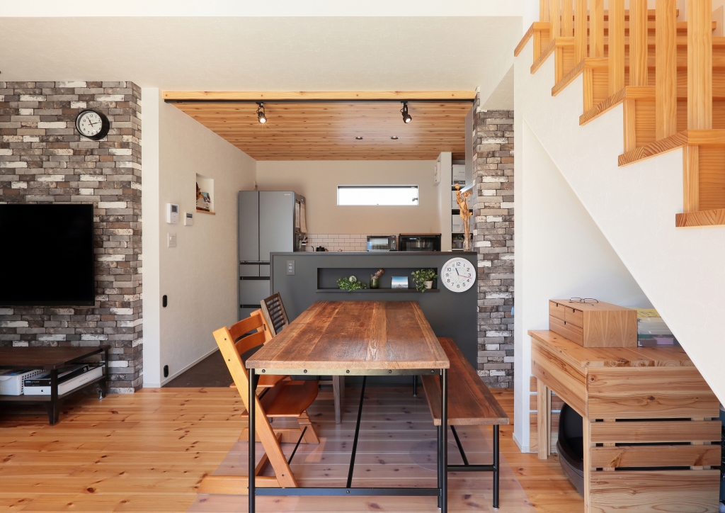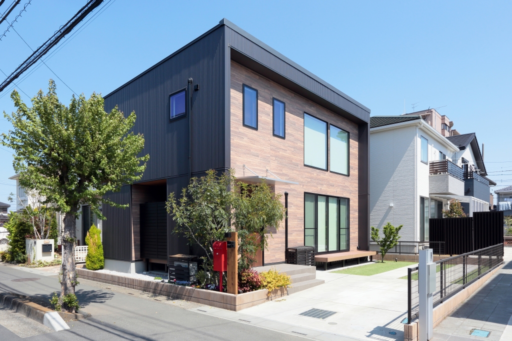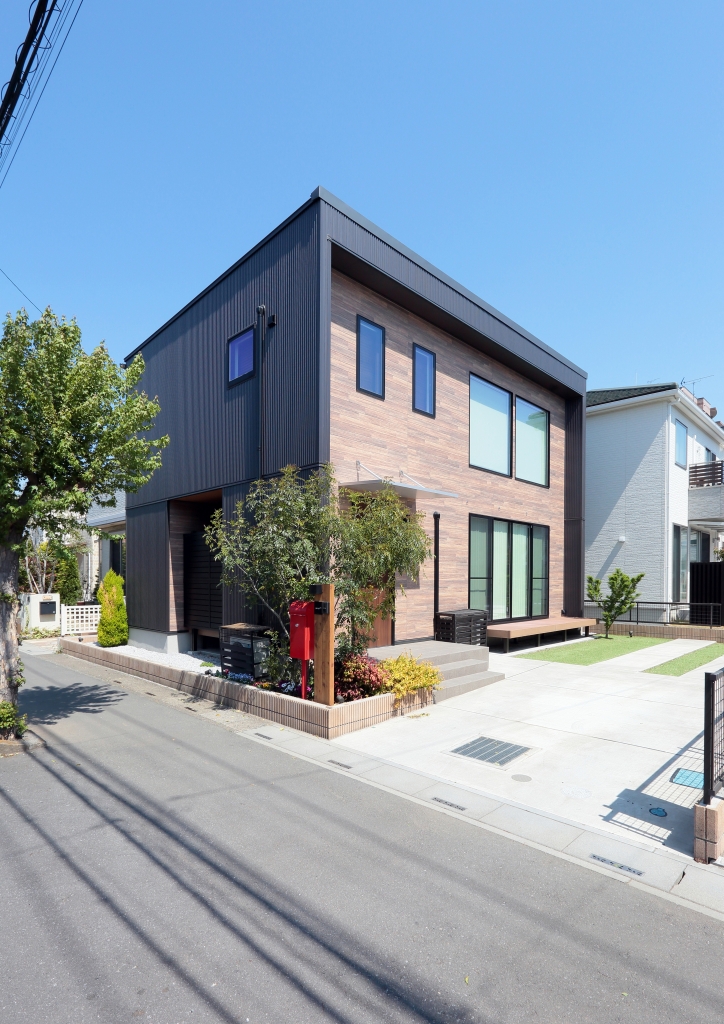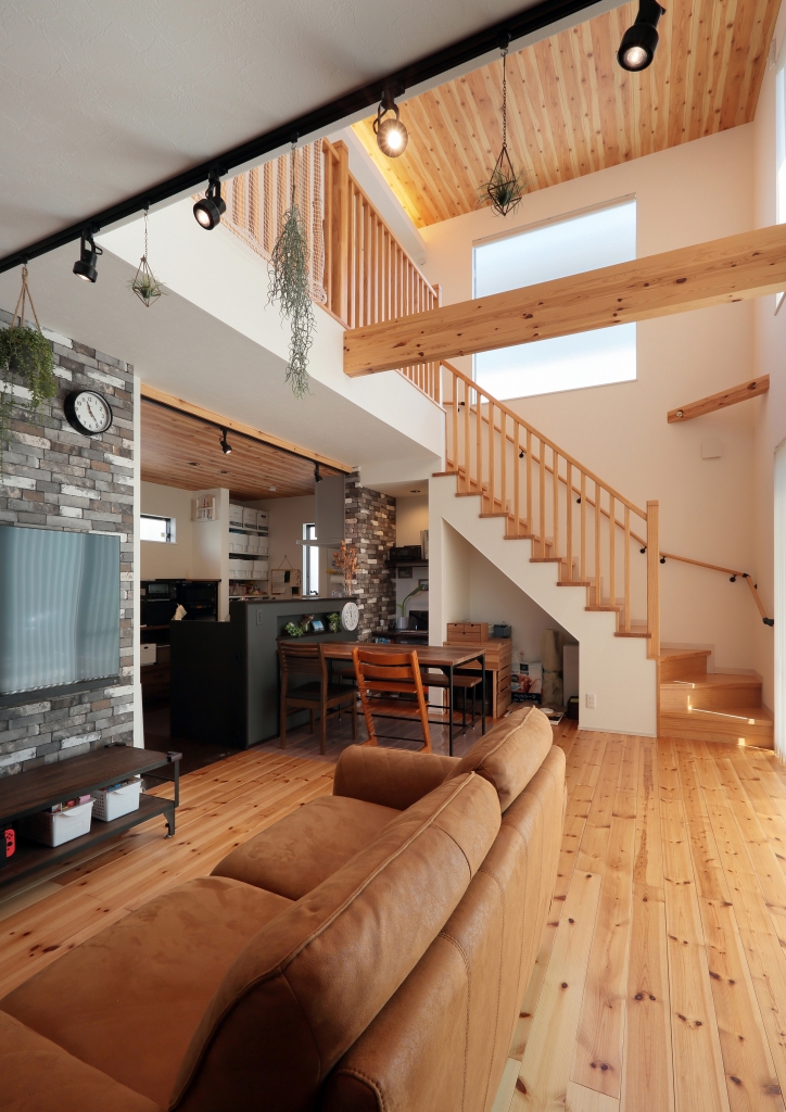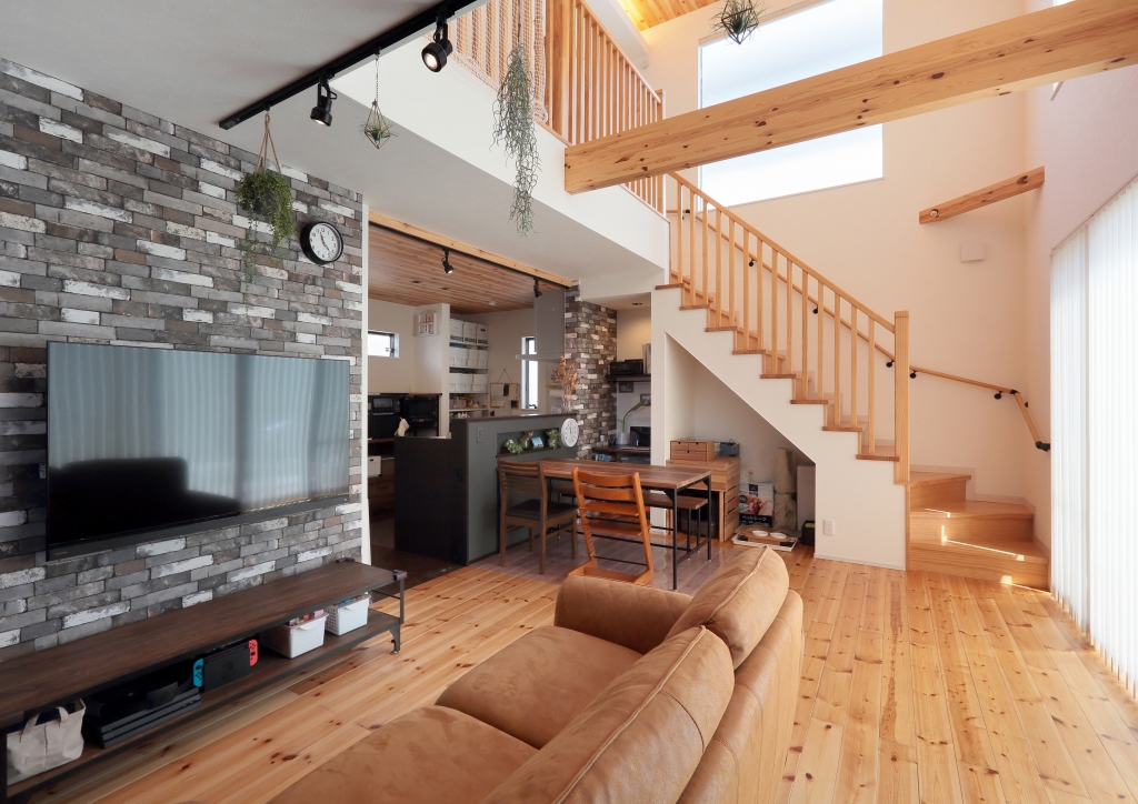 木目調の外壁材をアクセントにしたキューブ型のおうち。室内は外観からは想像できないような、木をふんだんに使った吹き抜けのある造りです。大きな窓との相性は抜群で、やわらかいパインの無垢材で全身に木の暖かみを感じることができます。優しい雰囲気を引き締めるブラックのやタイル調の壁紙や、工程の多い洗濯がラクになる家事スペースにも注目です。