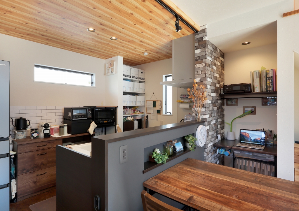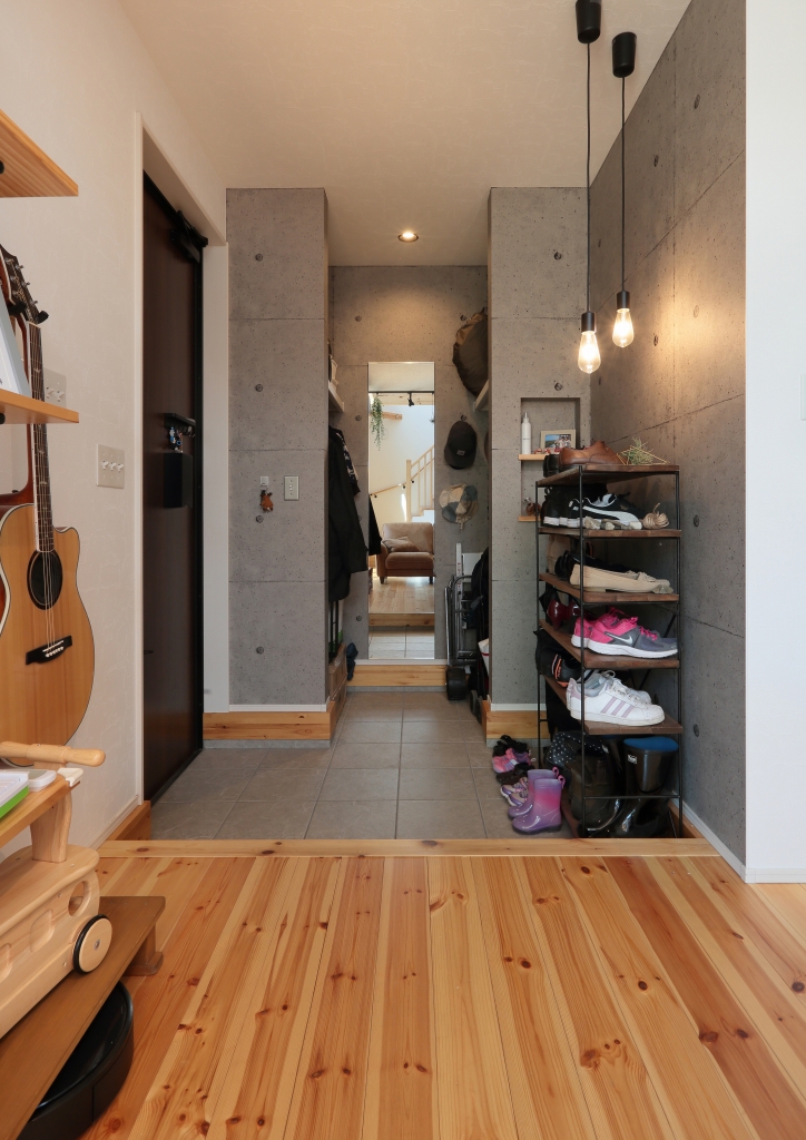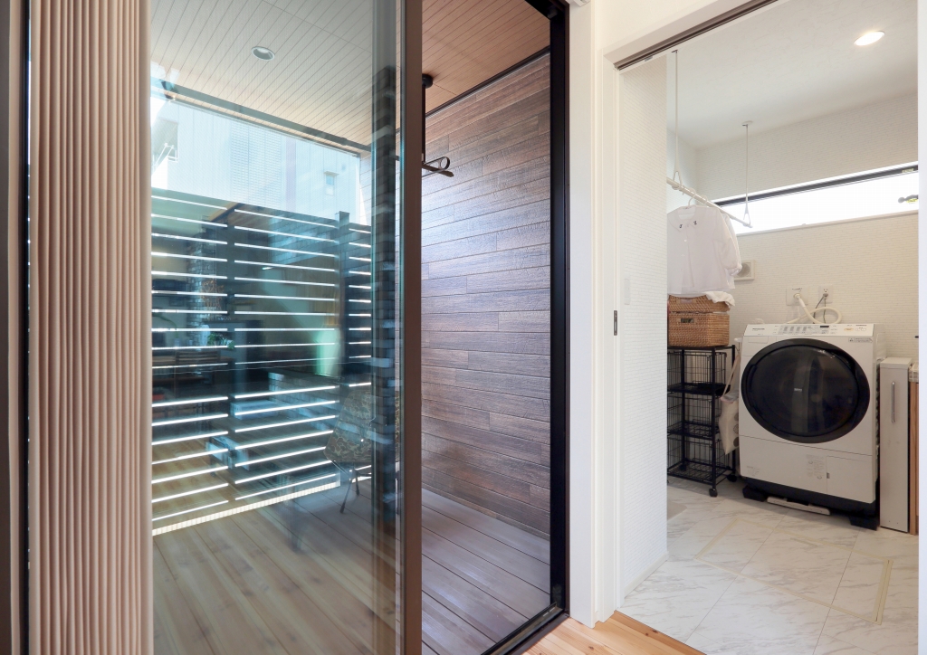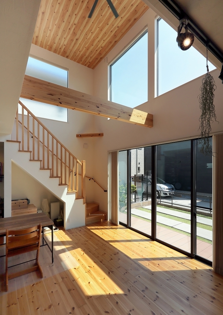 木目調の外壁材をアクセントにしたキューブ型のおうち。室内は外観からは想像できないような、木をふんだんに使った吹き抜けのある造りです。大きな窓との相性は抜群で、やわらかいパインの無垢材で全身に木の暖かみを感じることができます。優しい雰囲気を引き締めるブラックのやタイル調の壁紙や、工程の多い洗濯がラクになる家事スペースにも注目です。