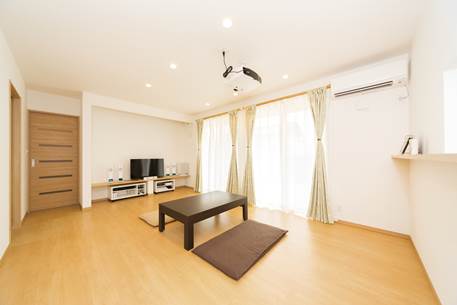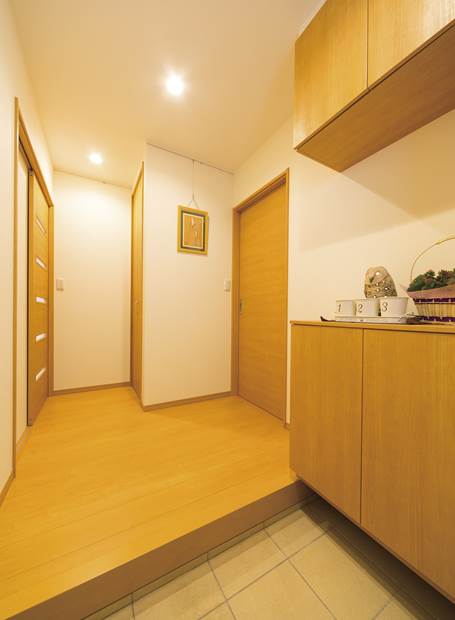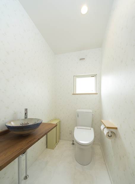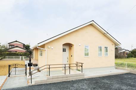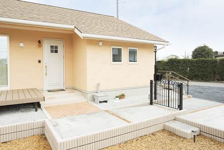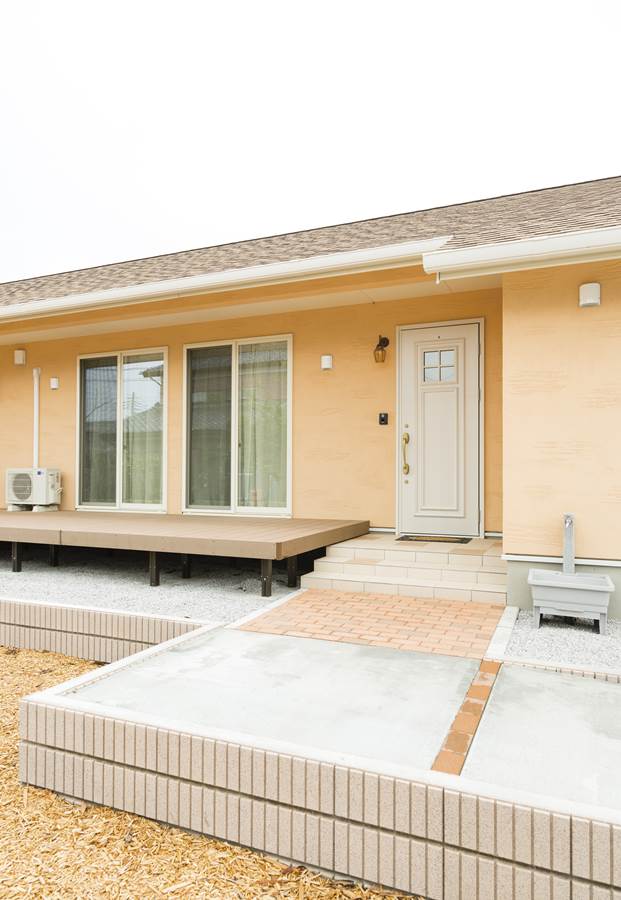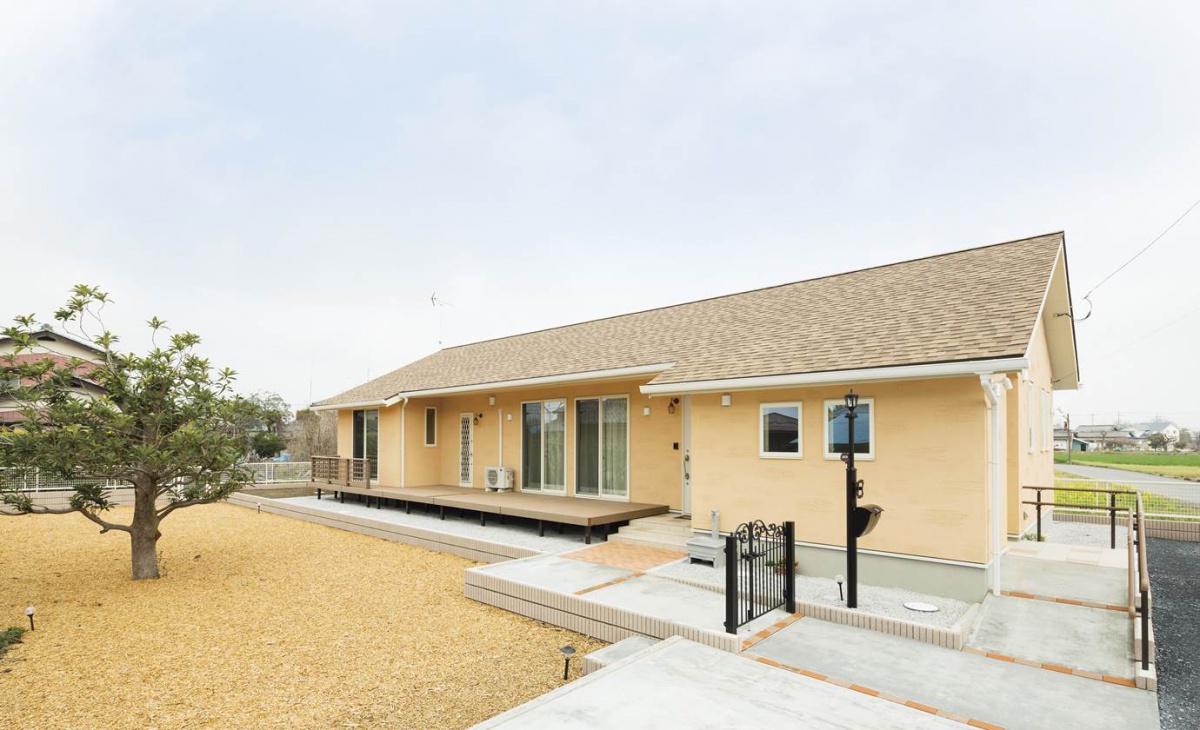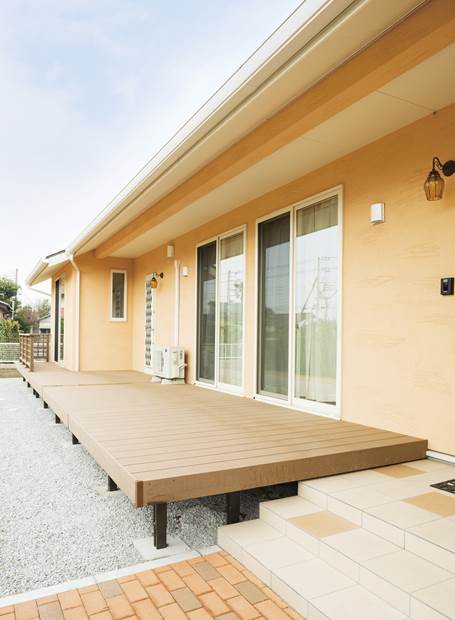 広い敷地を活かし、平屋を実現。塗り壁にはコテ跡をあえて残し、温もりのある雰囲気にこだわった。南に向いたウッドデッキの上に夏の日差しを遮る軒を伸ばして、ウッドチップを敷き詰めた庭でお子様が思い切り遊ぶことができる。