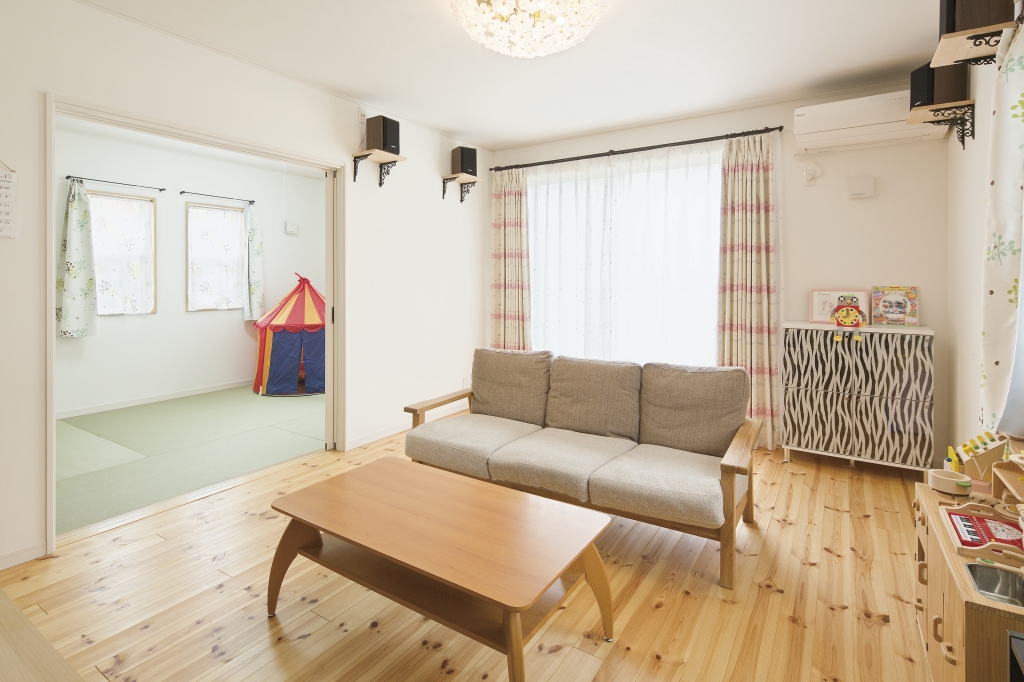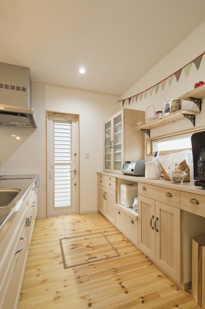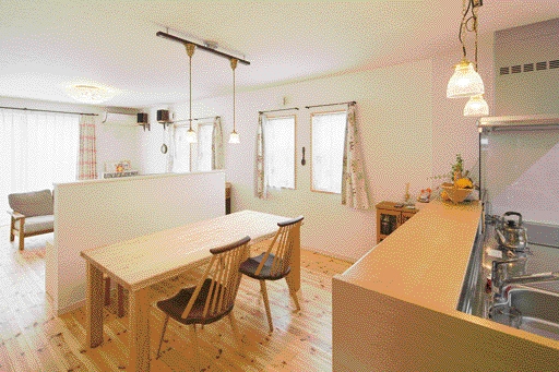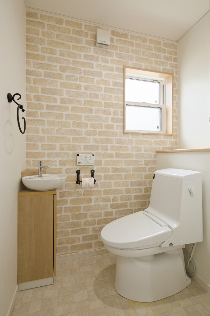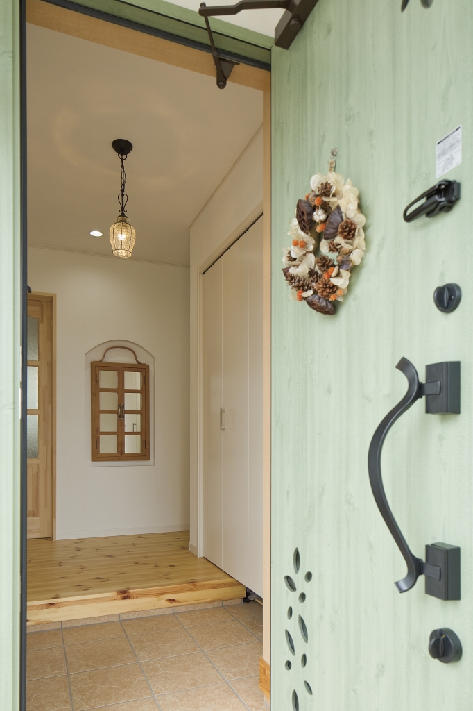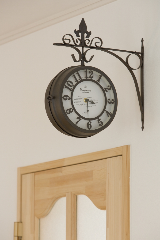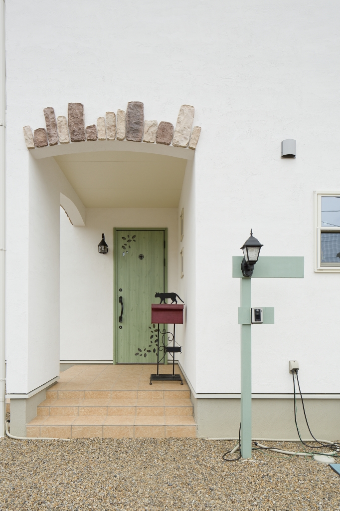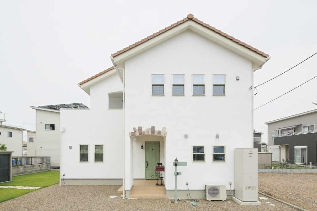 三角屋根のホワイトの外観に、正方形の上げ下げ窓を揃えて配置した瓦の屋根がかわいいO様邸。玄関ドアはパッと目を惹くスモークグリーンで、カントリー調で可愛いお家を実現しました。室内はホワイトやベージュを使いやわらかい雰囲気に。両面時計を付けたり、タイル調のクロスやアイアン素材を使用して可愛い雰囲気に仕上げられたお家です。