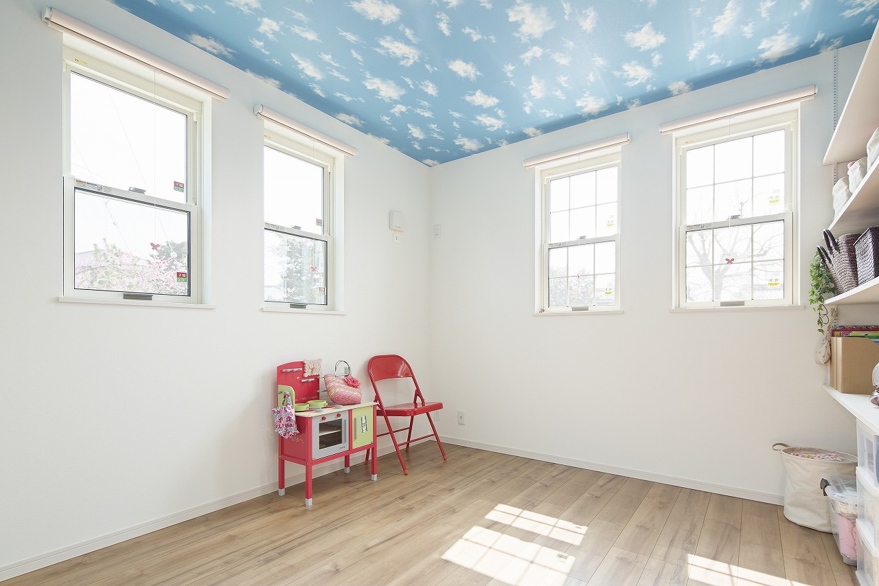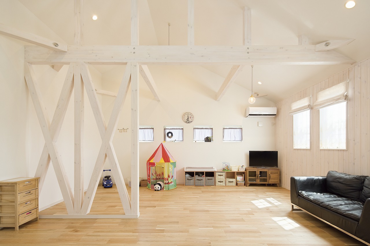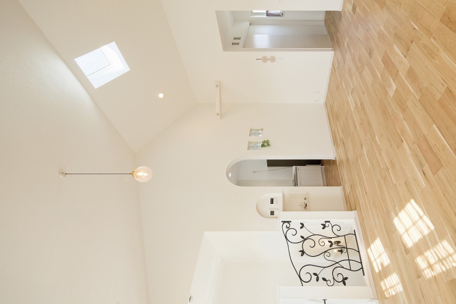 開放感と眺望、プライバシーや日当たりを確保できる2階をリビングにしたお家。屋根の勾配に沿って天井が高く開放感のあるリビングは、階段を上がってきた瞬間に日常から切り離され、家族だけのプライベートな空間が広がります。小さな土地でもしっかりと日射が確保でき、カーテンを常に開けておいてもお隣や外からの視線が気にならないのもいいですね。