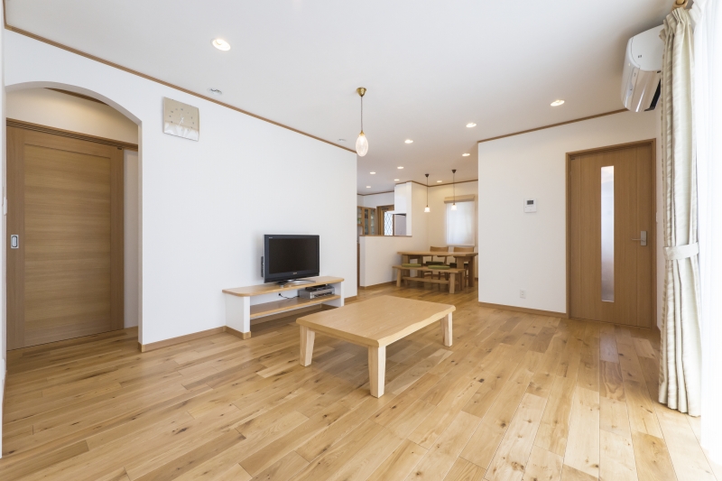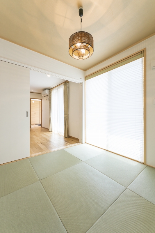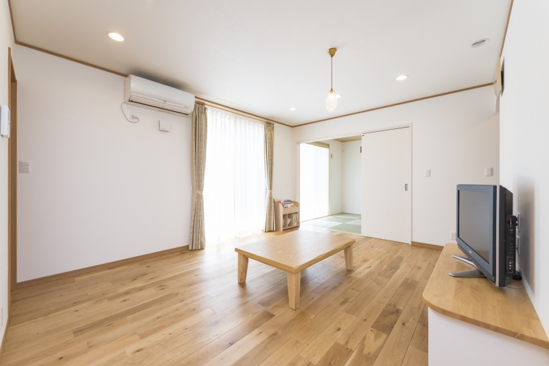 子育て時や老後の暮らしも安心な、リビングの隣に和室を設けたS様邸。扉を開ければリビングの一角として使用可能で、洗濯物を畳むなどの家事スペース、お昼寝やお子さんの遊び場、客間にしたり、仏間を置いたりと使い勝手が抜群です。お子さんが巣立った後は寝室代わりにするのも良いですね。家族がのびのびと暮らせる、ホッと落ち着くおうちです。