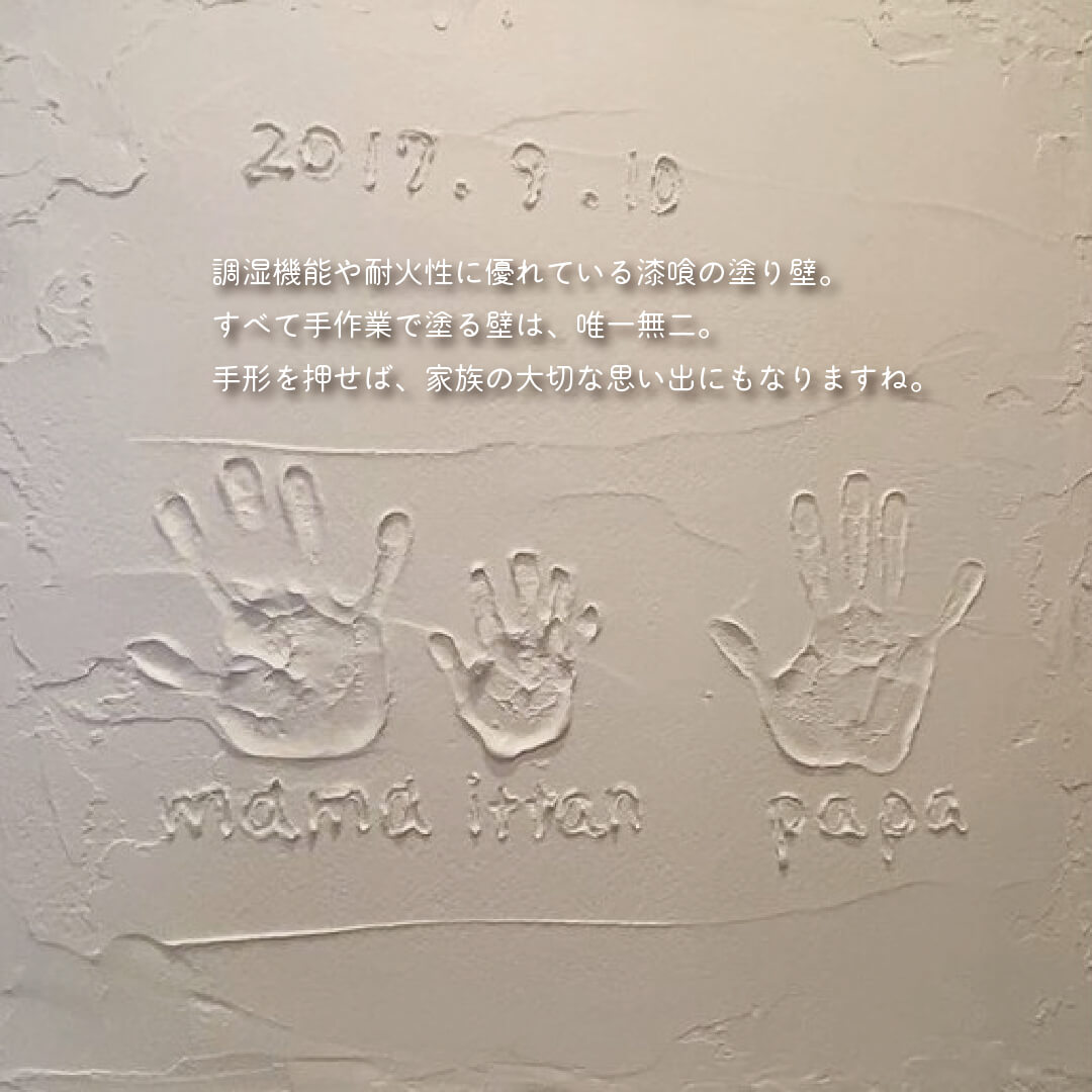 室内すべて漆喰塗りのA様邸。職人さんが一からすべて手作業で塗る壁は唯一無二の表情が生まれ、 調湿性などの機能性も抜群。さらに家族の手形の模様を付けることで、お子さんの成長がわかる可愛いアクセントに。他にも、無垢床や梁、 木目の天井など、自然素材が持つ暖かみをたっぷりと活用したおうちです。 吹き抜けのある明るいリビングや、光が通る扉や室内窓、 小上がりの収納付きタタミコーナー、 照明を仕込んだ壁、 造作家具の子ども部屋、回遊動線、 ランドリールーム、 道から見えない玄関など、真似したくなる暮らしの工夫が盛りだくさん。自然素材に囲まれて、 快適に暮らせるおうちです。