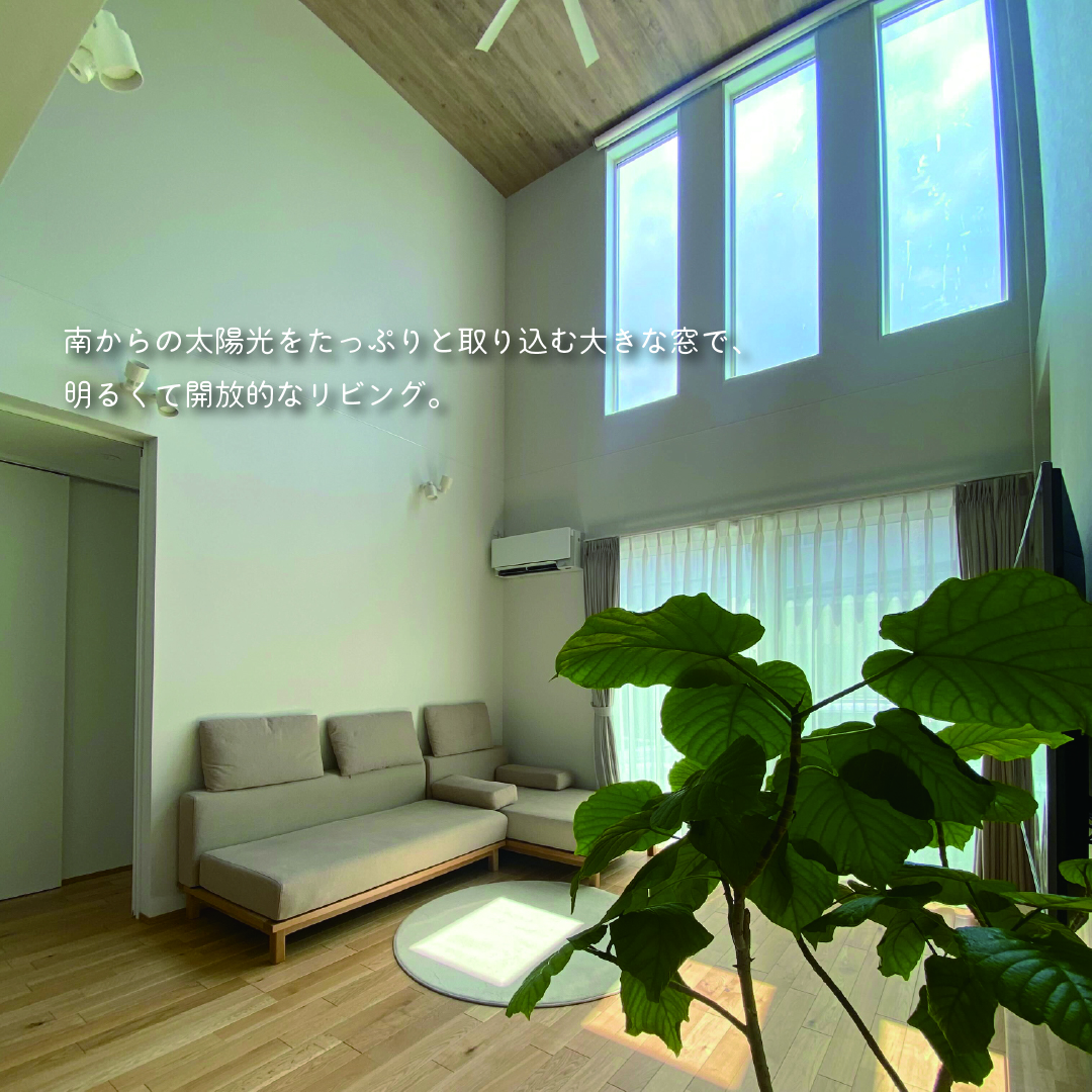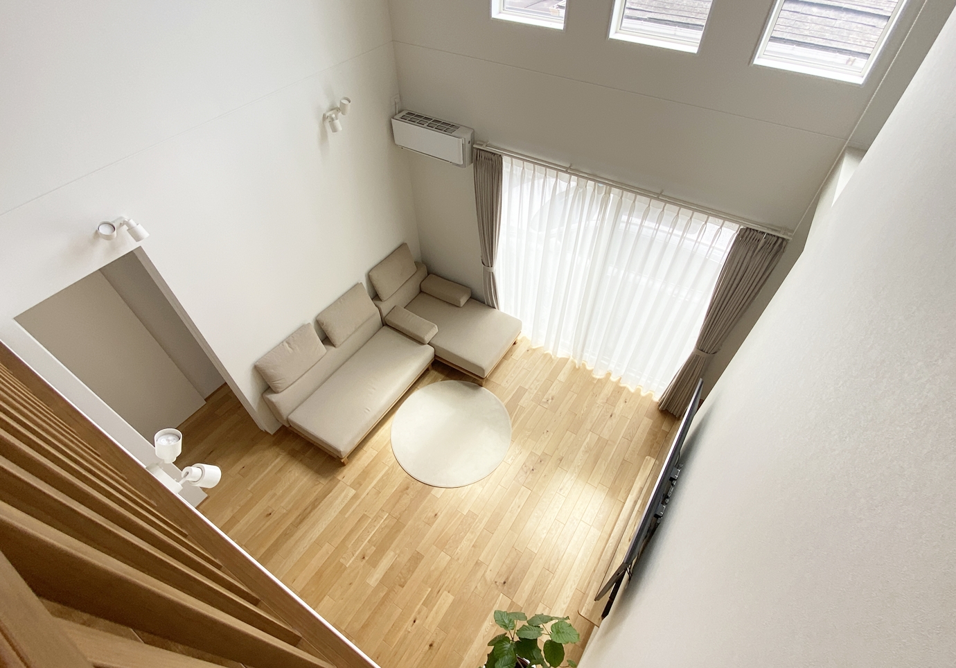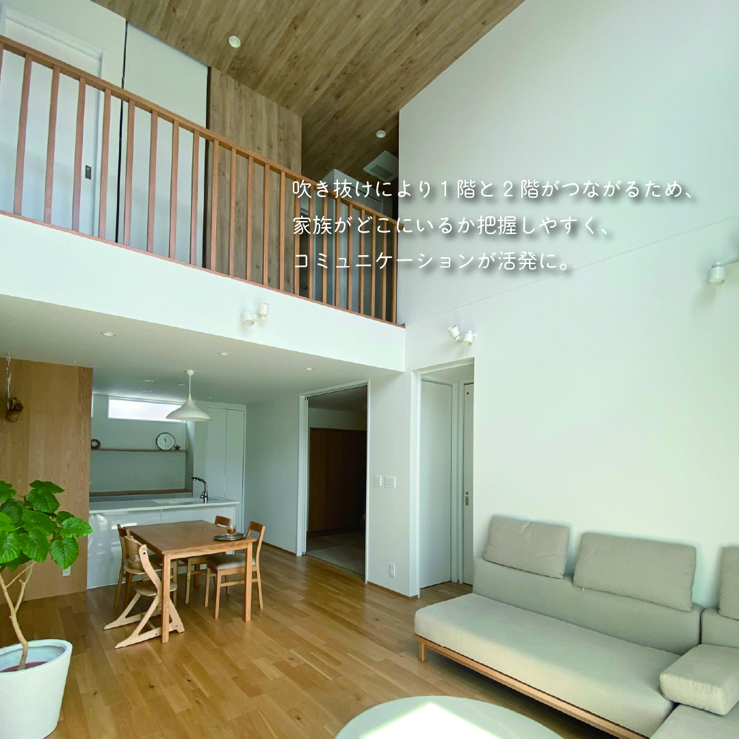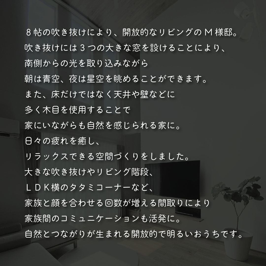 8帖の吹き抜けにより、開放的なリビングが特徴のM様邸。吹き抜けには3つの大きな窓を設けることにより、南側からの光を取り込みながら朝は青空、夜は星空を眺めることができます。また床だけではなく天井や壁などに多く木目を使用することで、家にいながらも自然を感じられるお家に。日々の疲れを癒し、リラックスできる空間づくりをしました。大きな吹き抜けやリビング階段、LDK横のタタミコーナーなど、家族と顔を合わせる回数が増える間取りの工夫で、家族間のコミュニケーションも活発に。自然とつながりが生まれる開放的で明るいおうちです。