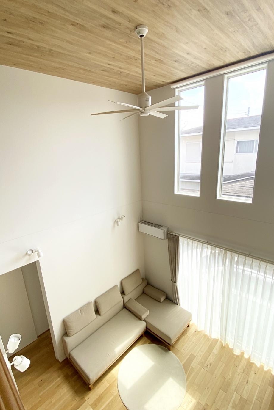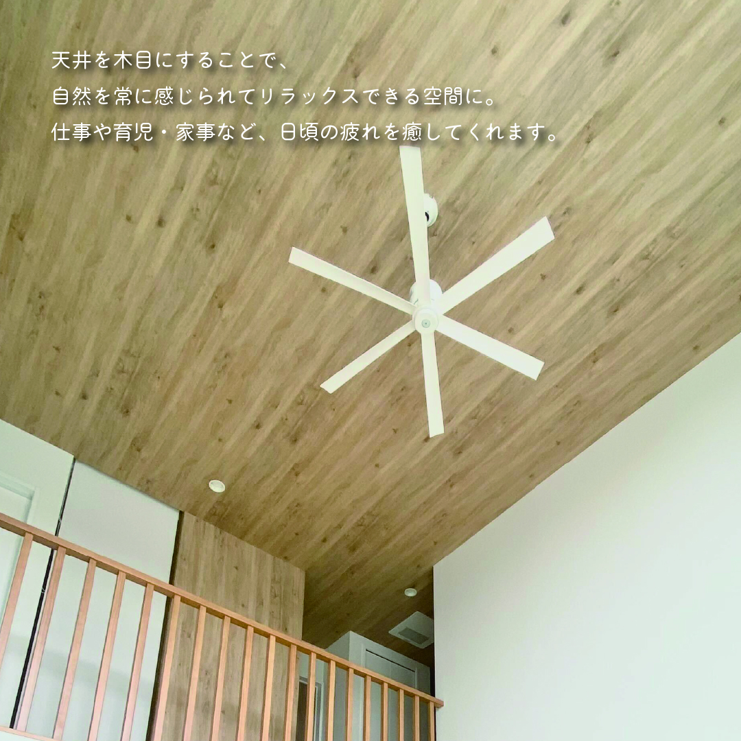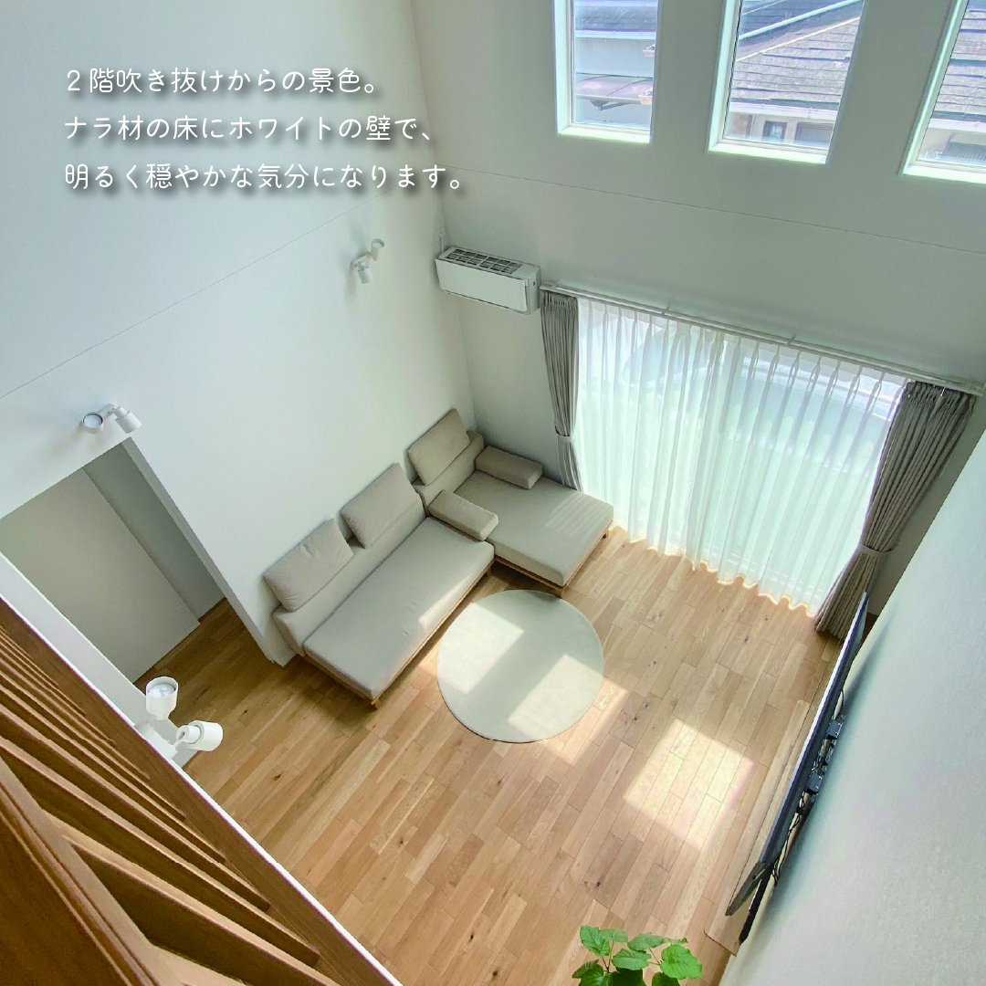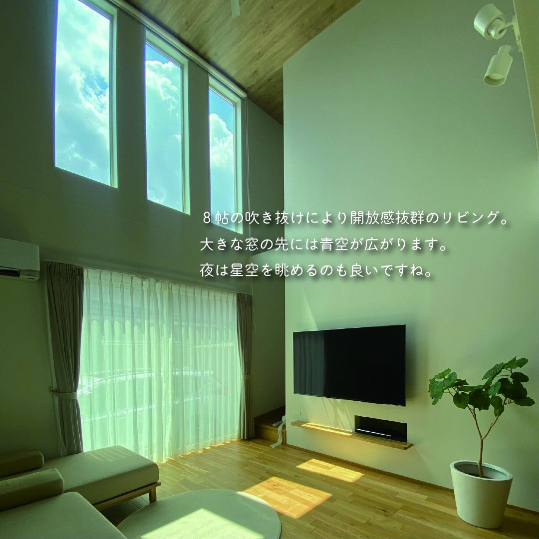 8帖の吹き抜けにより、開放的なリビングが特徴のM様邸。吹き抜けには3つの大きな窓を設けることにより、南側からの光を取り込みながら朝は青空、夜は星空を眺めることができます。また床だけではなく天井や壁などに多く木目を使用することで、家にいながらも自然を感じられるお家に。日々の疲れを癒し、リラックスできる空間づくりをしました。大きな吹き抜けやリビング階段、LDK横のタタミコーナーなど、家族と顔を合わせる回数が増える間取りの工夫で、家族間のコミュニケーションも活発に。自然とつながりが生まれる開放的で明るいおうちです。
