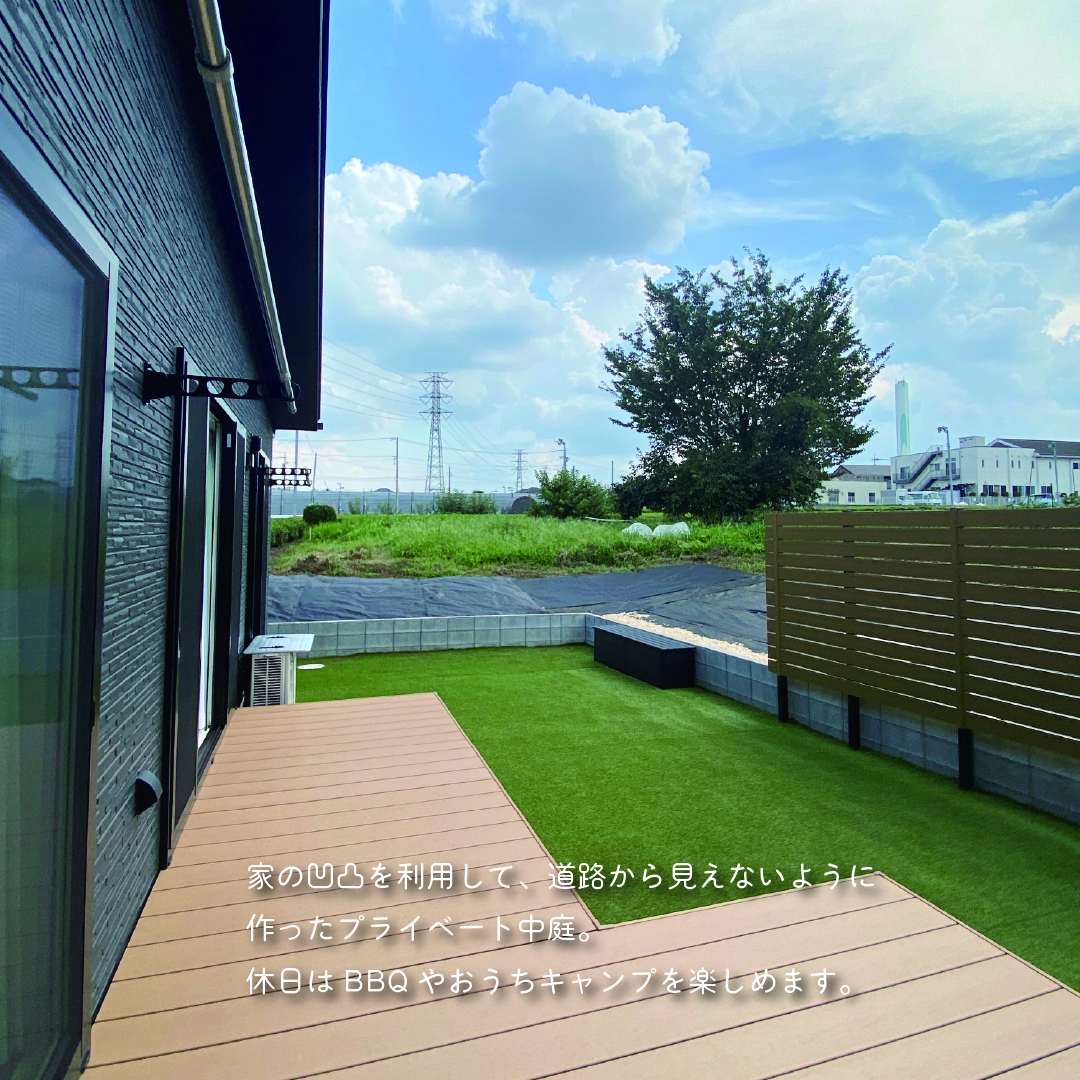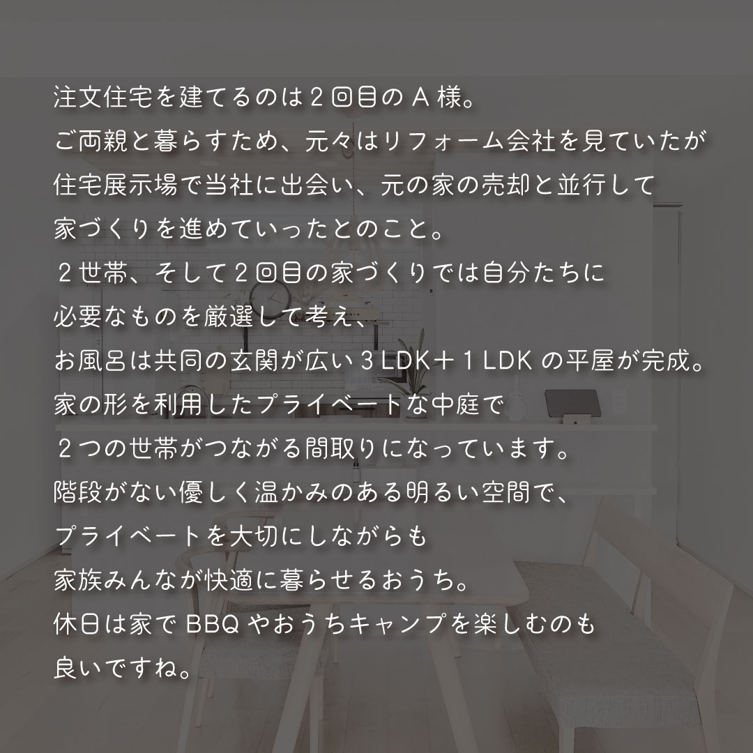 注文住宅を建てるのは2回目のA様。ご両親と暮らすため元々はリフォーム会社を見ていたが、住宅展示場で当社に出会い、元の家の売却と並行して家づくりを進められました。2世帯そして2回目の家づくりでは、自分たちに必要なものを厳選して考え、お風呂共同の玄関が広い3LDK+1LDKの二世帯平屋が完成。家の形を利用したプライベートな中庭で2つの世帯がつながる間取りになっています。階段がない優しく温かみのある明るい空間で、プライベートを大切にしながらも家族みんなが快適に暮らせるおうち。休日はお家でBBQやおうちキャンプを楽しむのも良いですね。