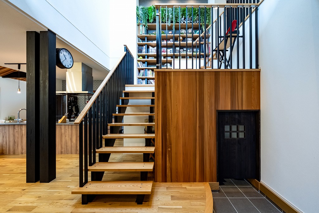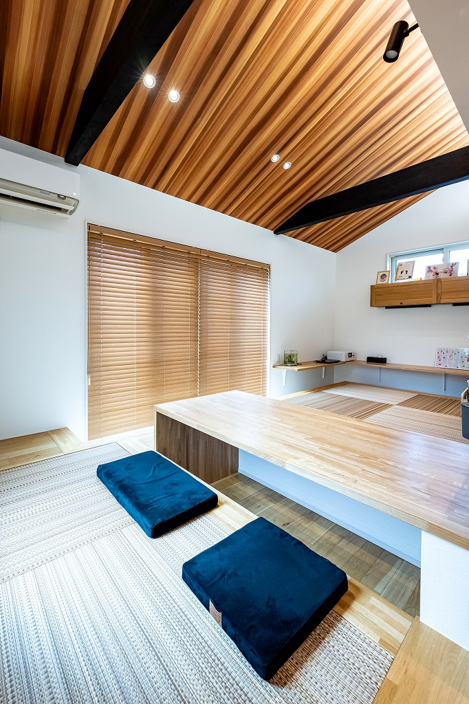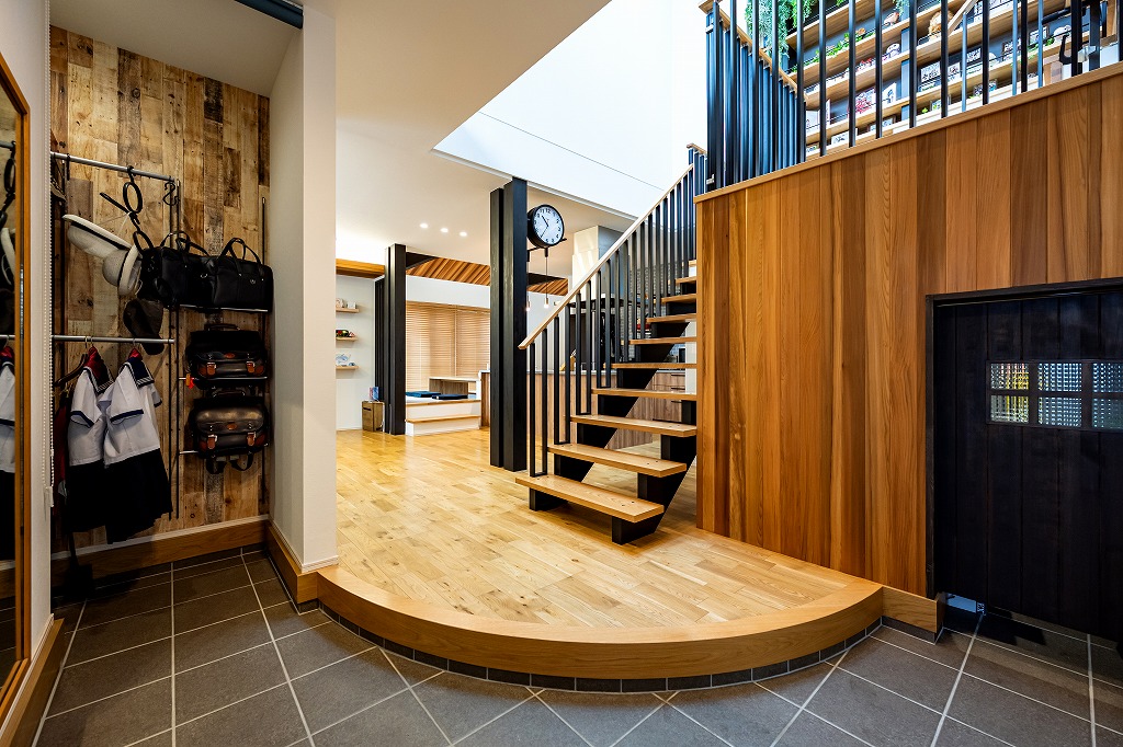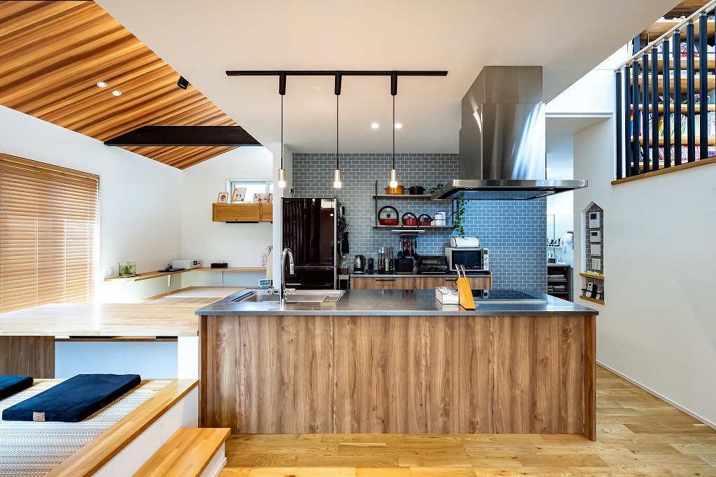 「展示場がとても気に入ったからアルネットホームに決めた」とお話してくれたM様。気に入った間取りや素材を自分たちの理想に合わせて変更し、たくさんの場所に取り入れました。ガレージ付きの2階建てのお家は自動開閉式シャッターのガレージ付き。ガレージは直接室内に繋がっており、雨の日も傘無しで室内へ入ることができます。玄関には吹き抜けと主役級のスキップフロア(本棚階段)があり、開放感のある空間が広がります。また、キッチンは食事の配膳やあと片付けがしやすいダイニング横付けタイプ。掘りごたつ式の和室のダイニングは天井が高く、お子さまたちが宿題をするスペースがあるのでわからないことがすぐに家族に聞けて、学習にも効率的です。