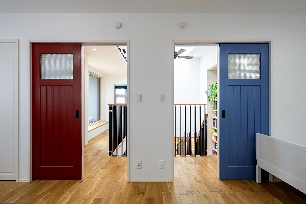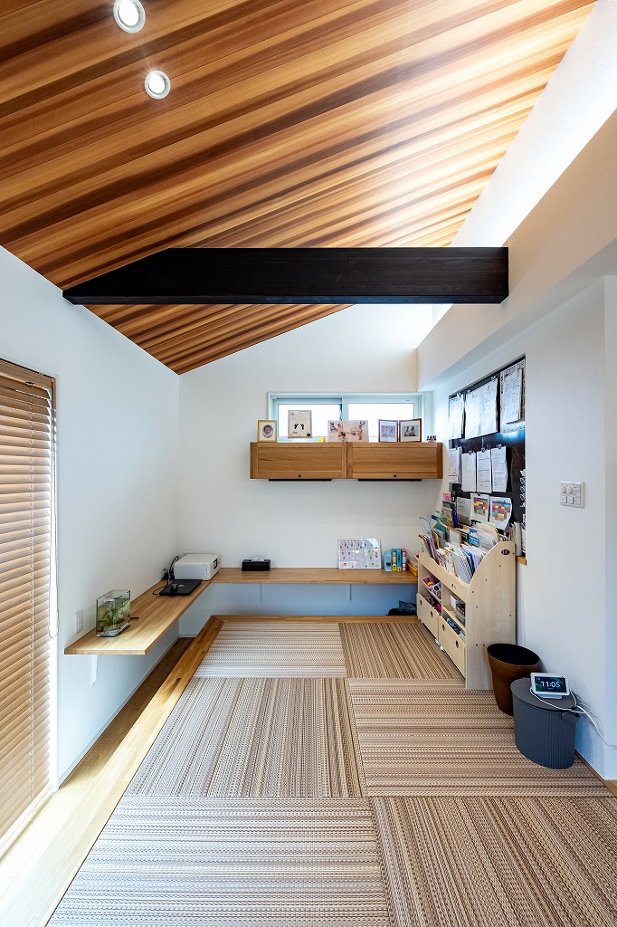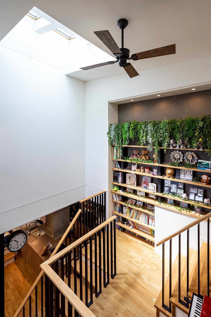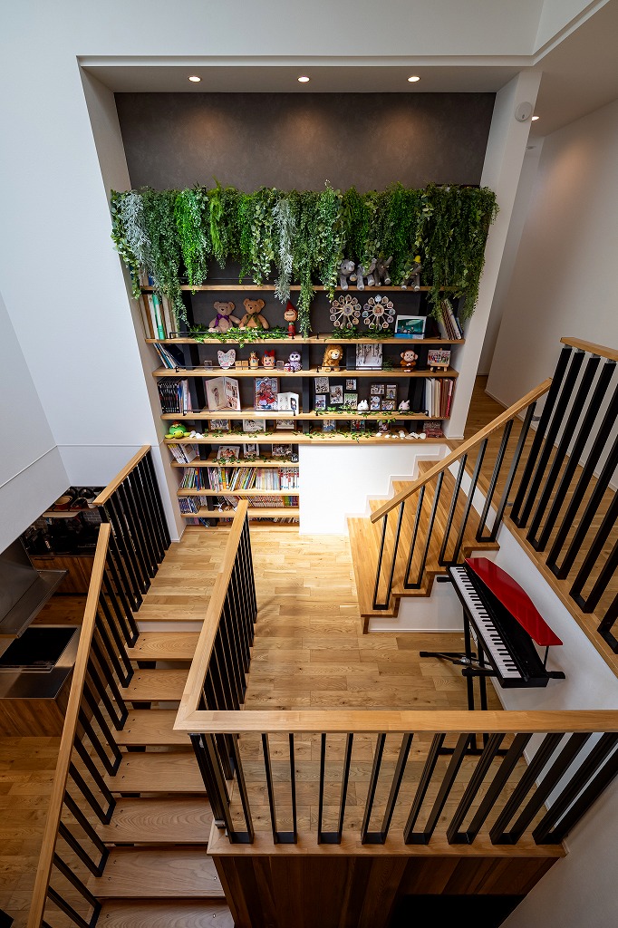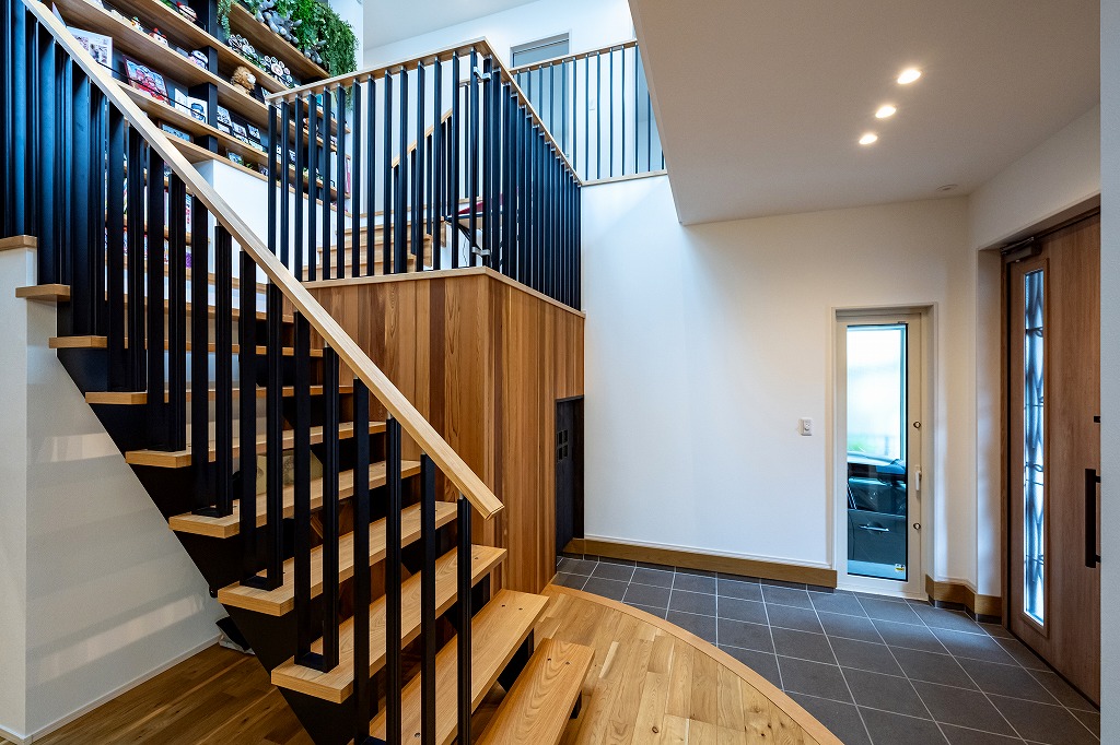 「展示場がとても気に入ったからアルネットホームに決めた」とお話してくれたM様。気に入った間取りや素材を自分たちの理想に合わせて変更し、たくさんの場所に取り入れました。ガレージ付きの2階建てのお家は自動開閉式シャッターのガレージ付き。ガレージは直接室内に繋がっており、雨の日も傘無しで室内へ入ることができます。玄関には吹き抜けと主役級のスキップフロア(本棚階段)があり、開放感のある空間が広がります。また、キッチンは食事の配膳やあと片付けがしやすいダイニング横付けタイプ。掘りごたつ式の和室のダイニングは天井が高く、お子さまたちが宿題をするスペースがあるのでわからないことがすぐに家族に聞けて、学習にも効率的です。