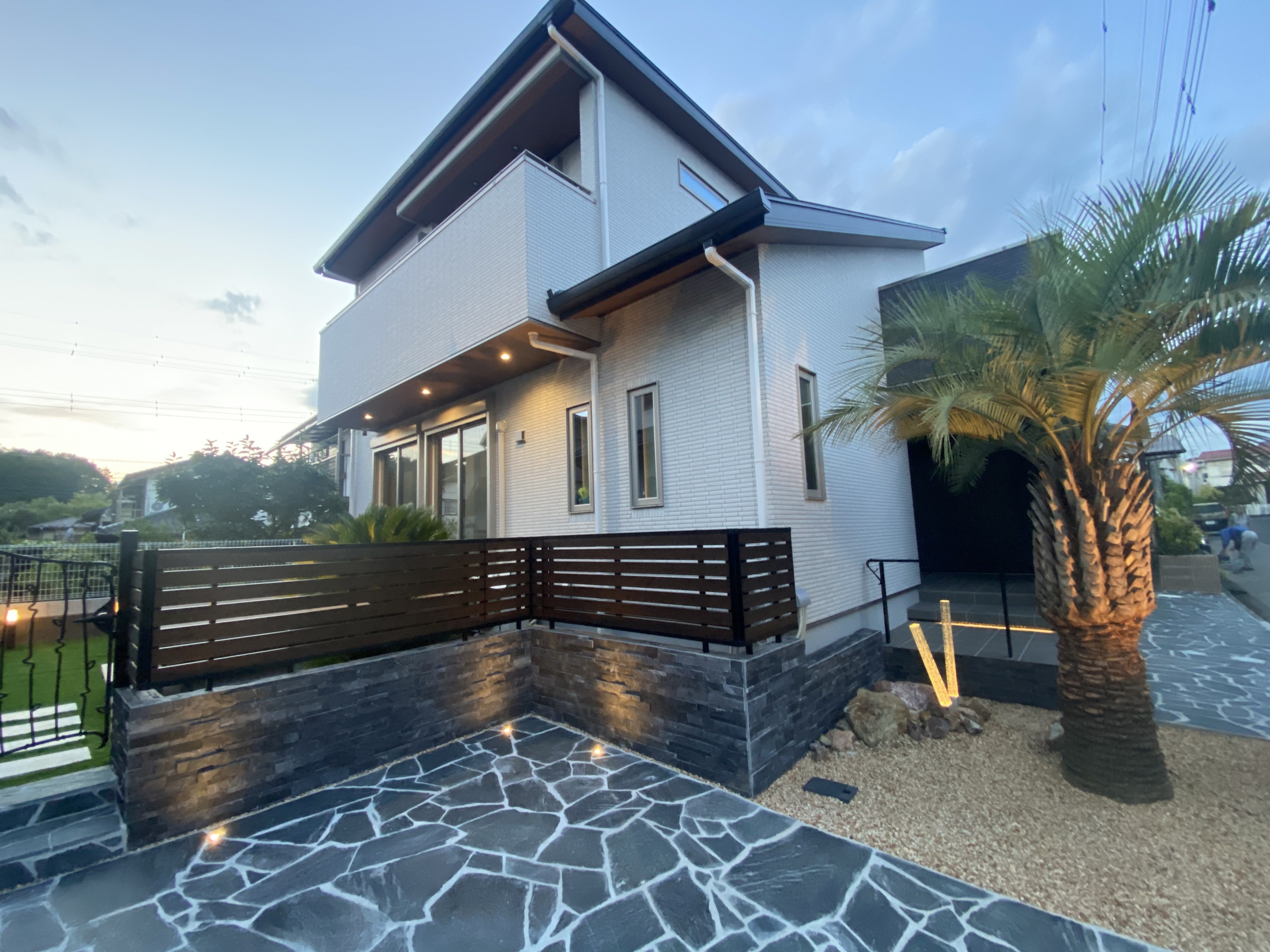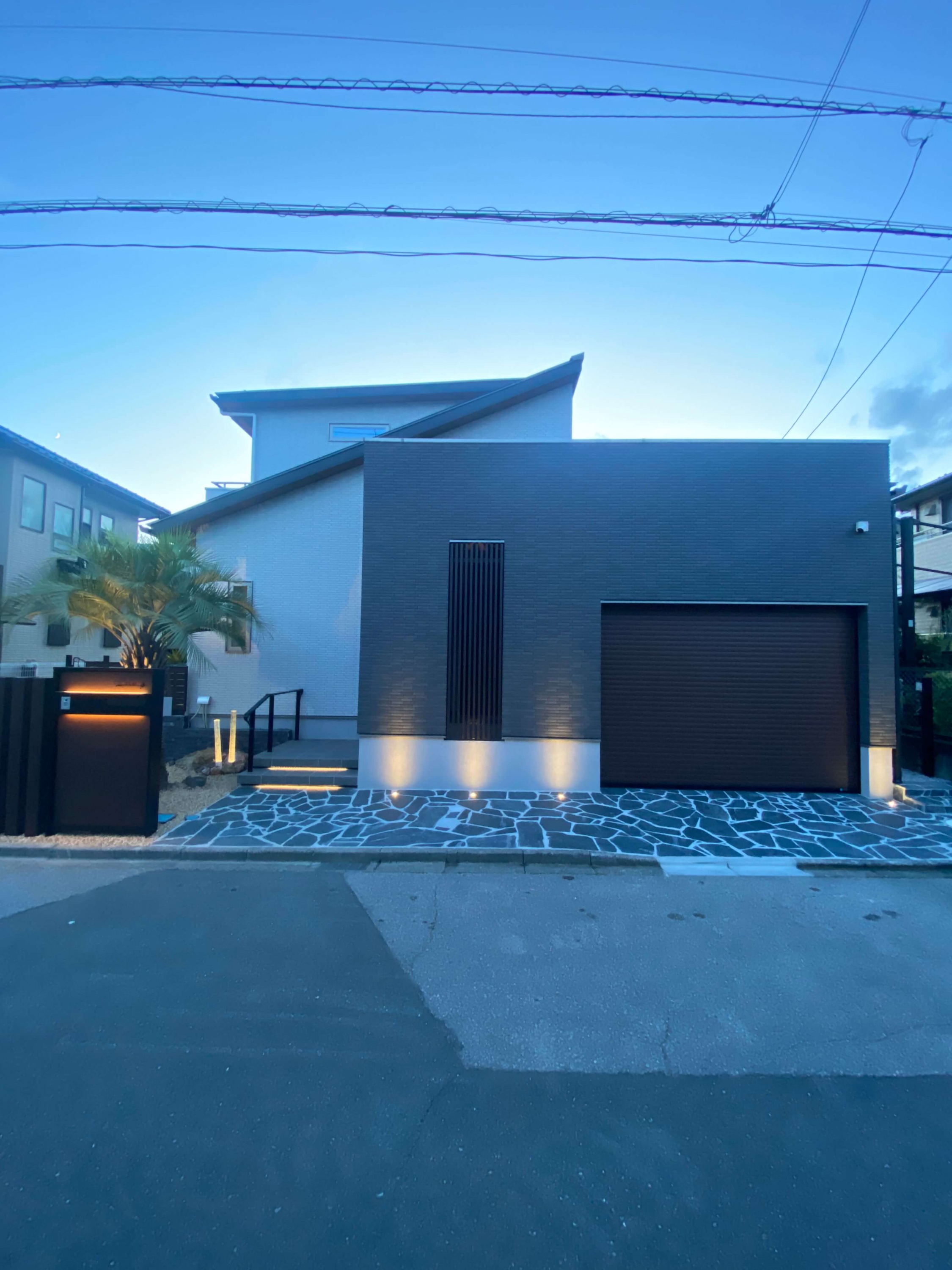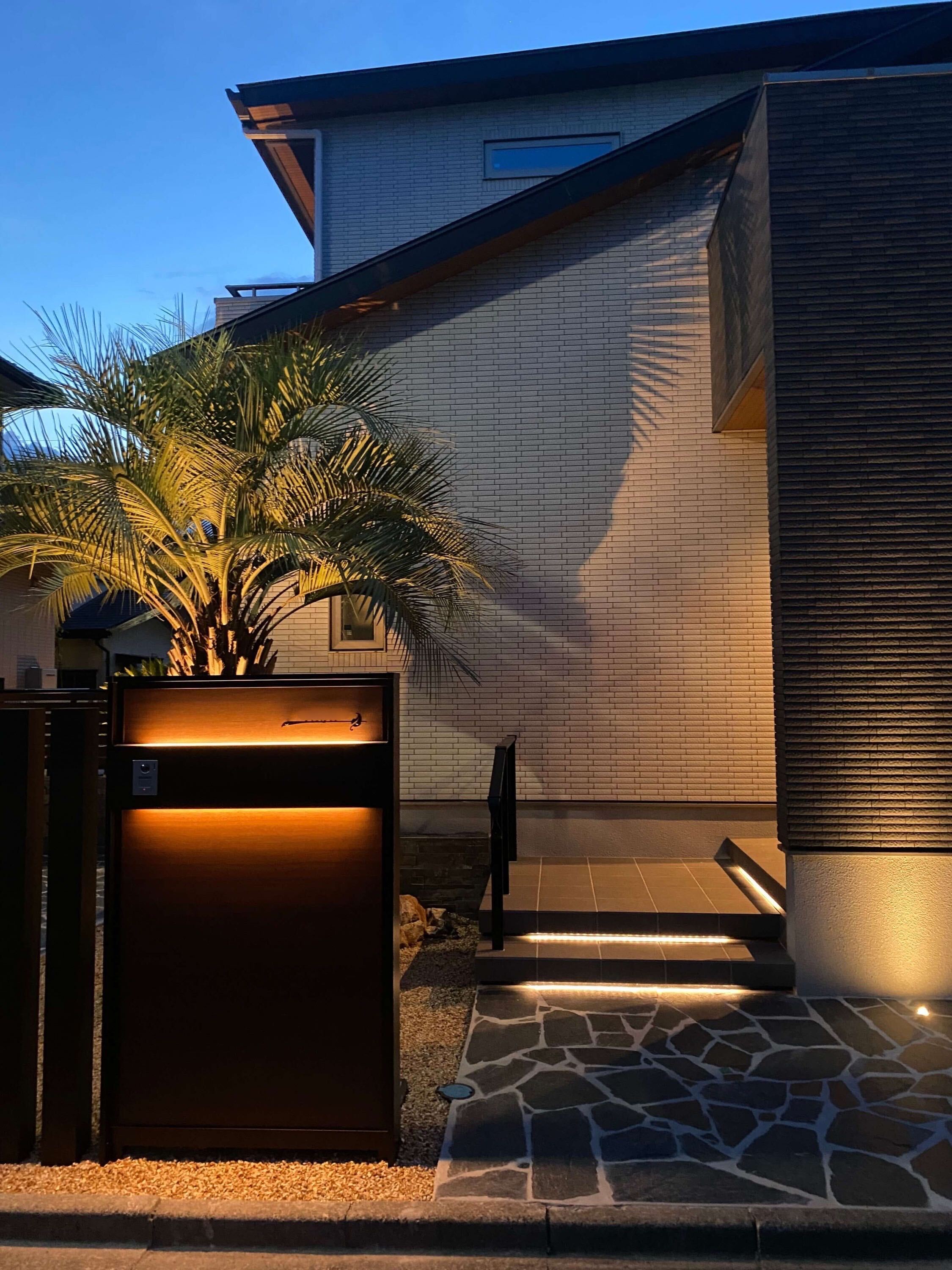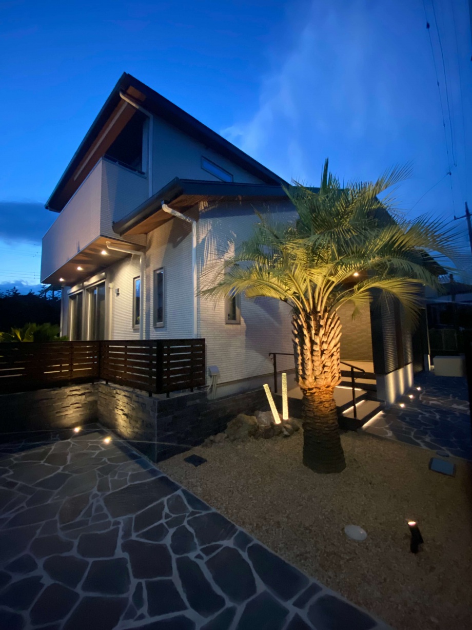 ライトアップが美しい、夜に映えるタイル外壁のお家。ヤシの木がシンボルとなった外構にモダンで洗練されたお家のデザインは、夜と朝で異なる表情を魅せてくれます。紫外線や雨風から大切な車を守るビルトインガレージは、電気自動車用のコンセントも完備。玄関は壁でワンクッション付けることで道路から直接ドアが見えない造りで、防犯面も安心。不動産関係のお仕事をされているご主人とアルネットホームで創った、外構までしっかりと計算されたお家です。