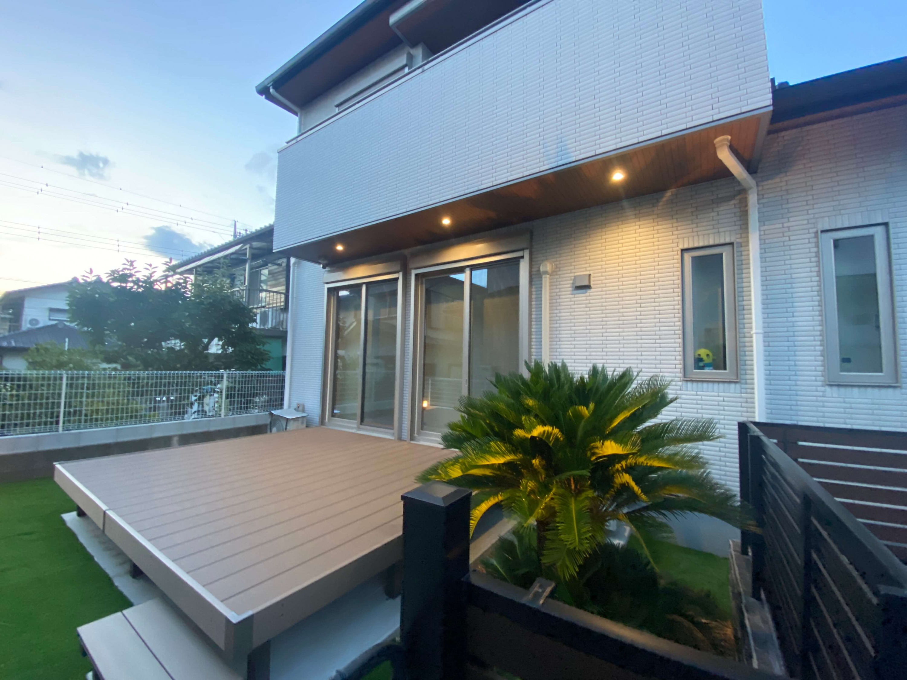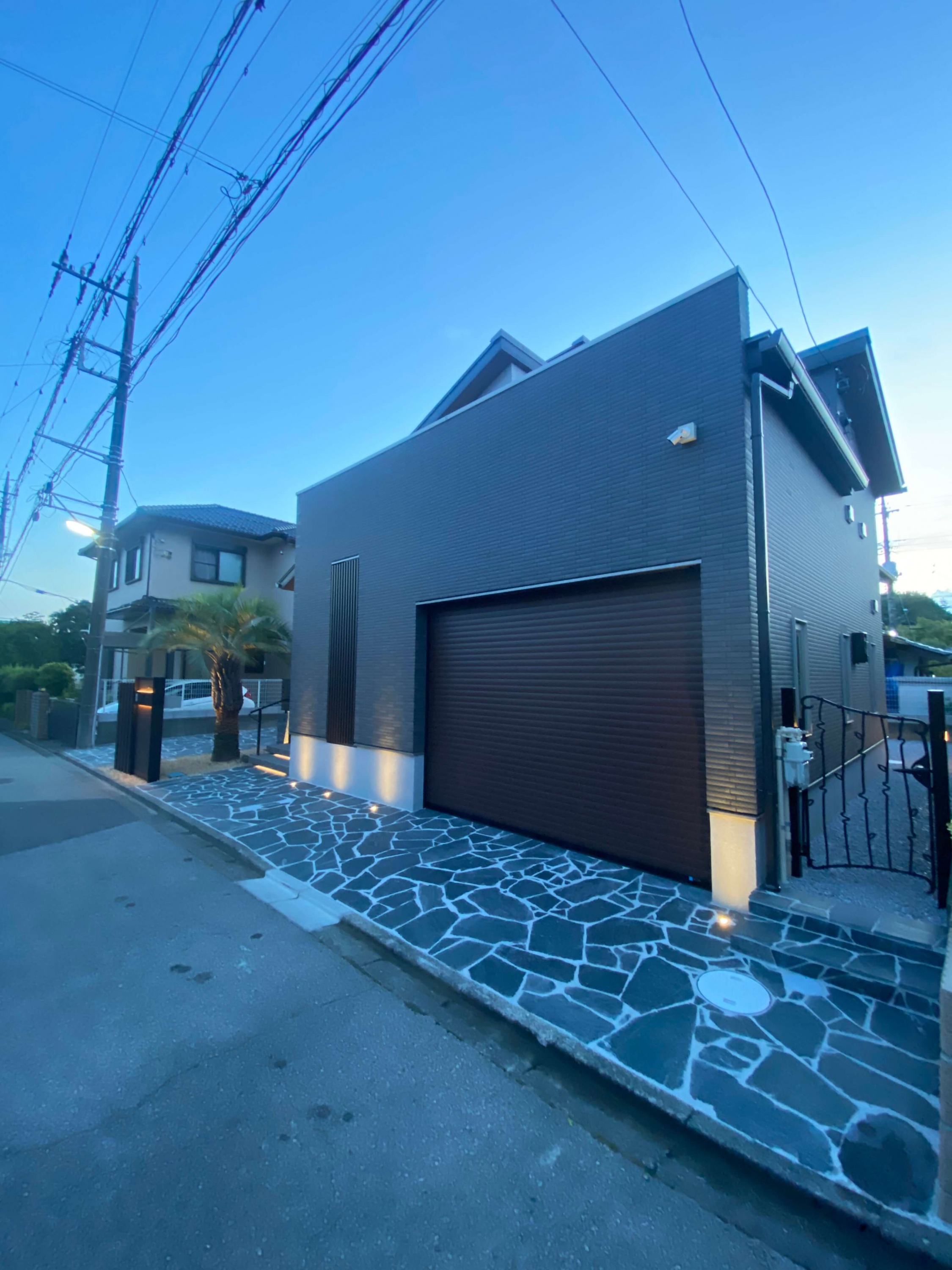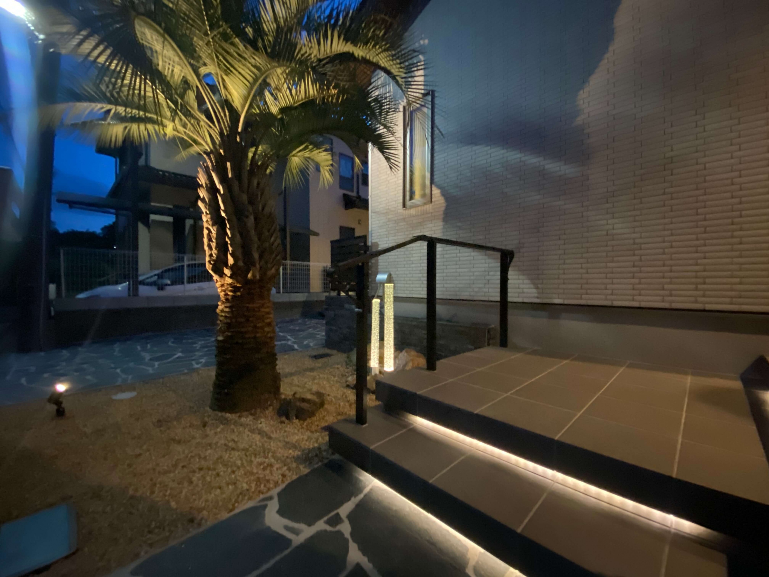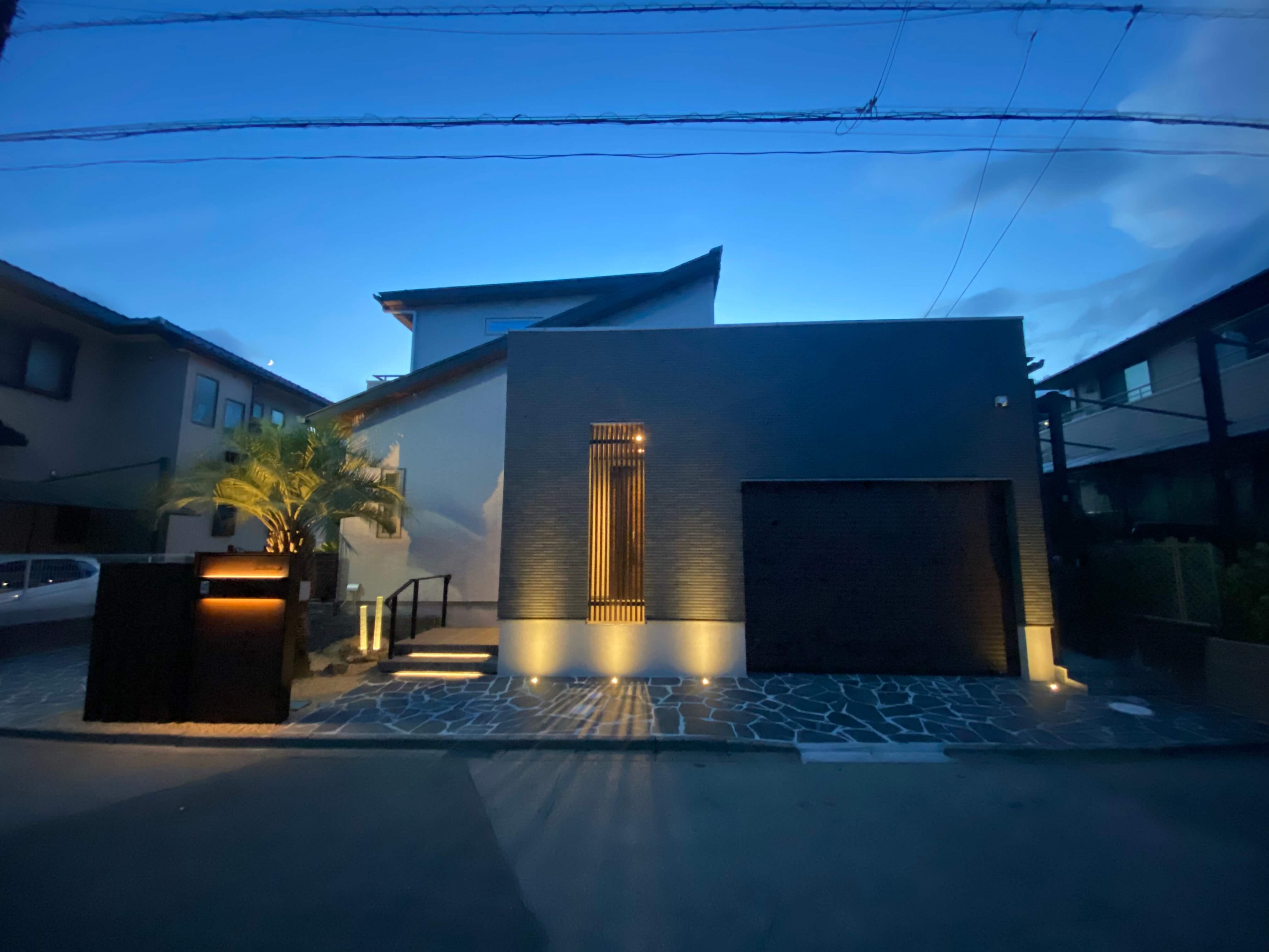ライトアップが美しい、夜に映えるタイル外壁のお家。ヤシの木がシンボルとなった外構にモダンで洗練されたお家のデザインは、夜と朝で異なる表情を魅せてくれます。紫外線や雨風から大切な車を守るビルトインガレージは、電気自動車用のコンセントも完備。玄関は壁でワンクッション付けることで道路から直接ドアが見えない造りで、防犯面も安心。不動産関係のお仕事をされているご主人とアルネットホームで創った、外構までしっかりと計算されたお家です。