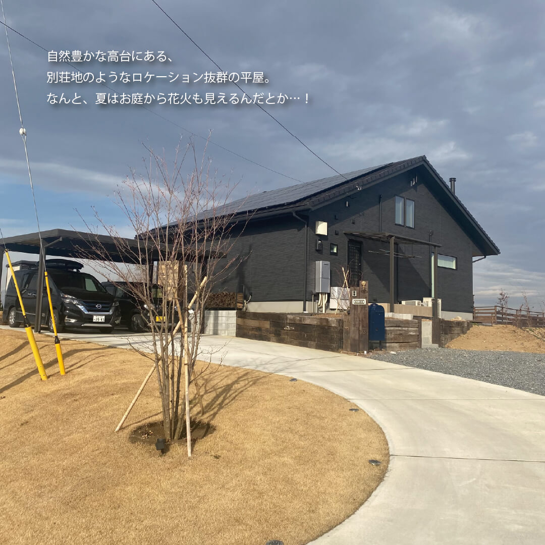 高台の上という立地を生かし、外と中の繋がりを意識した平屋。陽を遮るものがなく、冬もポカポカ気持ちよく、夏はお庭から花火が見える最高のロケーション!家づくりのきっかけは、お子さんが巣立ったあと、お料理を楽しみながら愛犬と毎日楽しく暮らしたかったから。外の景色を楽しみながらお料理ができるコの字型のキッチンやわんちゃんが喜ぶドッグラン、洗濯物を極力畳まずに収納できるランドリールーム、快適な温度のまま寝ることのできるスキップフロア寝室、回遊できるテレワークスペースなど、毎日の生活が便利に楽しめる、愛が溢れたおうちです。