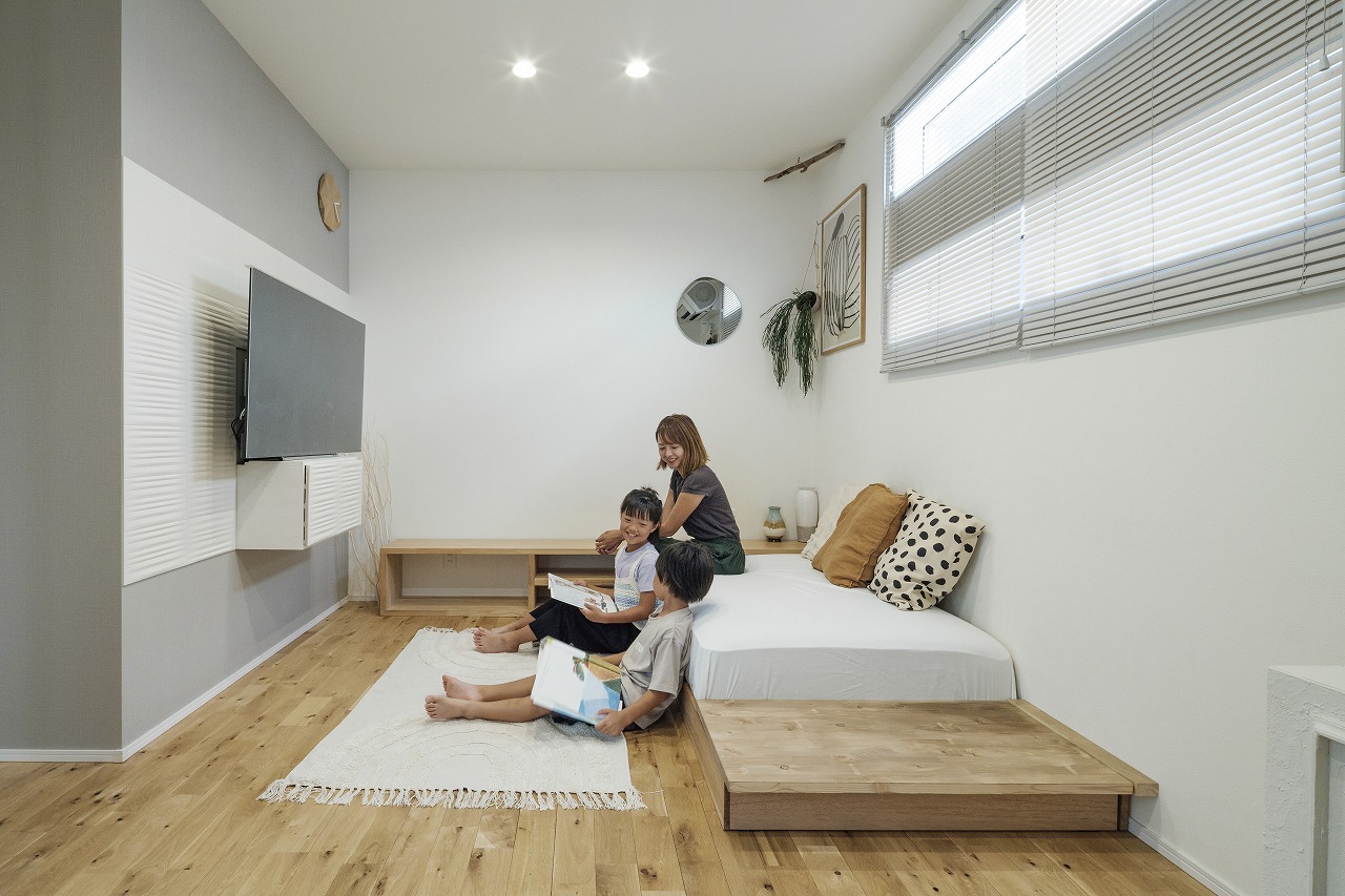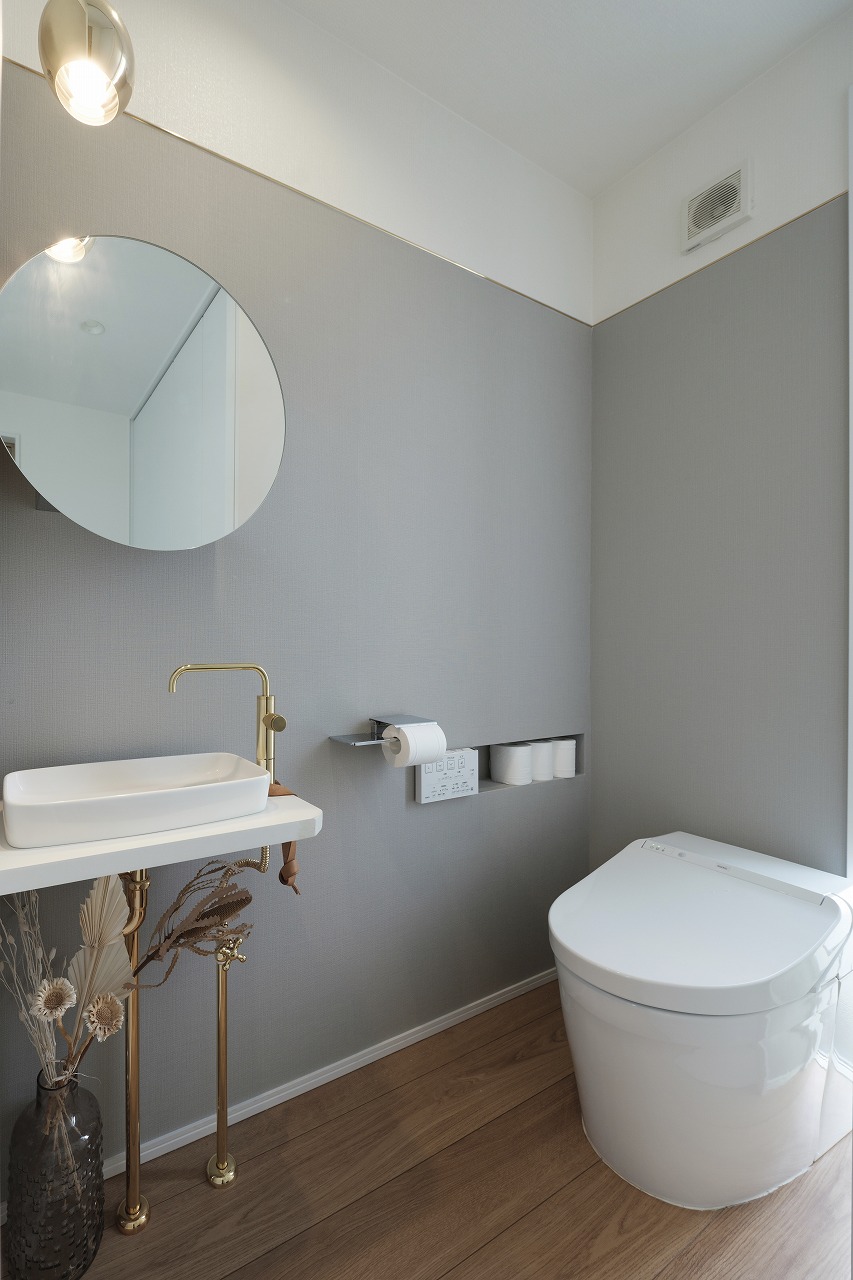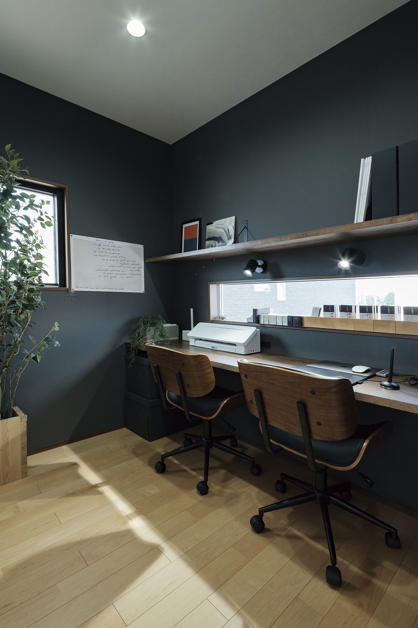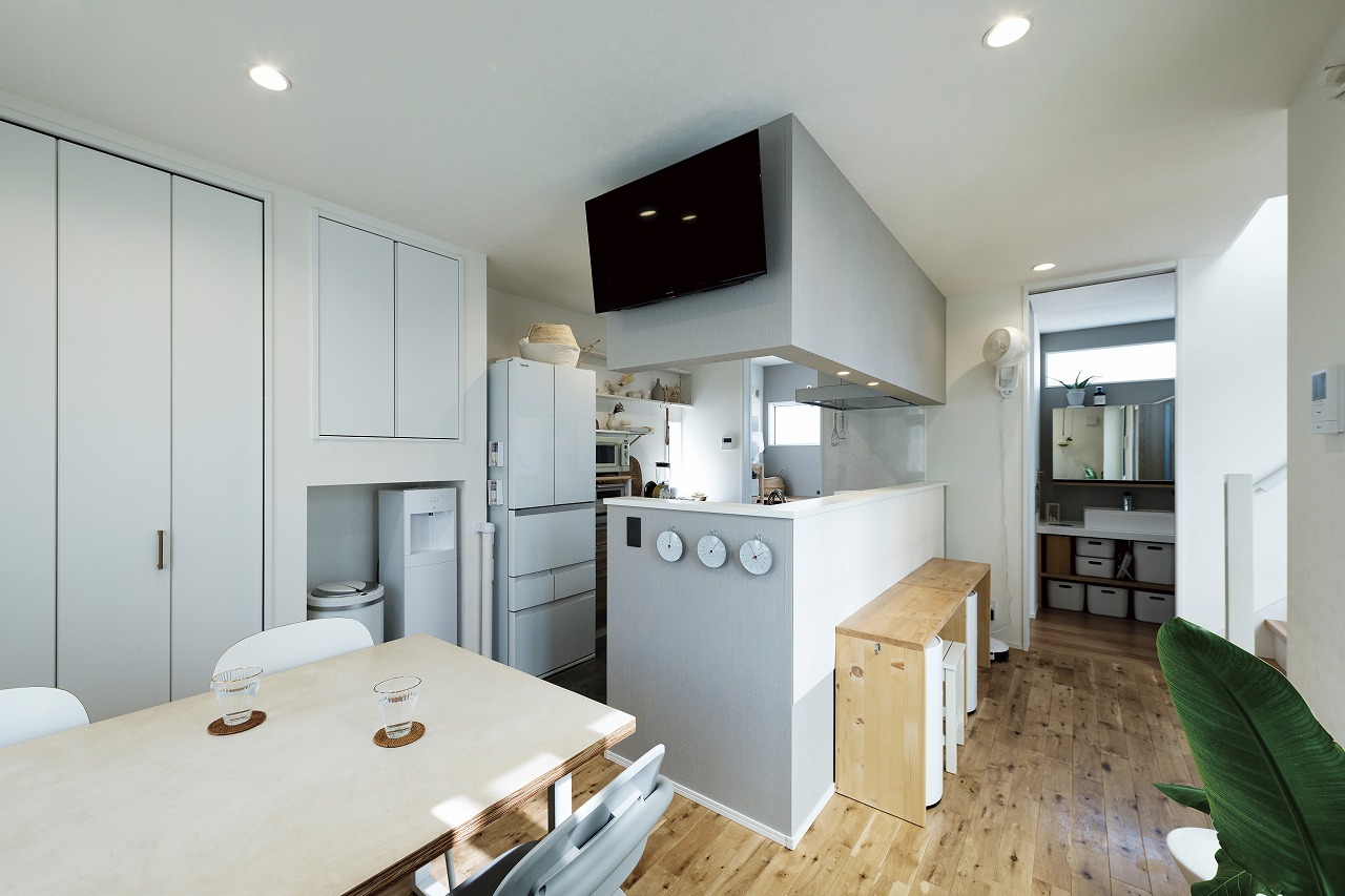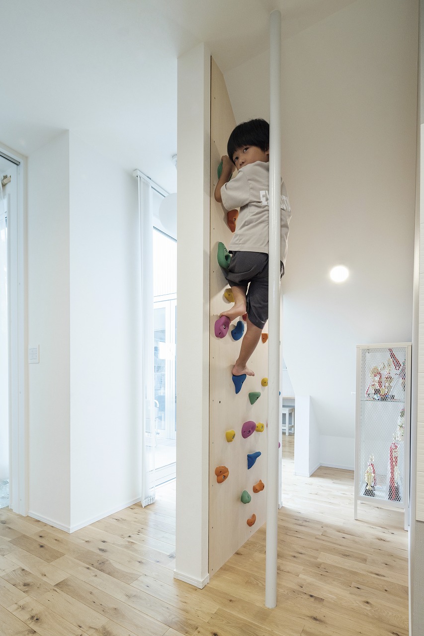 DIYで日々新しい暮らしの形を見せてくれる、ホテルライクなデザインのコの字型2階建ての家。新しい家での暮らし方を徹底的に考えてゾーニングしたLDKは、リビングとダイニングを別々に設けています。造作洗面やガラス貼りドアのお風呂、3帖のコンパクトなお部屋、魅せるトイレ、突然の来客にも困らない収納などL様ならではのこだわりが盛りだくさん。遊び心のあるボルダリングスペースにも注目です。