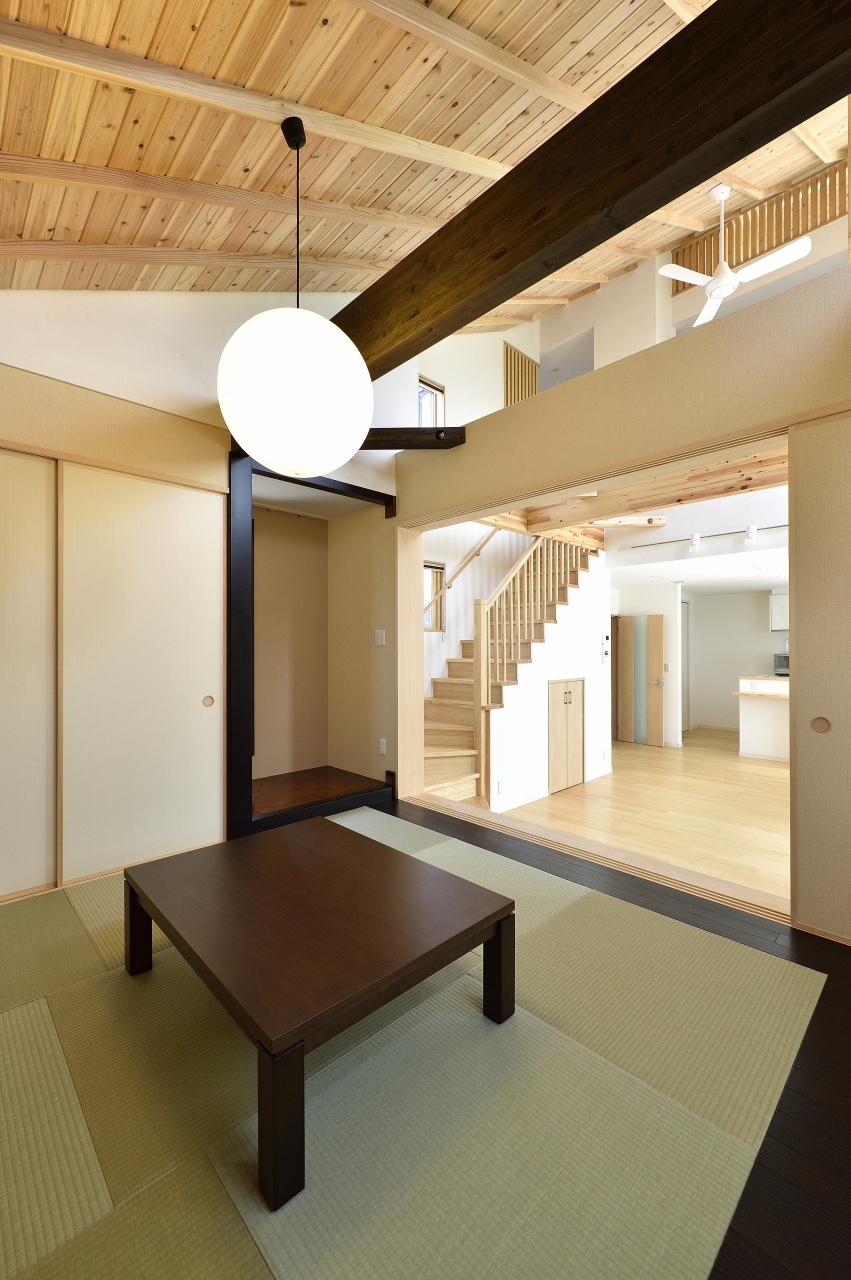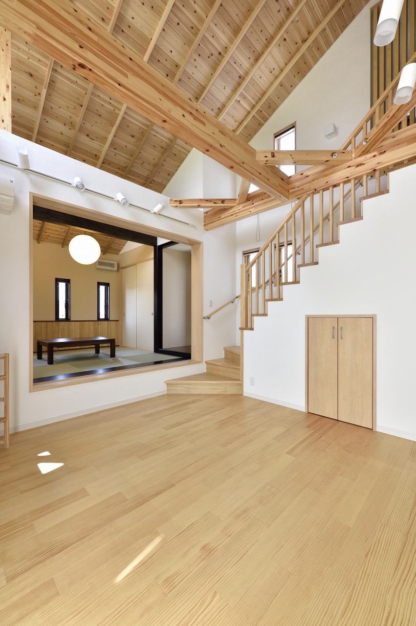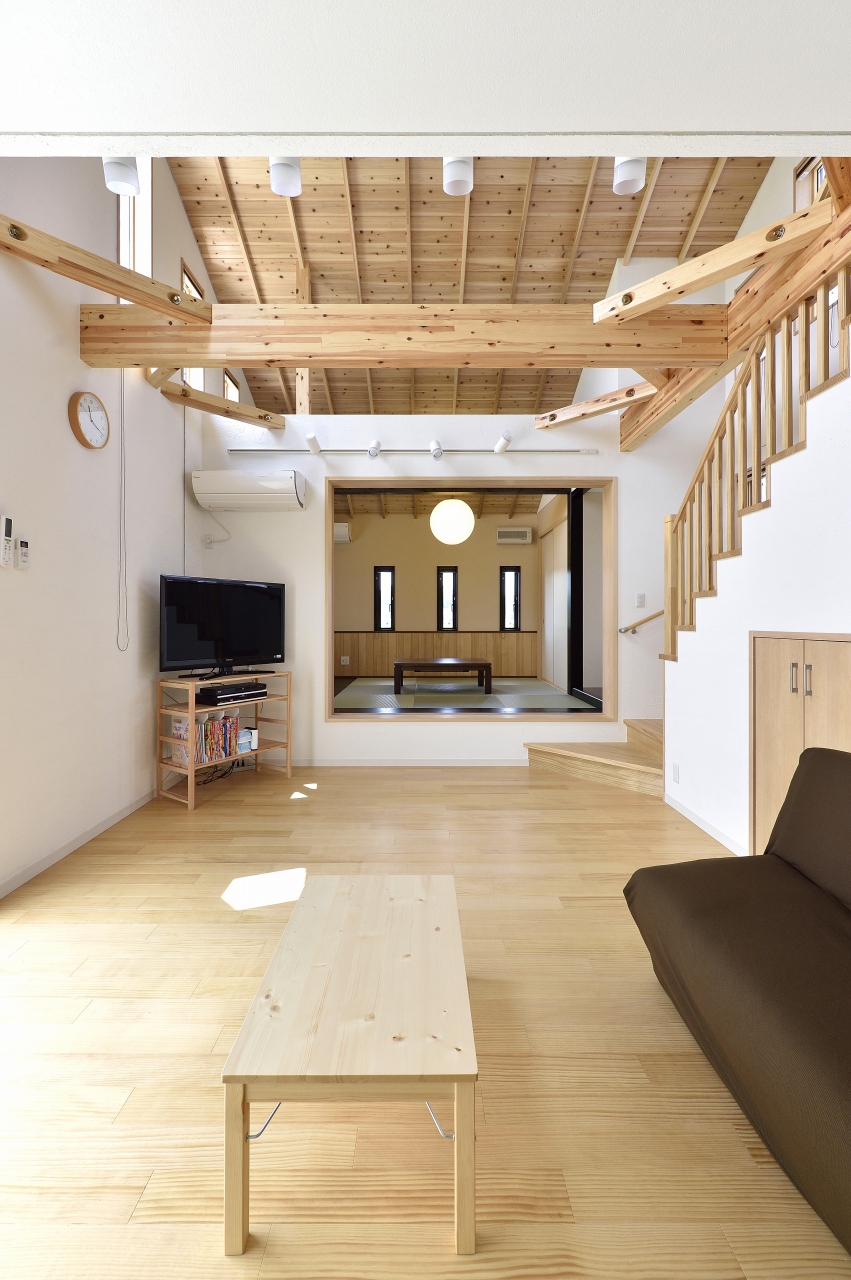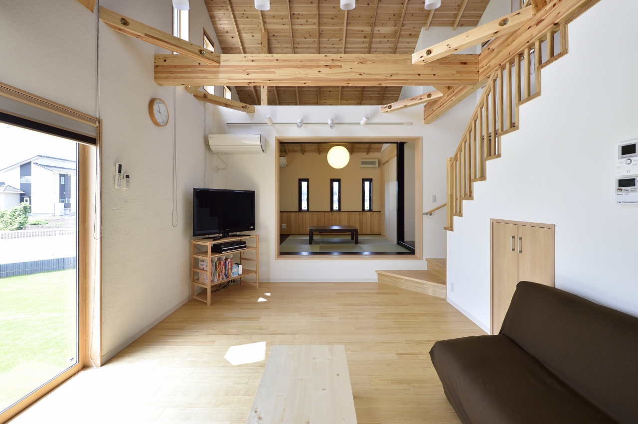 全身が木に包まれるかのような木のぬくもりと開放感を味わえるK様邸。和をイメージした内装で落ち着きのある空間が広がります。自然光が射し込むLDKには小上がりで座って使えるタタミコーナーが隣接。家族が集まる憩いの場として癒しを与えます。