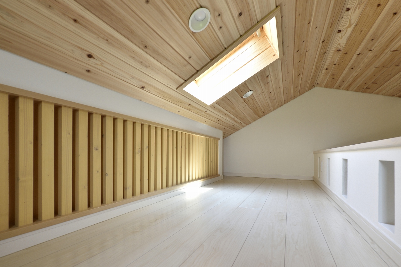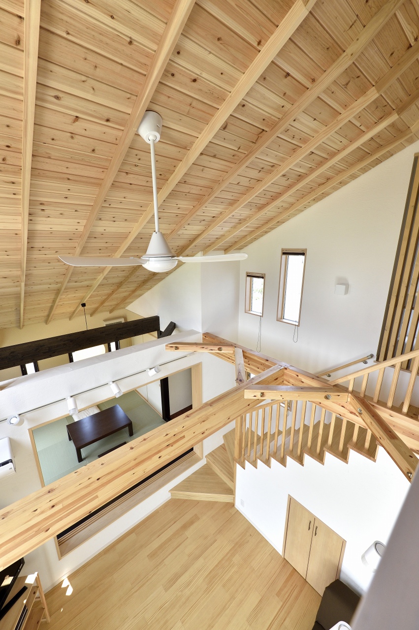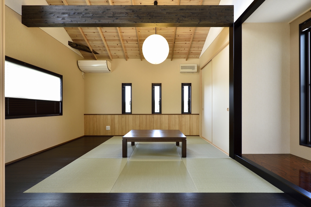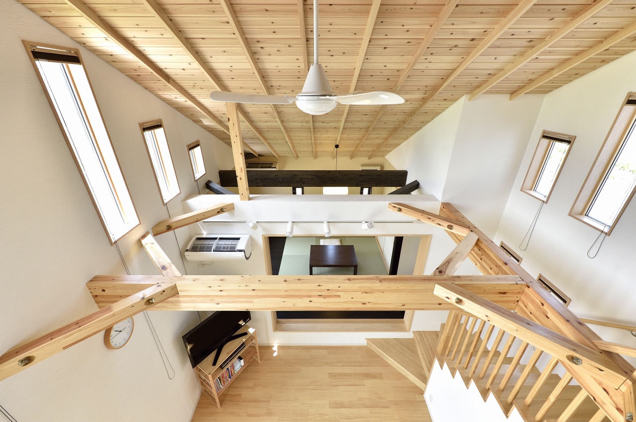 全身が木に包まれるかのような木のぬくもりと開放感を味わえるK様邸。和をイメージした内装で落ち着きのある空間が広がります。自然光が射し込むLDKには小上がりで座って使えるタタミコーナーが隣接。家族が集まる憩いの場として癒しを与えます。