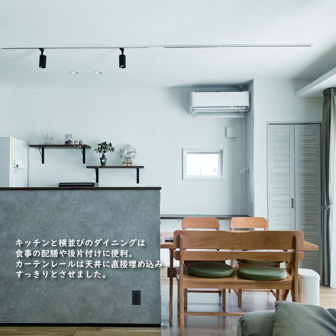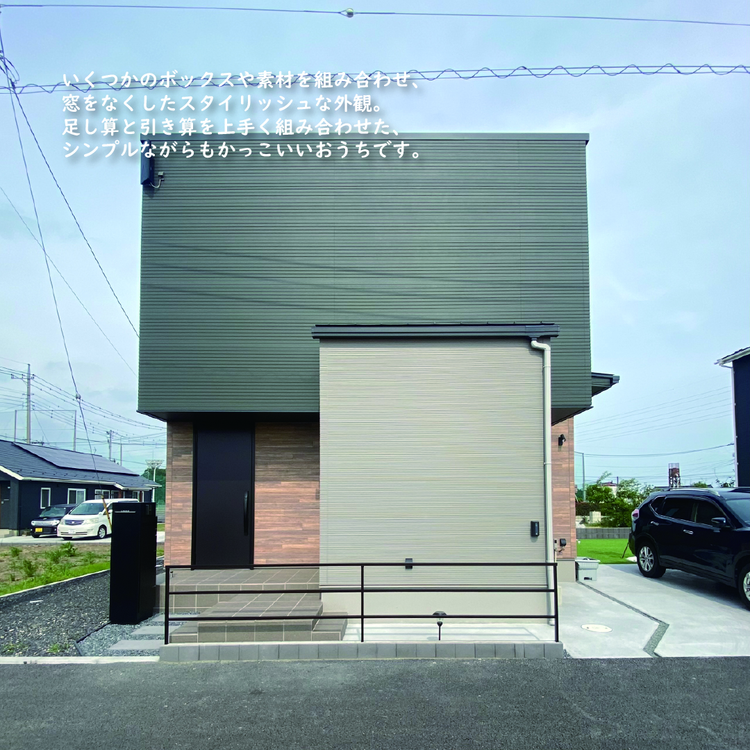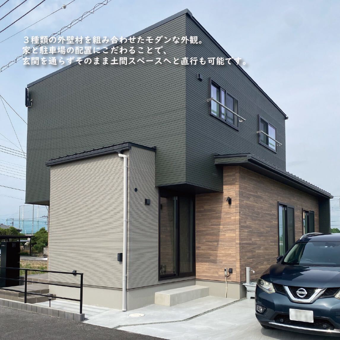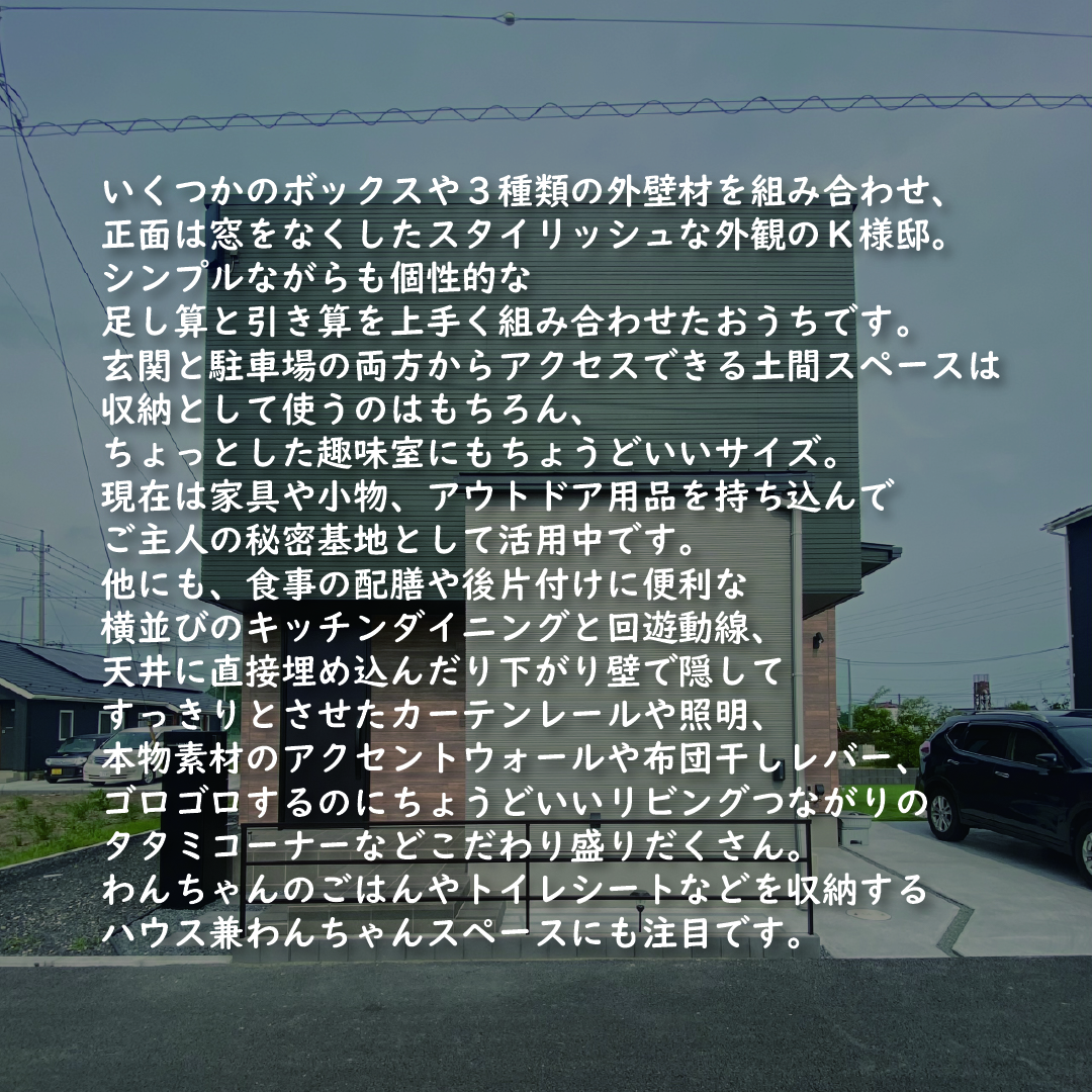 いくつかのボックスや3種類の外壁材を組み合わせ、正面は窓をなくしたスタイリッシュな外観のK様邸。 シンプルながらも個性的な足し算と引き算を上手く組み合わせたおうちです。玄関と駐車場の両方からアクセスできる土間スペースは 収納として使うのはもちろん、ちょっとした趣味室にもちょうどいいサイズ。現在は家具や小物、 アウトドア用品を持ち込んでご主人の秘密基地として活用中です。他にも、食事の配膳や後片付けに便利な 横並びのキッチンダイニングと回遊動線、 天井に直接埋め込んだり下がり壁で隠してすっきりとさせたカーテンレールや照明、本物素材のアクセントウォールや布団干しレバー、 ゴロゴロするのにちょうどいいリビングつながりの タタミコーナーなどこだわり盛りだくさん。わんちゃんのごはんやトイレシートなどを収納する ハウス兼わんちゃんスペースにも注目です。