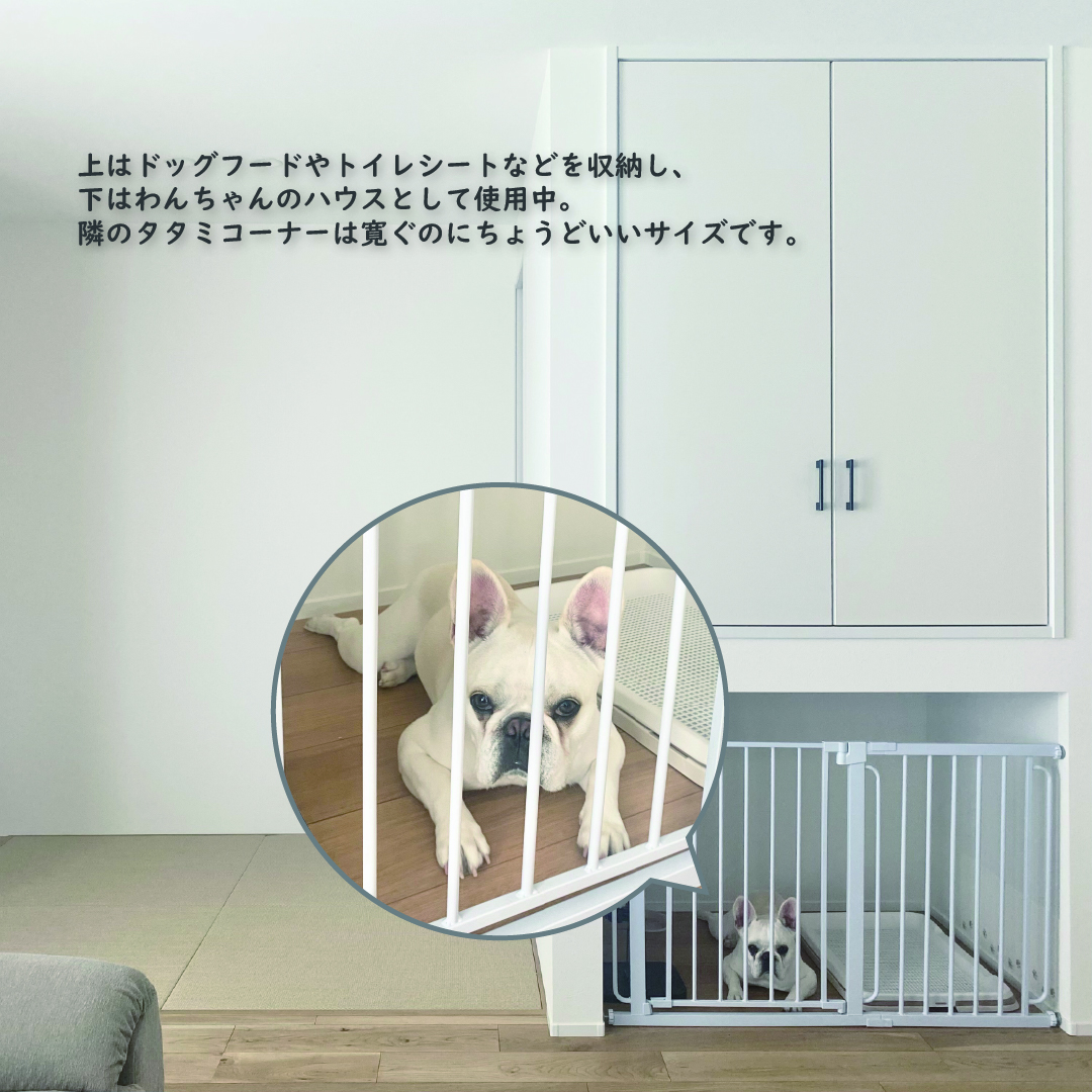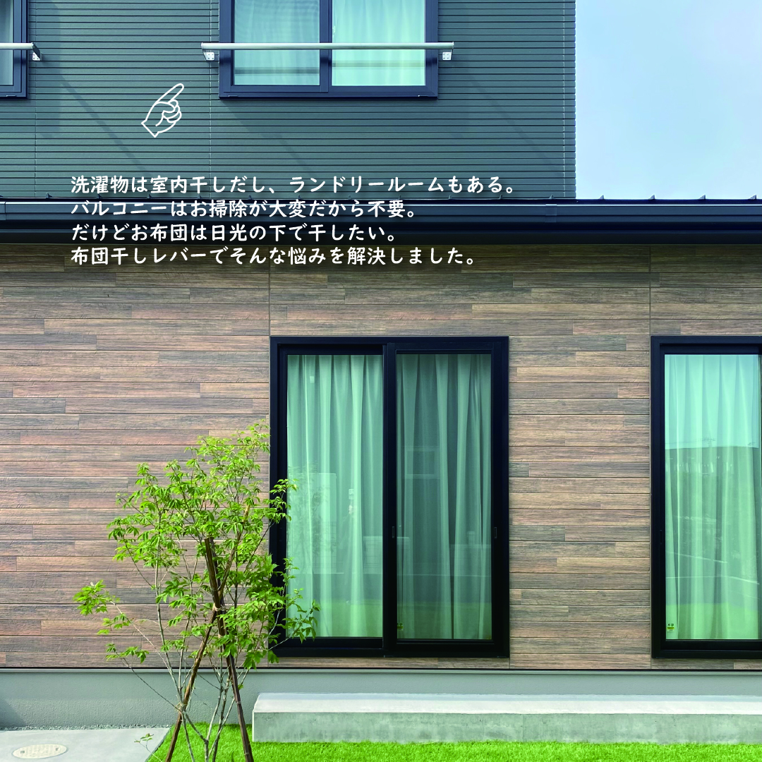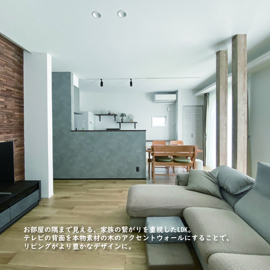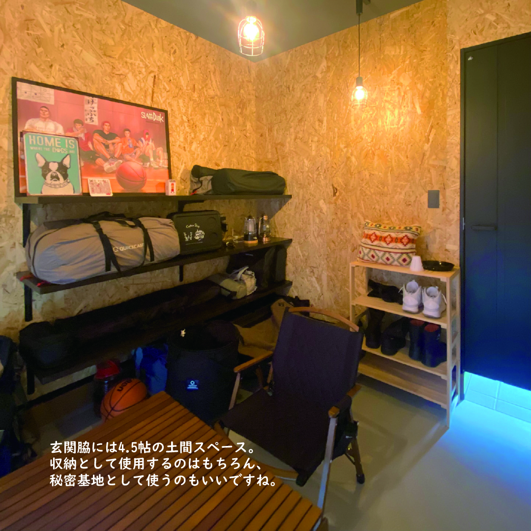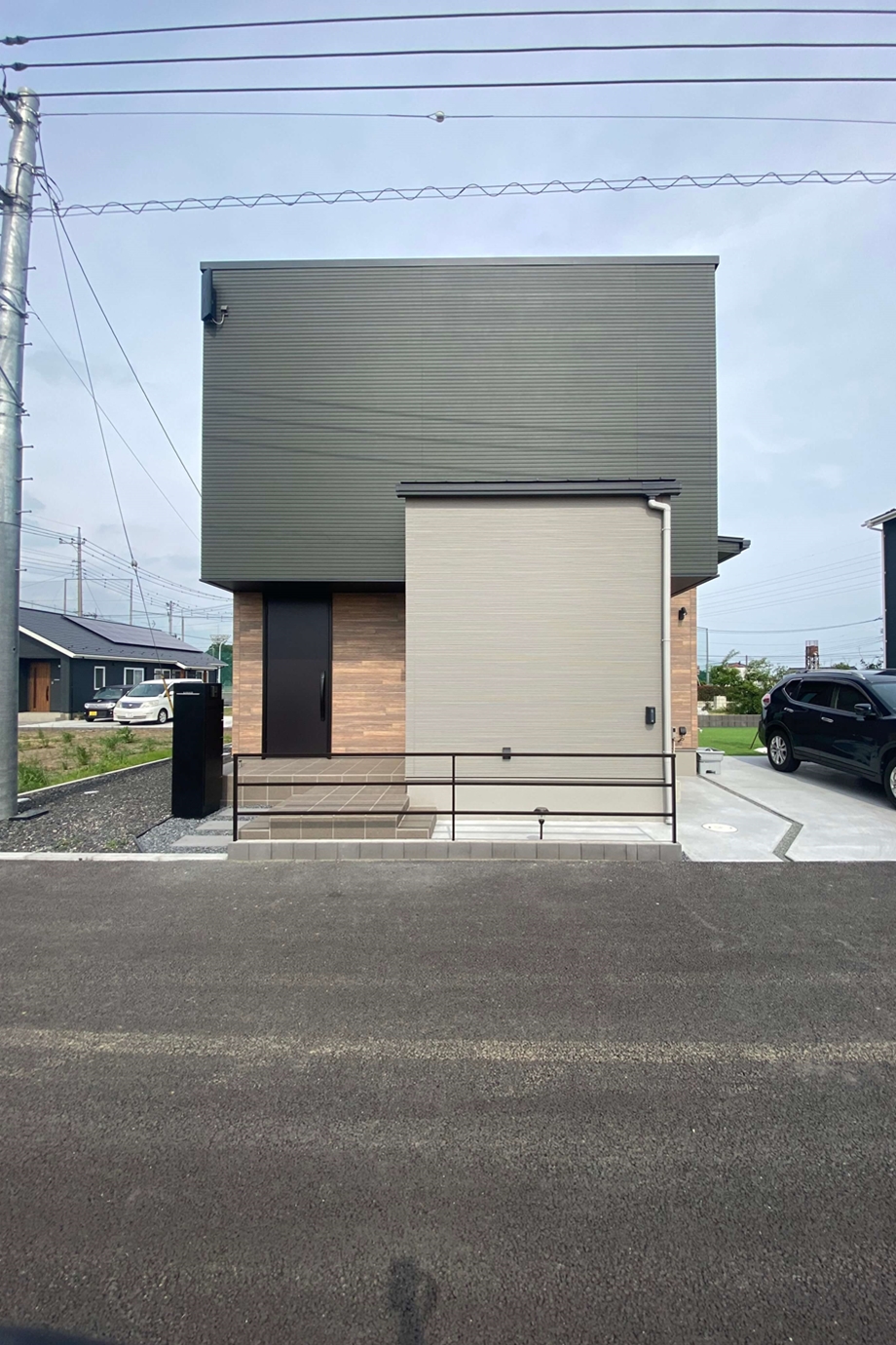 いくつかのボックスや3種類の外壁材を組み合わせ、正面は窓をなくしたスタイリッシュな外観のK様邸。 シンプルながらも個性的な足し算と引き算を上手く組み合わせたおうちです。玄関と駐車場の両方からアクセスできる土間スペースは 収納として使うのはもちろん、ちょっとした趣味室にもちょうどいいサイズ。現在は家具や小物、 アウトドア用品を持ち込んでご主人の秘密基地として活用中です。他にも、食事の配膳や後片付けに便利な 横並びのキッチンダイニングと回遊動線、 天井に直接埋め込んだり下がり壁で隠してすっきりとさせたカーテンレールや照明、本物素材のアクセントウォールや布団干しレバー、 ゴロゴロするのにちょうどいいリビングつながりの タタミコーナーなどこだわり盛りだくさん。わんちゃんのごはんやトイレシートなどを収納する ハウス兼わんちゃんスペースにも注目です。