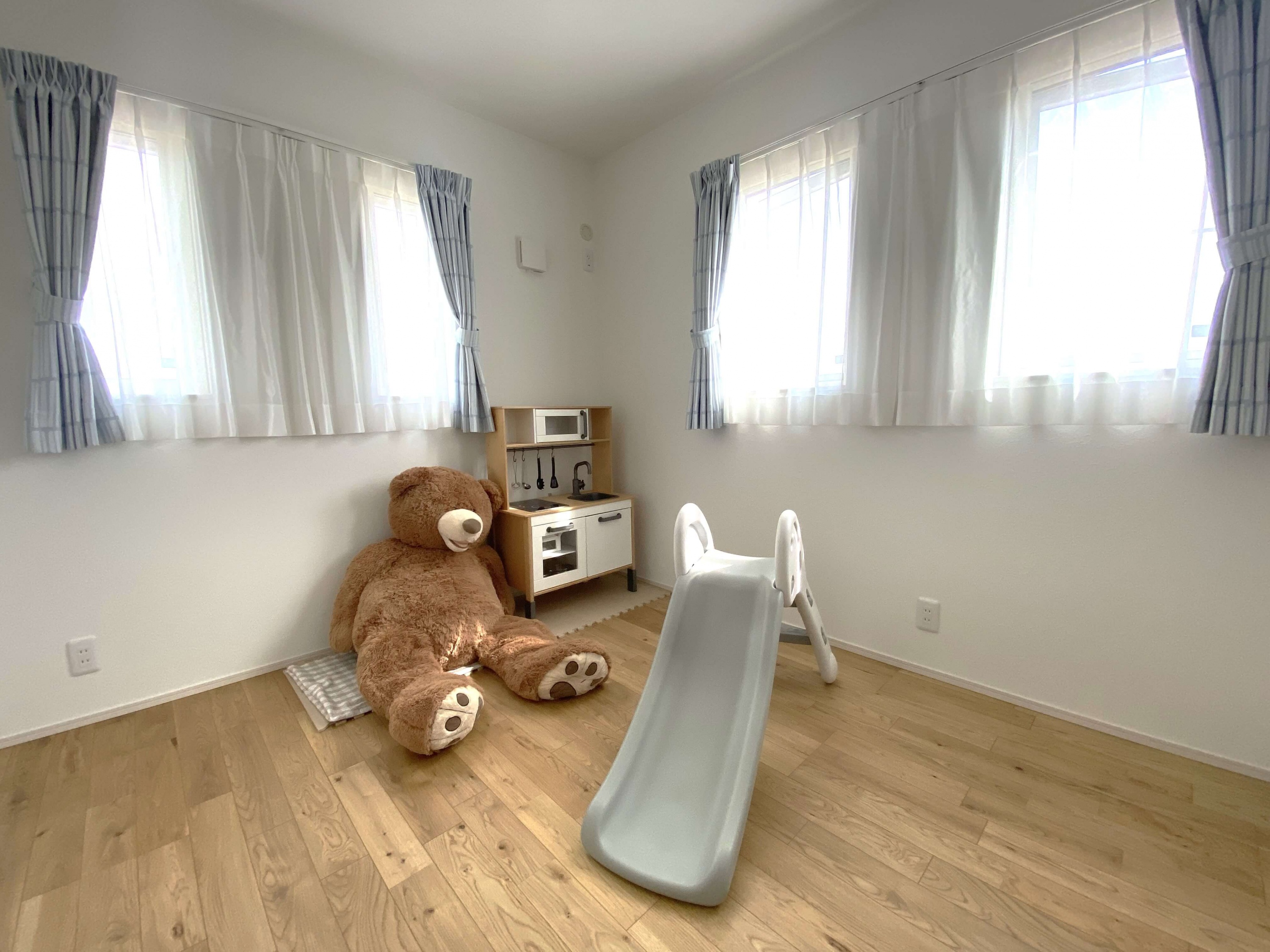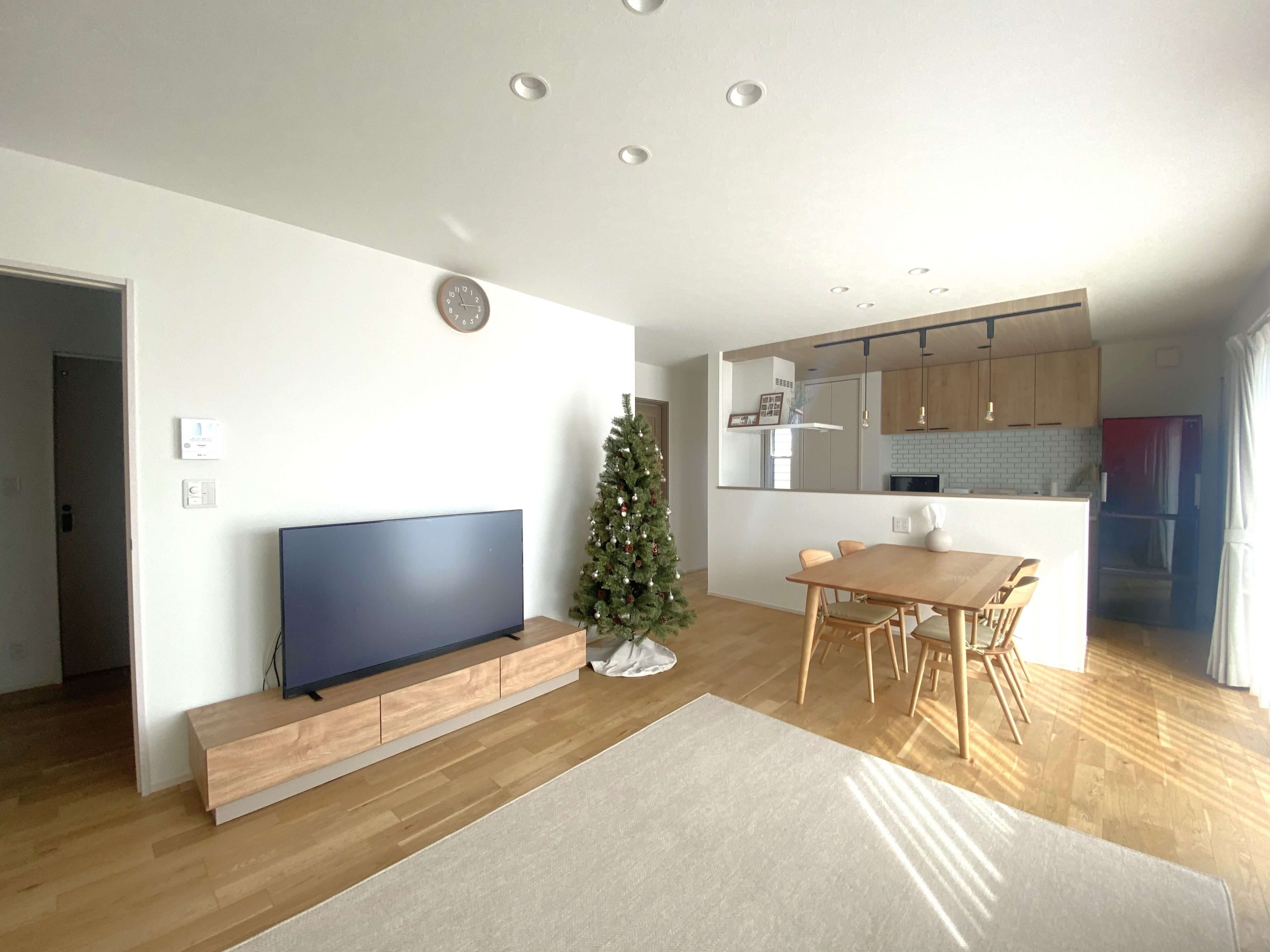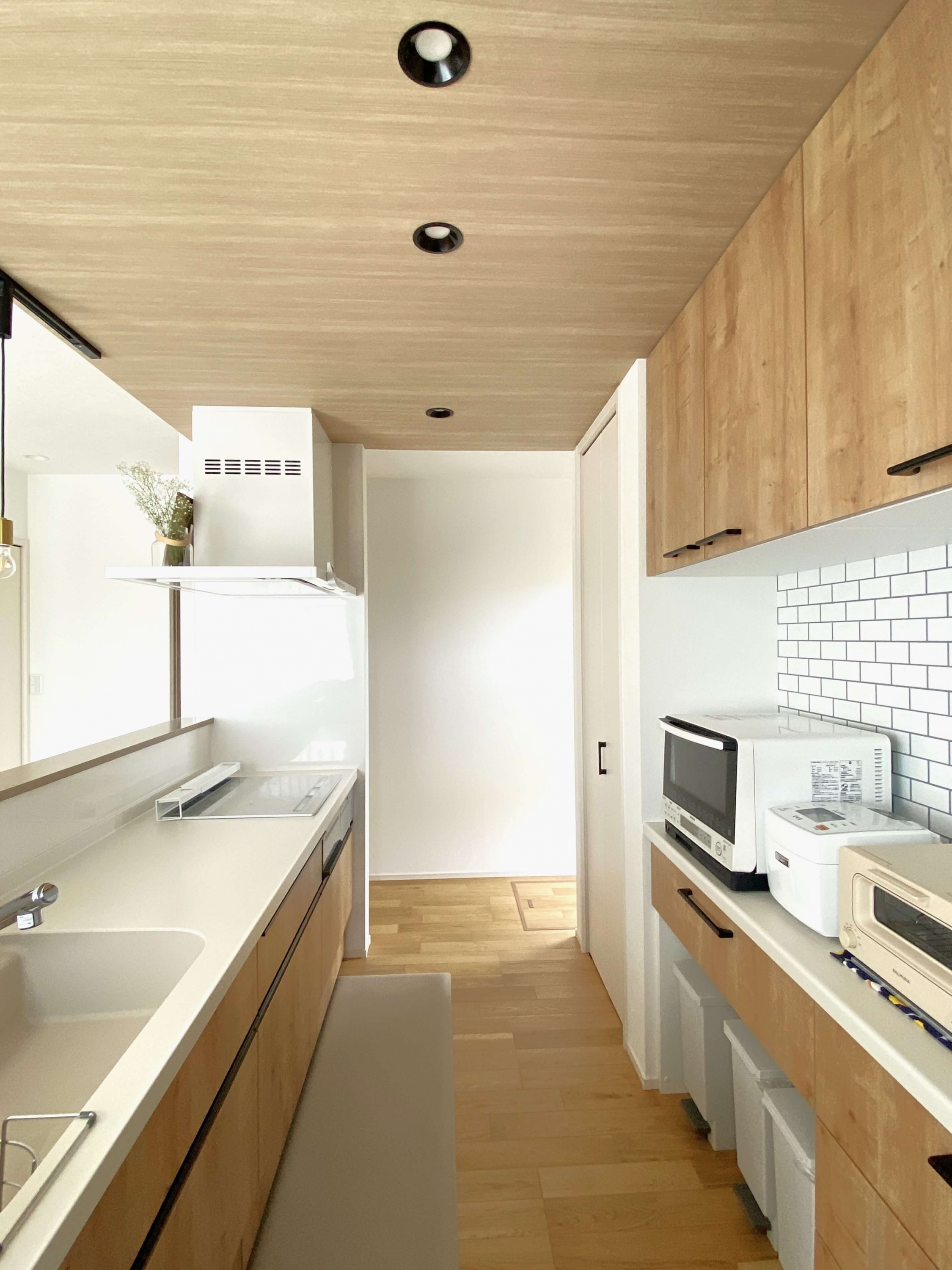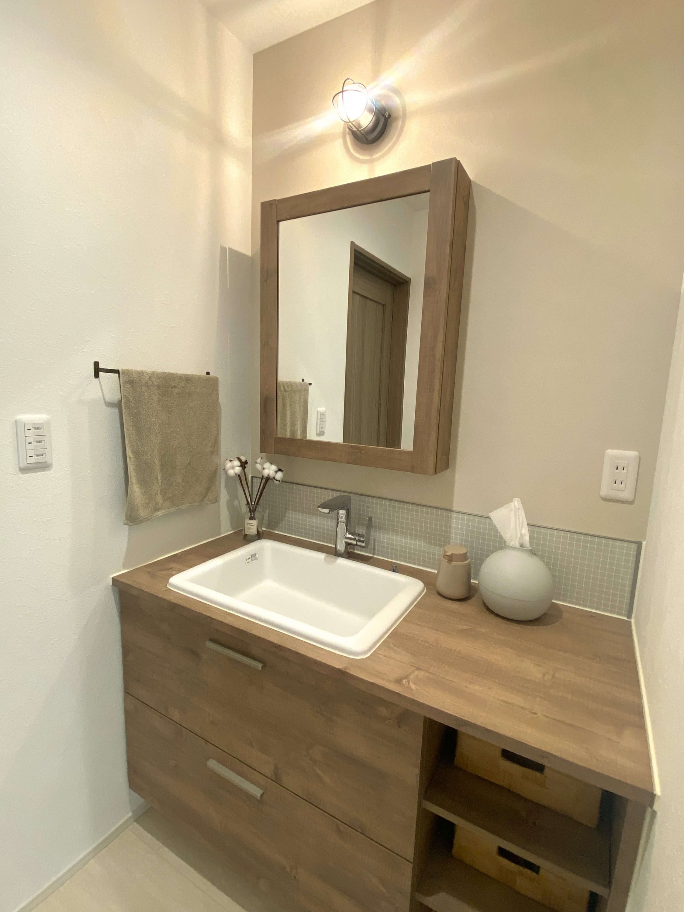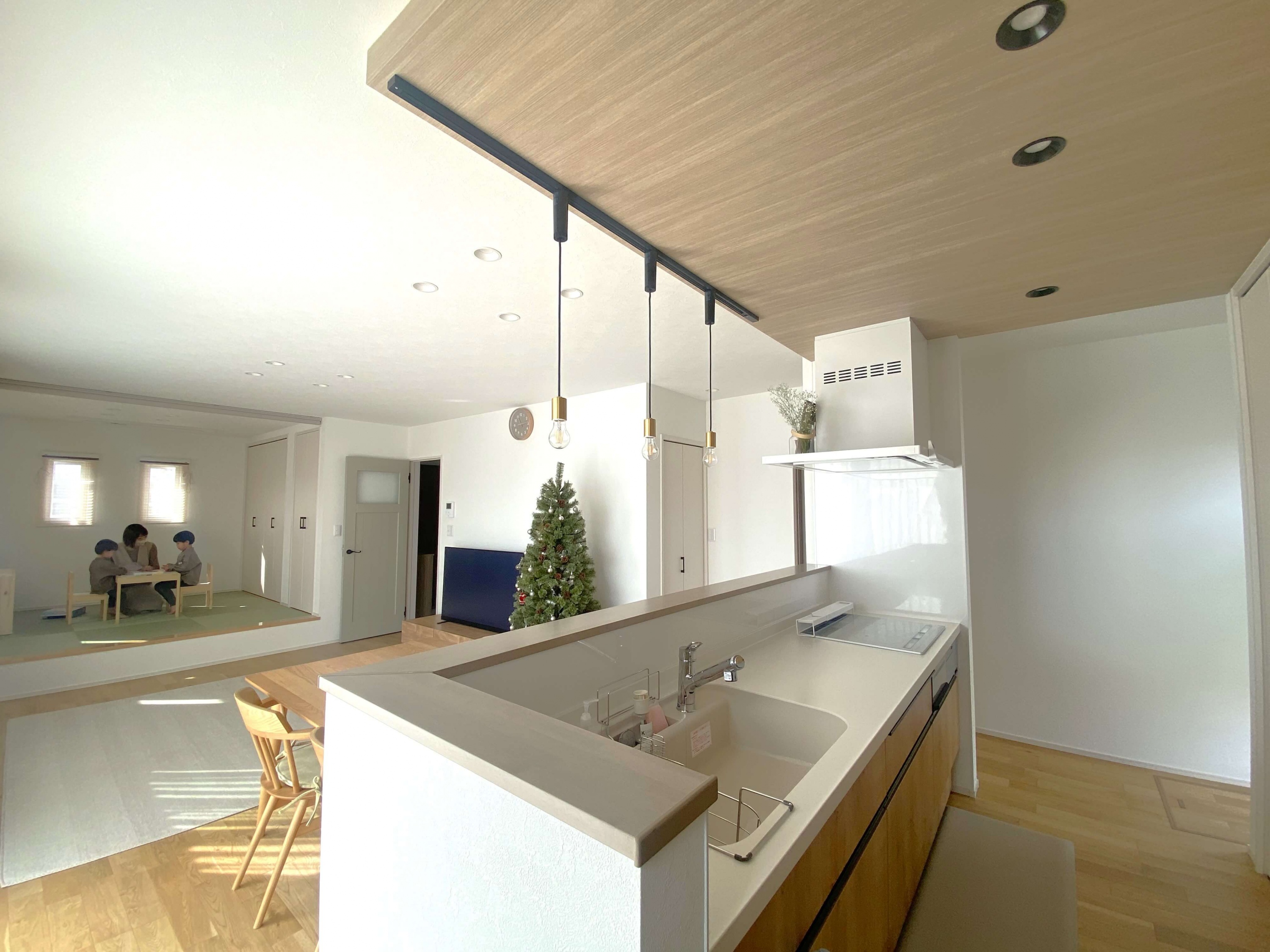 子育て中のS様のおうちは、自分たちの生活スタイルを間取りに反映。お子さまから常に目を離さずに料理ができるLDK や 小上がりの畳コーナー、キッチンや水廻りの回遊動線、 脱衣室の外に出した洗面台などが特徴的で、ナチュラルな可愛らしいお家でした。リビングにある小上がりの畳コーナーには30cmほどの段差をつけ、腰を掛けられるようにすることでリビングにソファを置かなくても快適に過ごすことができ、LDK を広々と使用できます。お布団を敷けば、お子さまのおむつ替えやお昼寝スペースに。こたつを置いたり客間にしたりと、様々な用途に使用できる空間です。