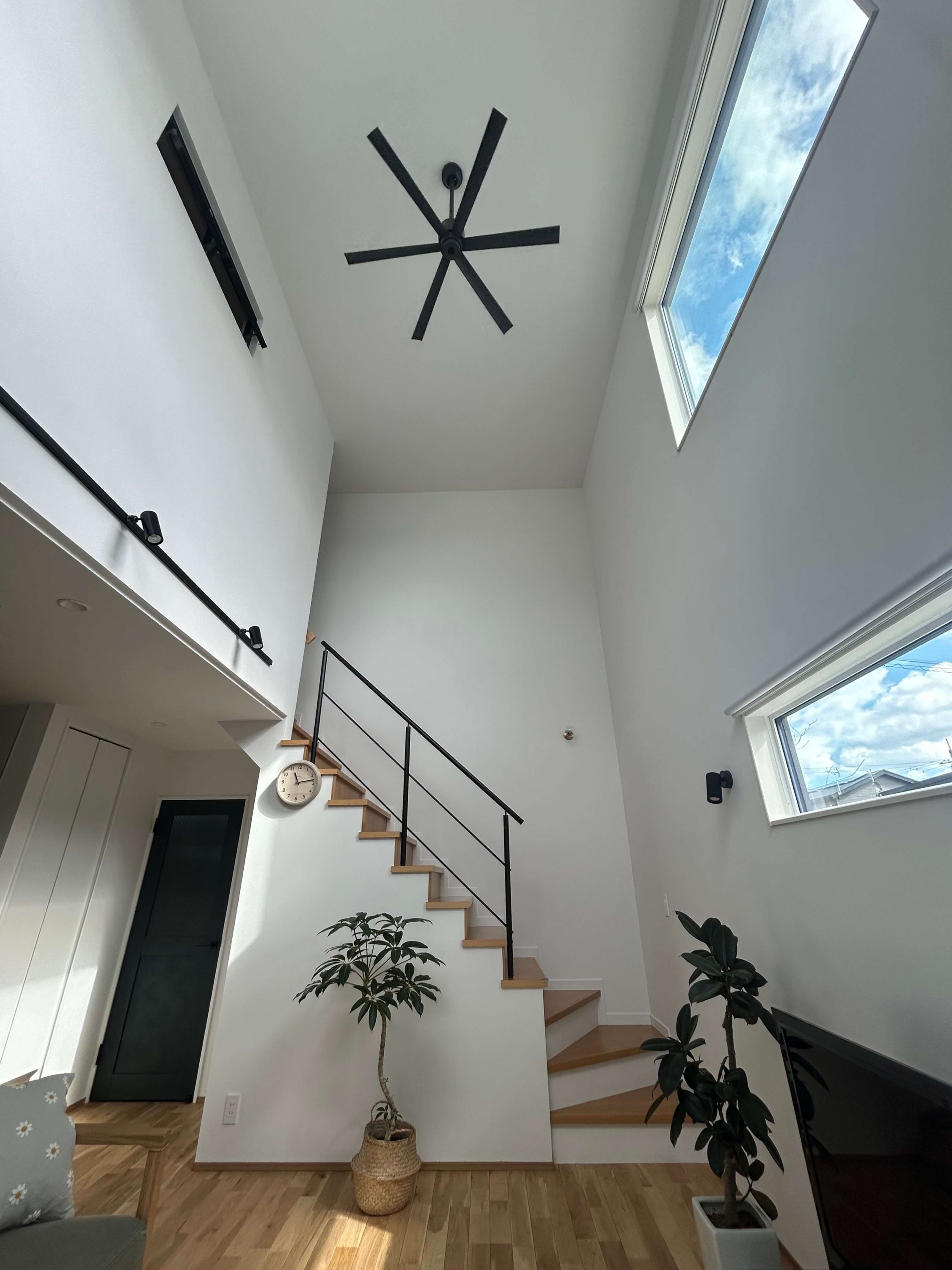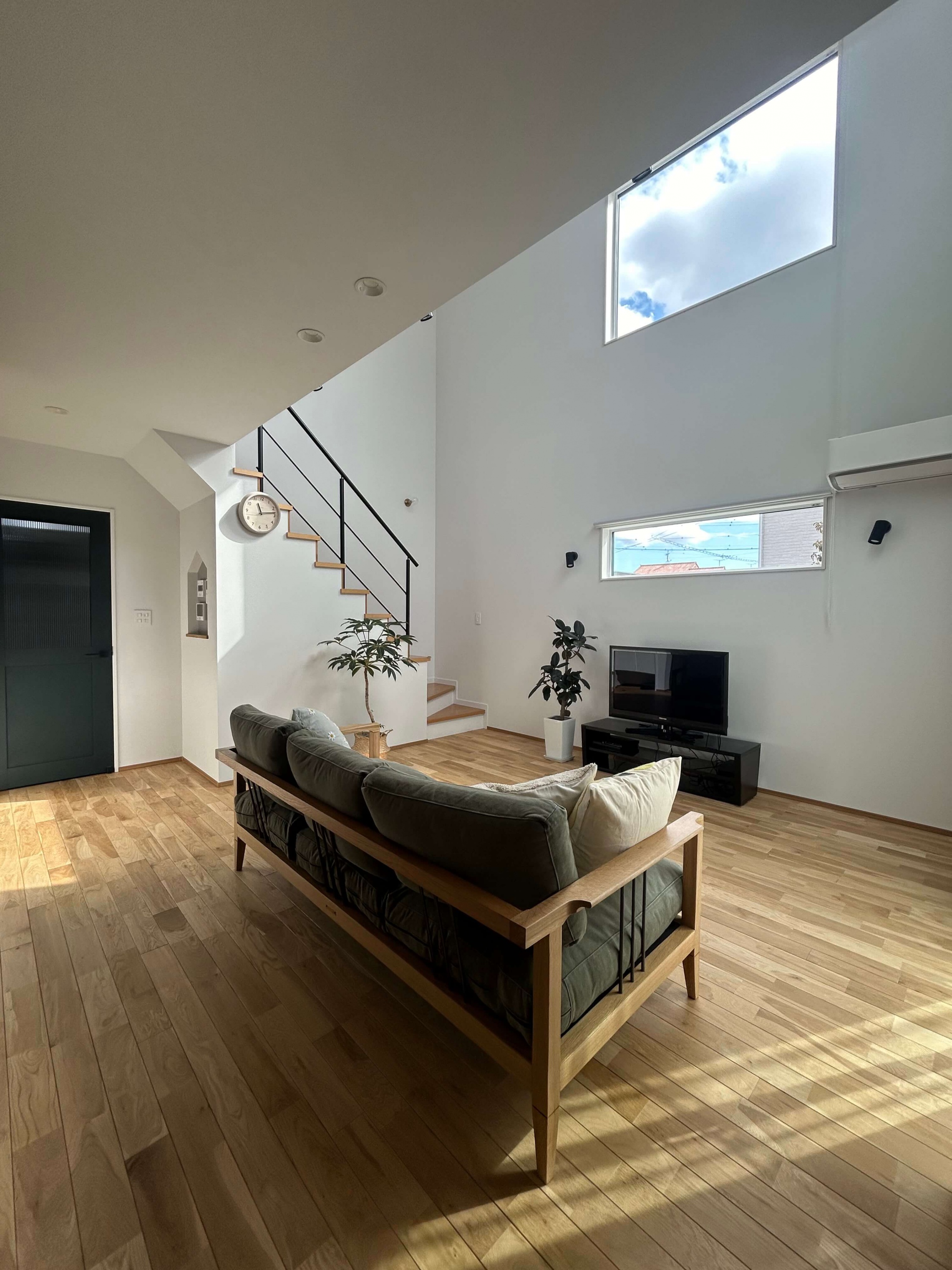 「空が見える家」をテーマに家づくりを始めたK様。家族が集まるリビングには大きな吹き抜けと窓を設け、青空と繋がる家を再現しました。また、インテリアや内装はすべて自然色であるベージュやホワイト、グリーン、グレーなどを使用することで外との一体感が感じられるような空間に仕上げました。さらに間取りでは、家事のしやすい回遊動線を採用。忙しい朝や夜の時間帯でも行き止まりがなく、家の中を行き来できるキッチン⇔水廻り⇔玄関の動線にも注目の青空と採光が心地良いおうちです。