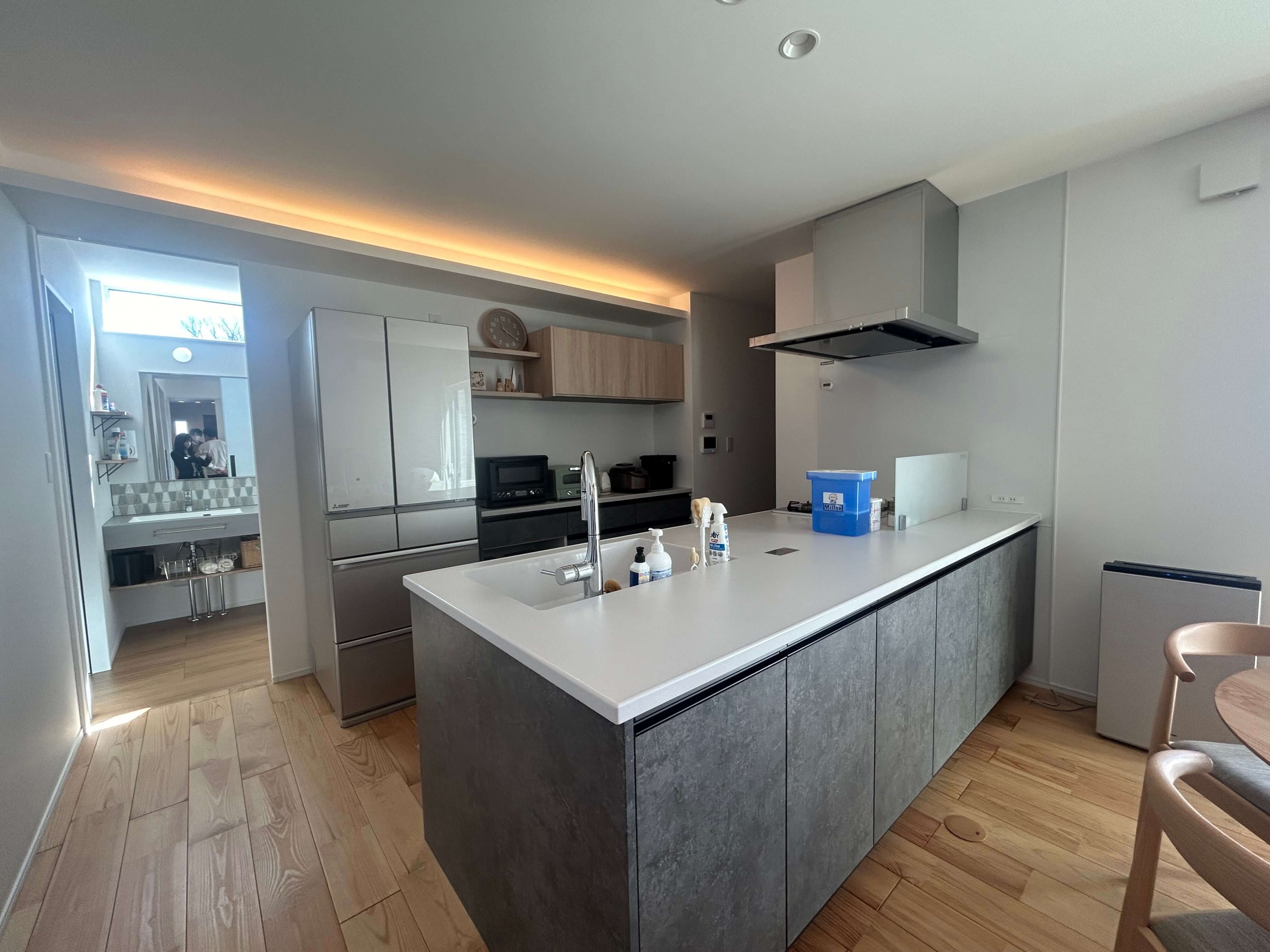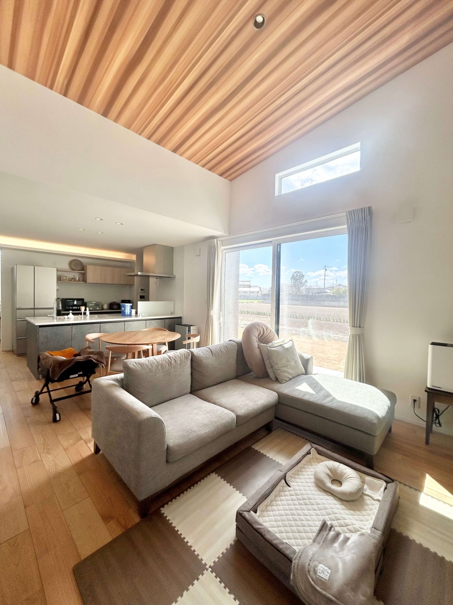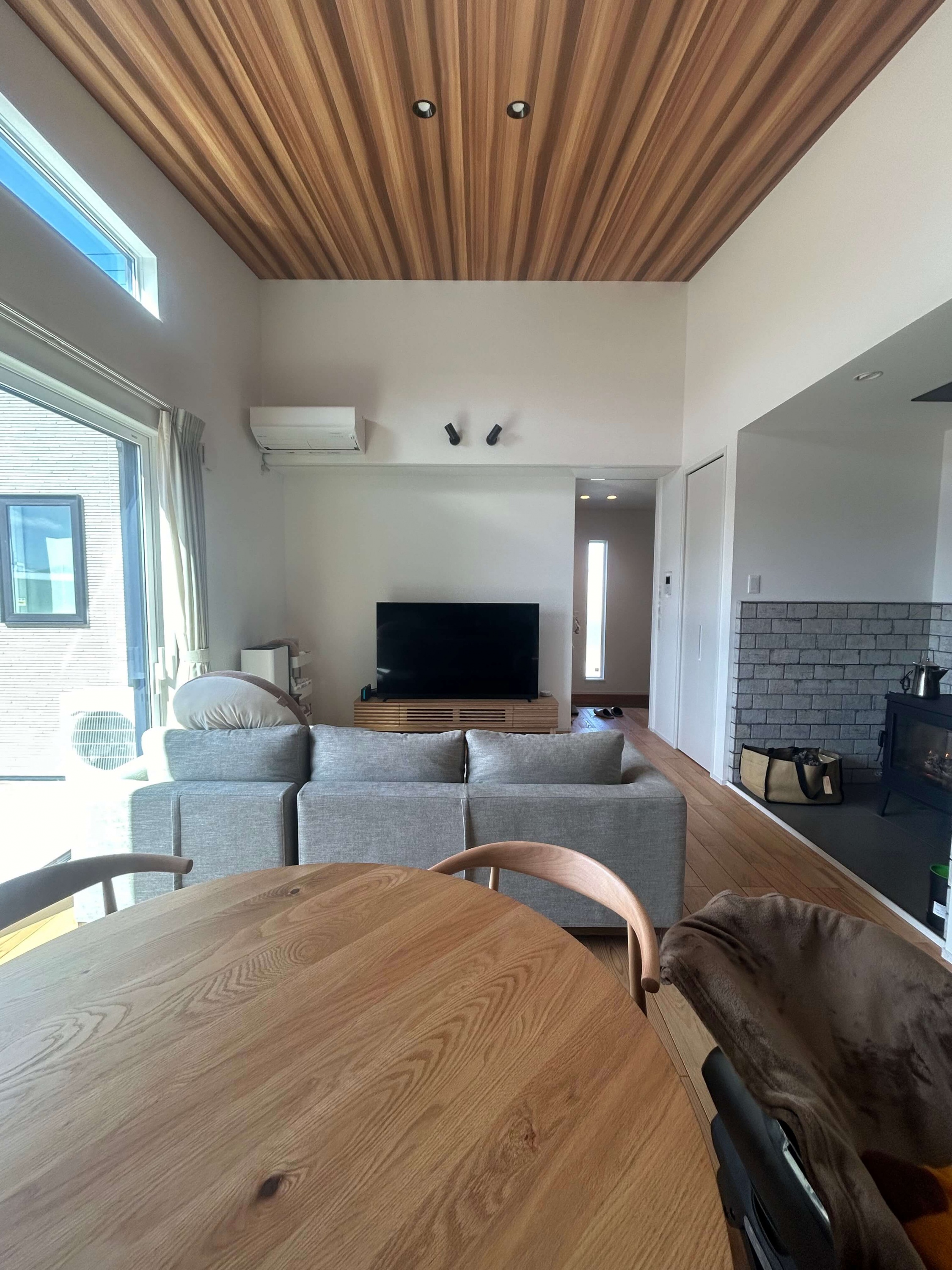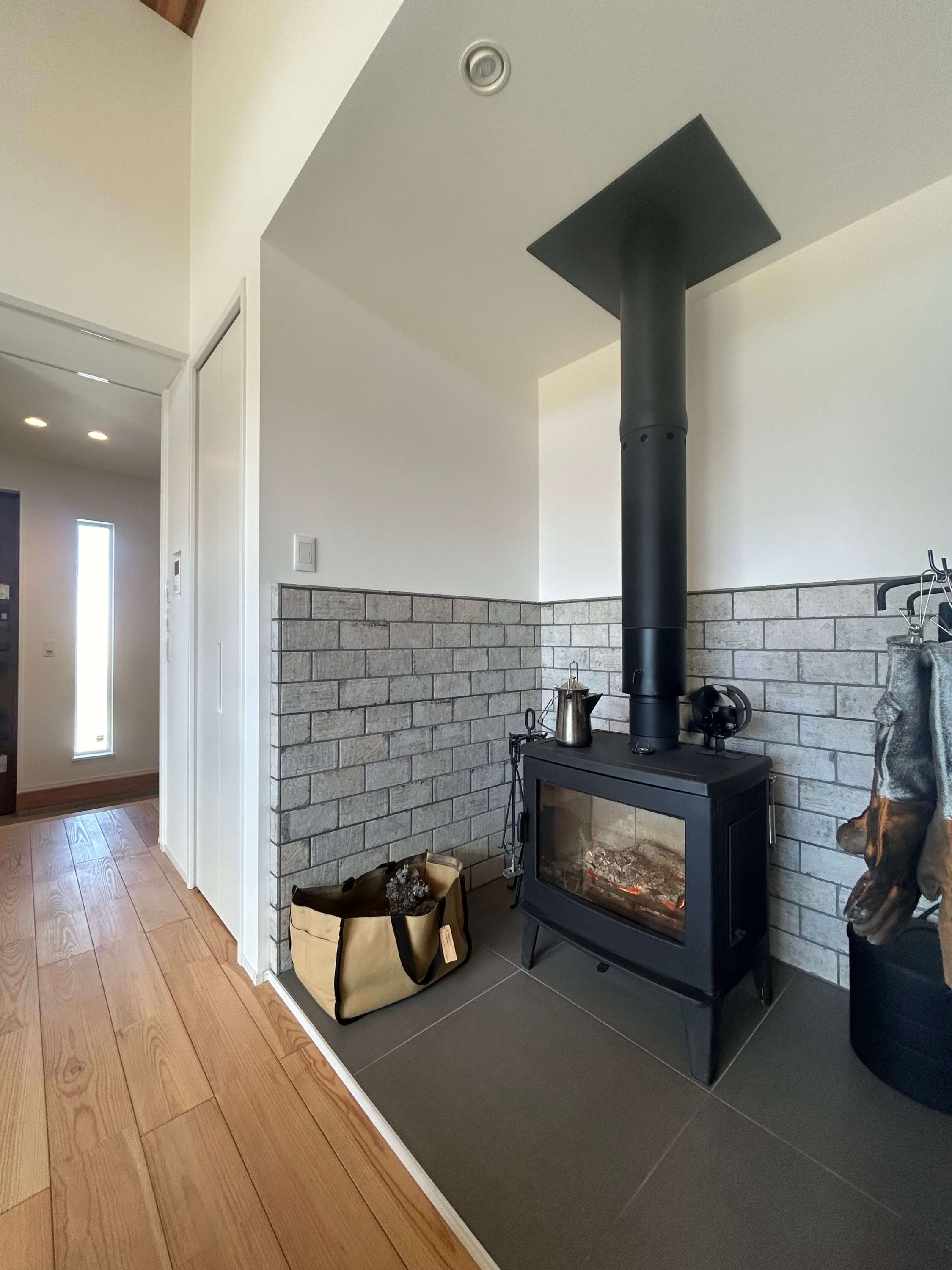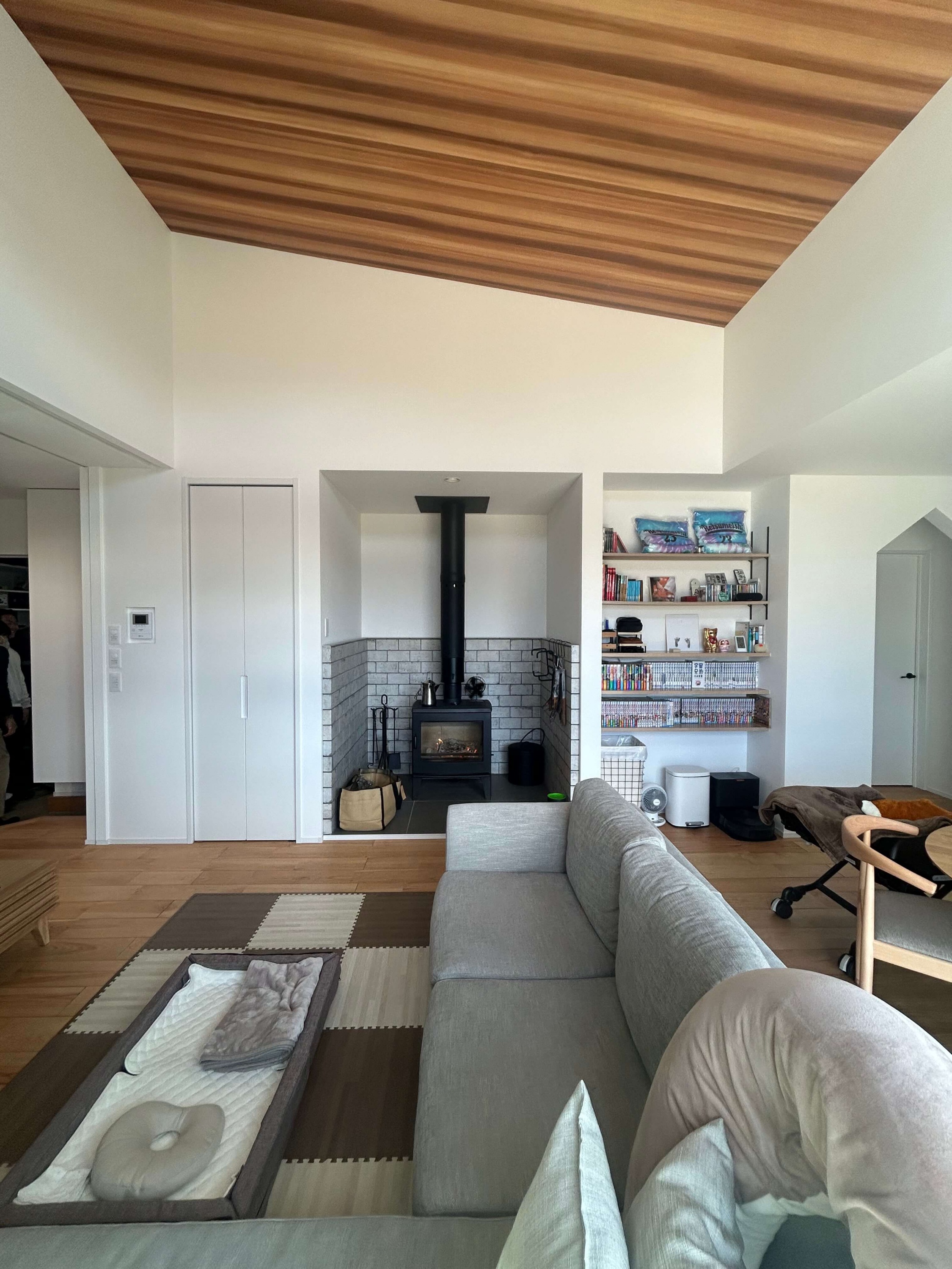 アウトドアがお好きなH様の家は、薪ストーブや天井の木目、青空と繋がる窓など家の中でもアウトドア気分が楽しめる平屋。玄関脇はジムになっておりスノボ用品やマウンテンバイクの収納も可能で、まるでショップのような秘密基地空間です。 また、洗面と脱衣室を分けたり、洗って干して畳んでしまうが1箇所で完結する外干しも室内干しも可能なランドリールーム、大容量のパントリー(食品庫)など、毎日の生活が豊かになる工夫がたくさん。老若男女問わずに楽しく暮らせる平屋です。