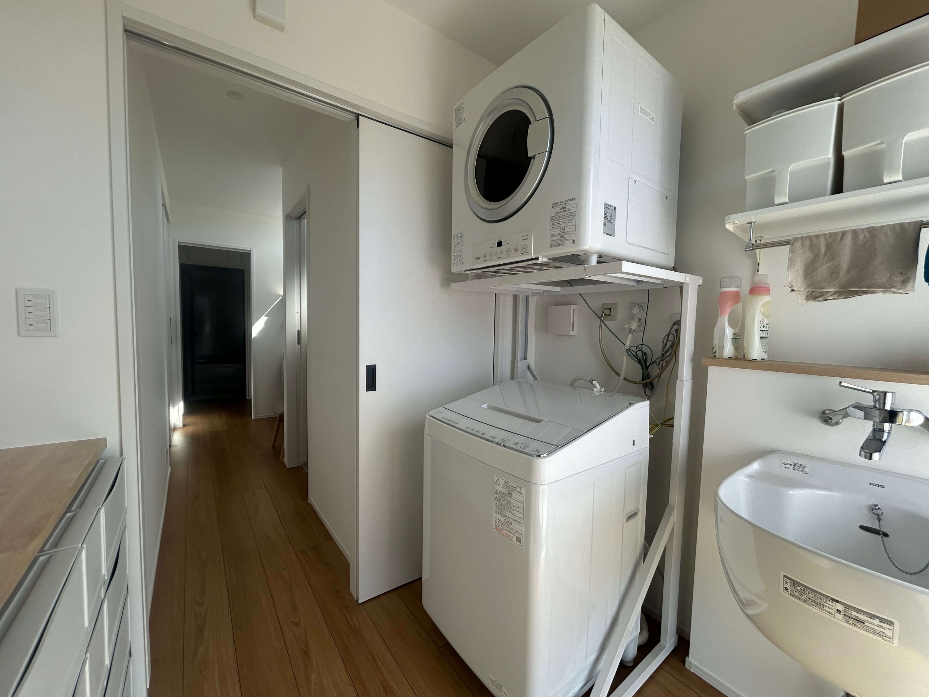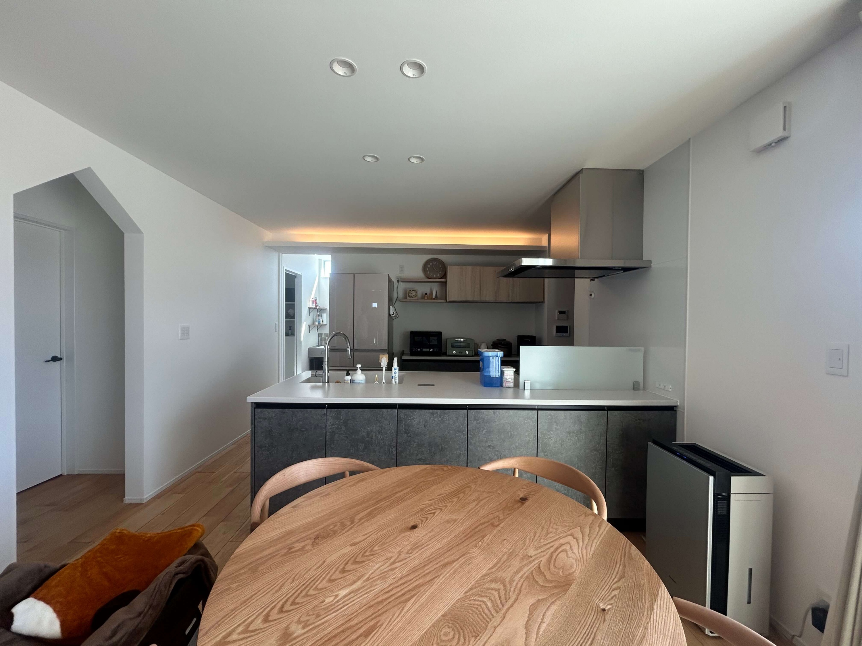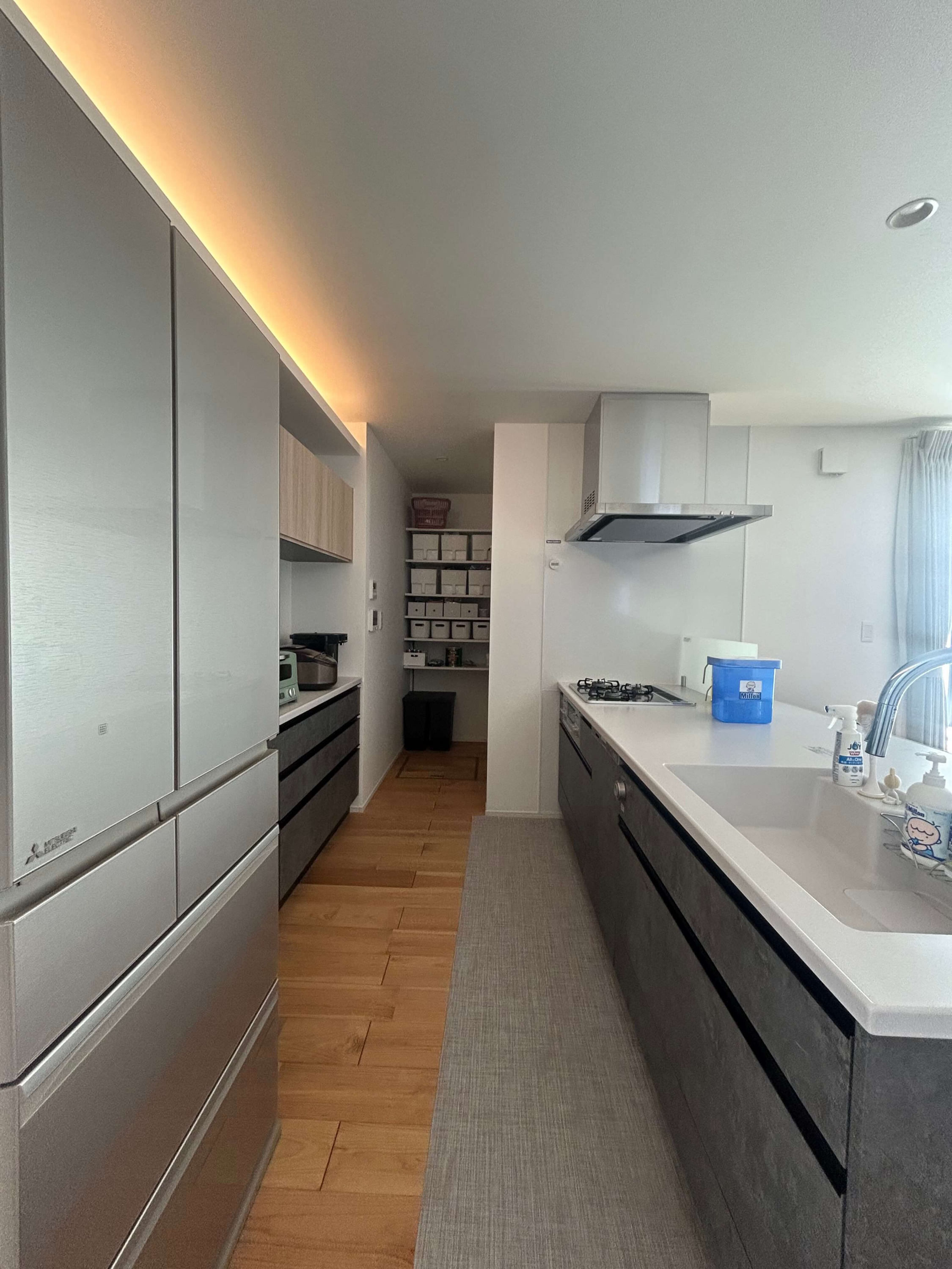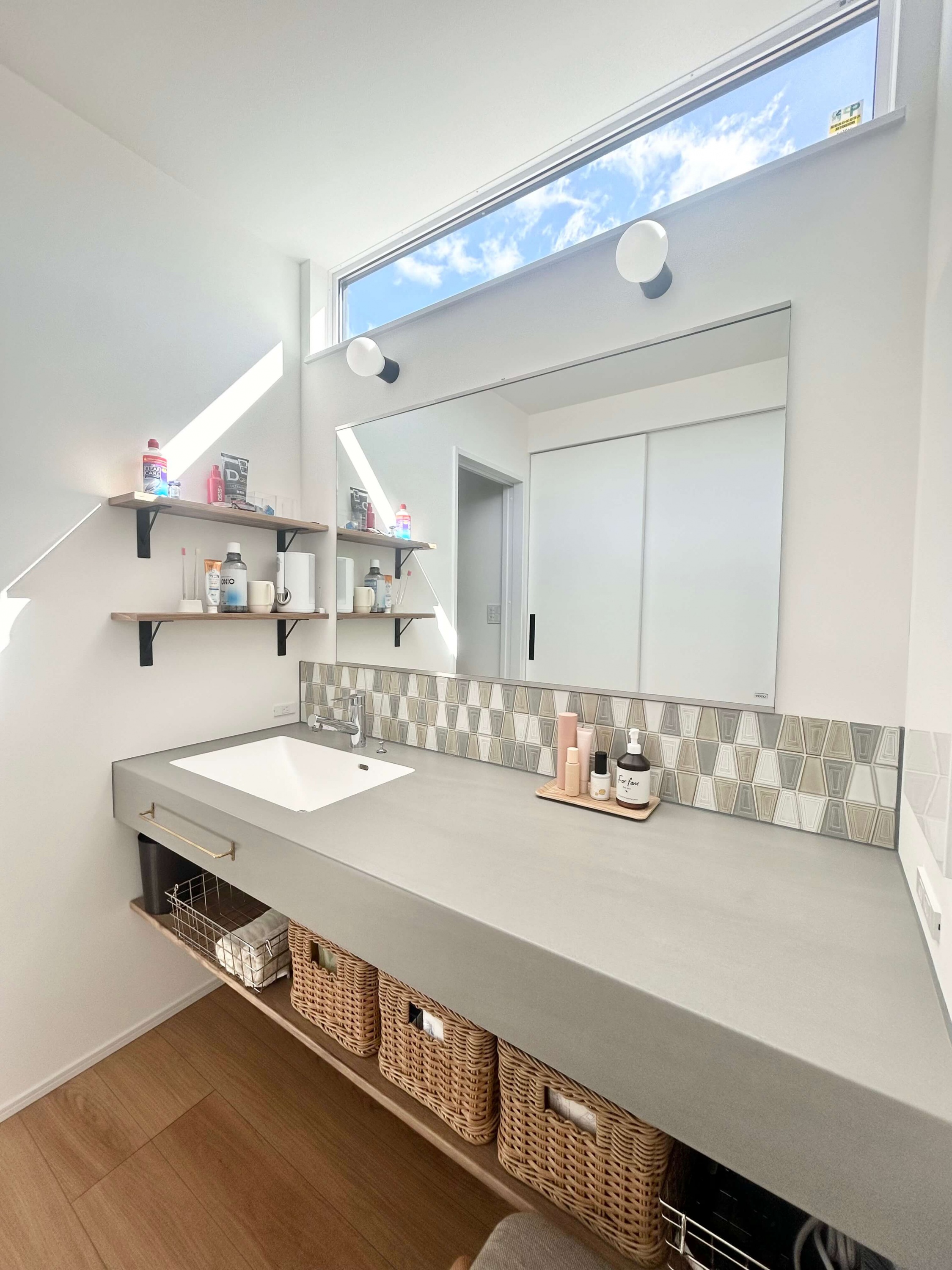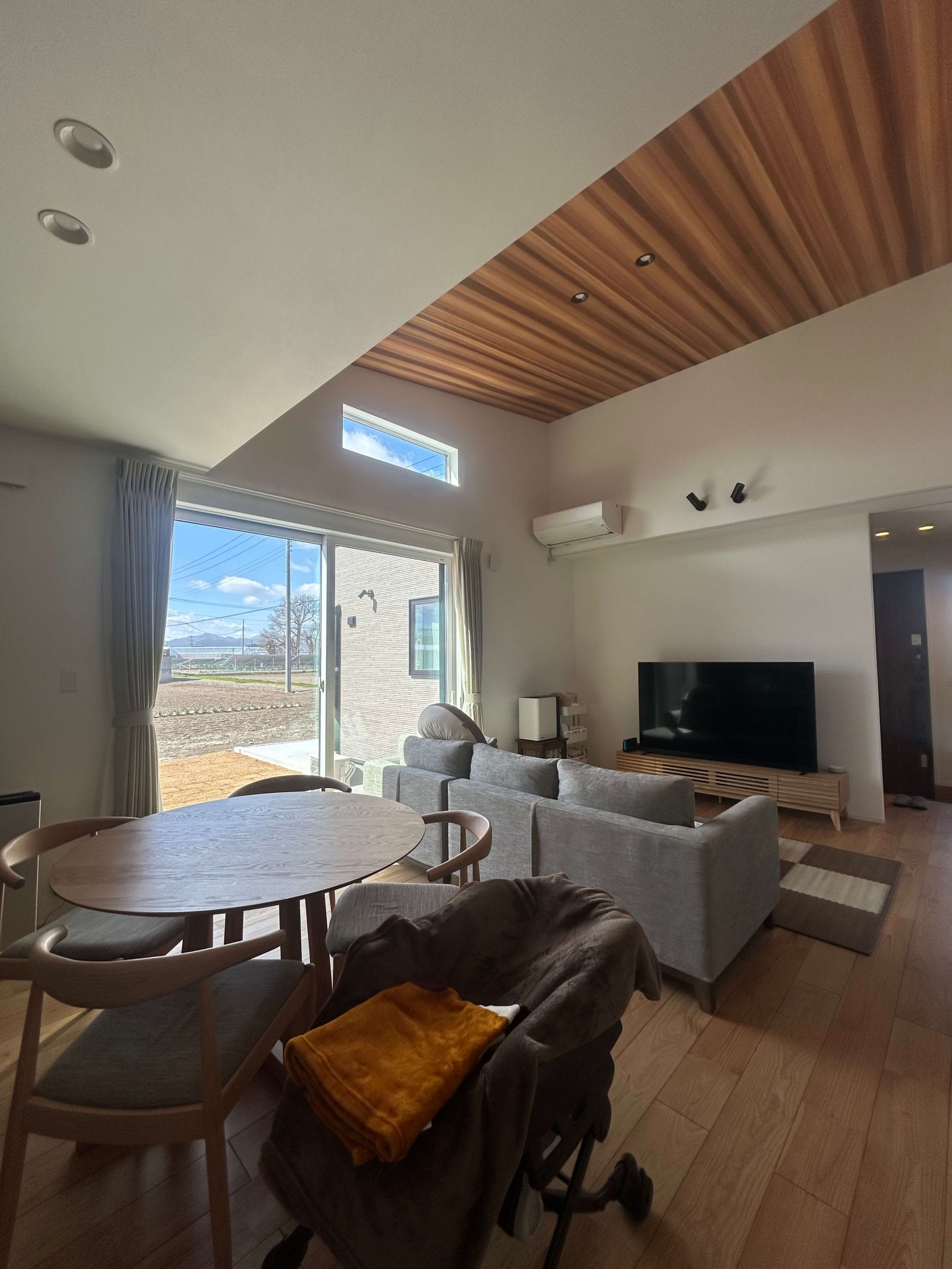 アウトドアがお好きなH様の家は、薪ストーブや天井の木目、青空と繋がる窓など家の中でもアウトドア気分が楽しめる平屋。玄関脇はジムになっておりスノボ用品やマウンテンバイクの収納も可能で、まるでショップのような秘密基地空間です。 また、洗面と脱衣室を分けたり、洗って干して畳んでしまうが1箇所で完結する外干しも室内干しも可能なランドリールーム、大容量のパントリー(食品庫)など、毎日の生活が豊かになる工夫がたくさん。老若男女問わずに楽しく暮らせる平屋です。