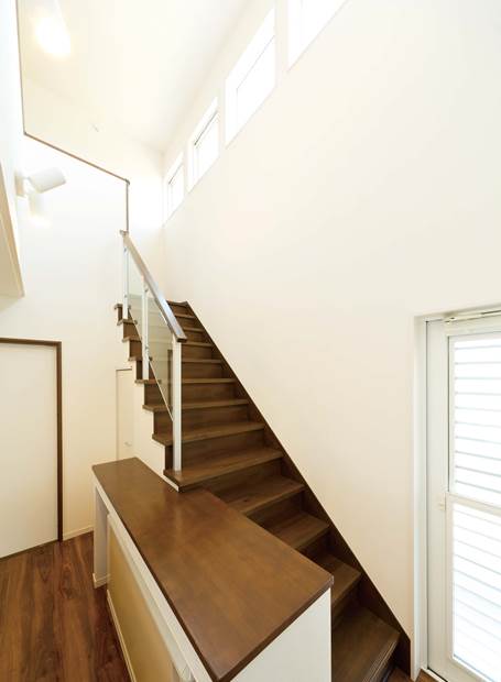吹き抜けの明るいリビング階段。