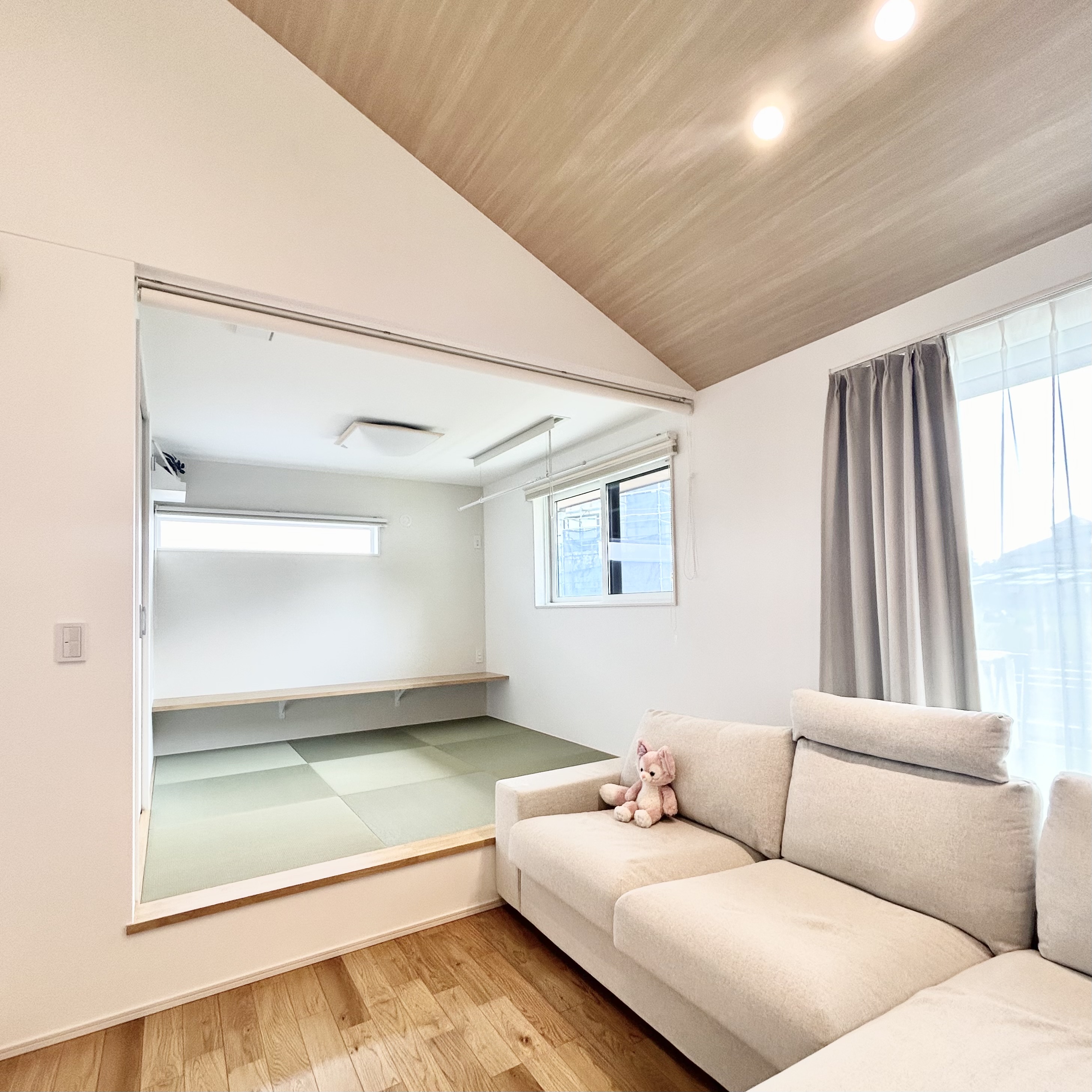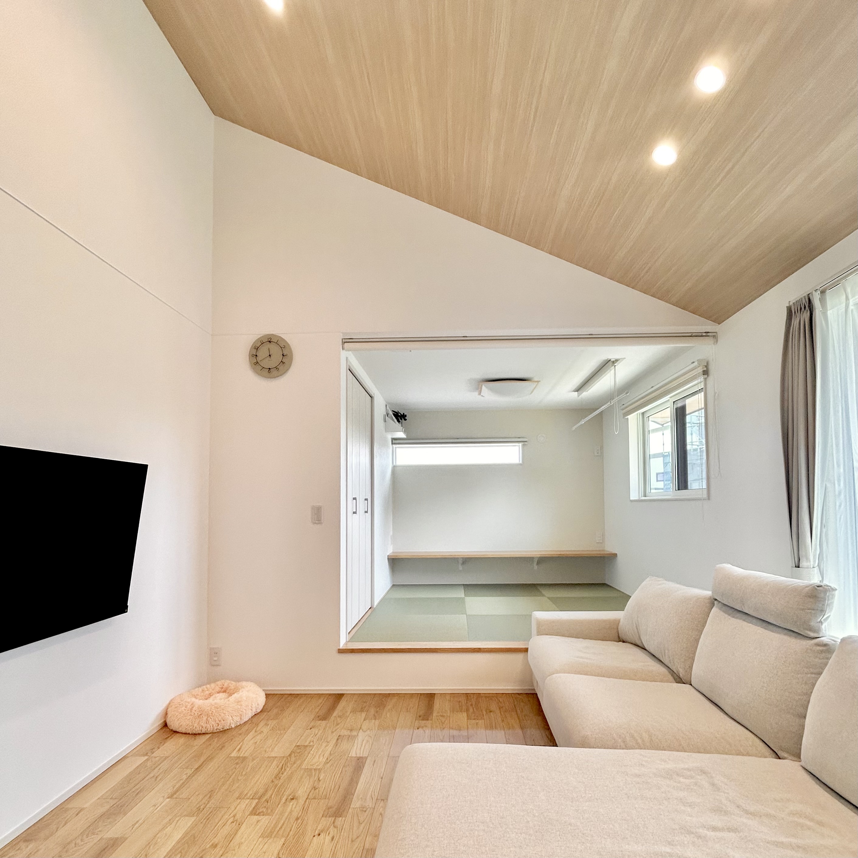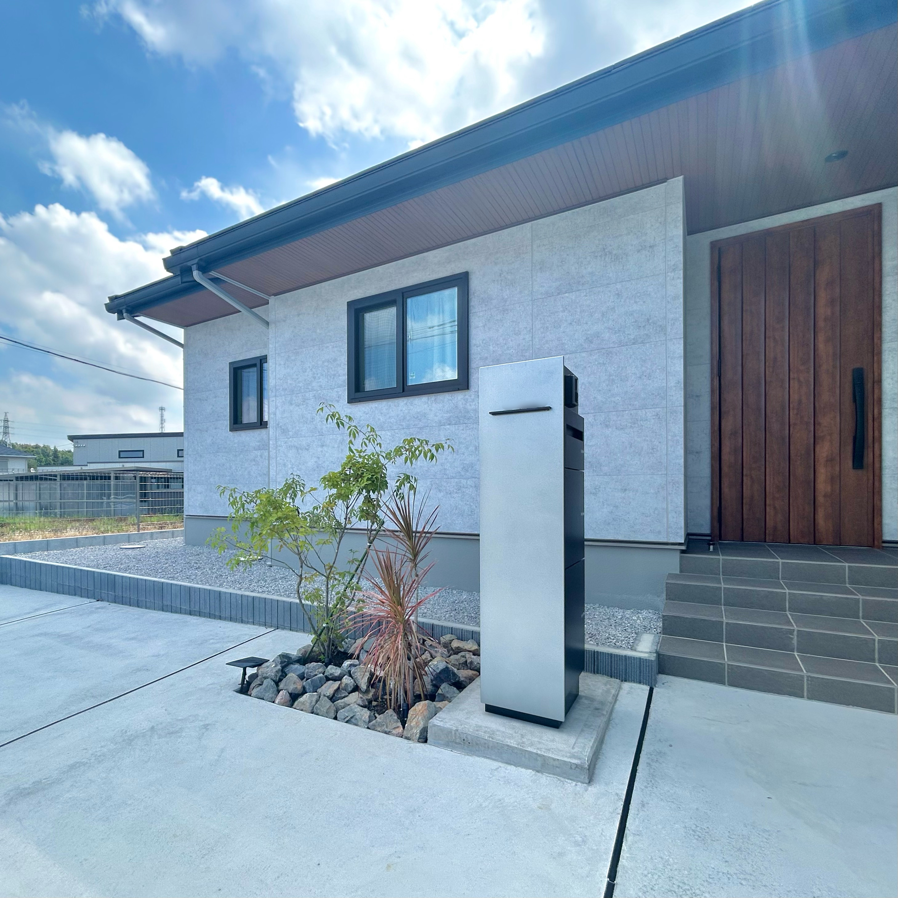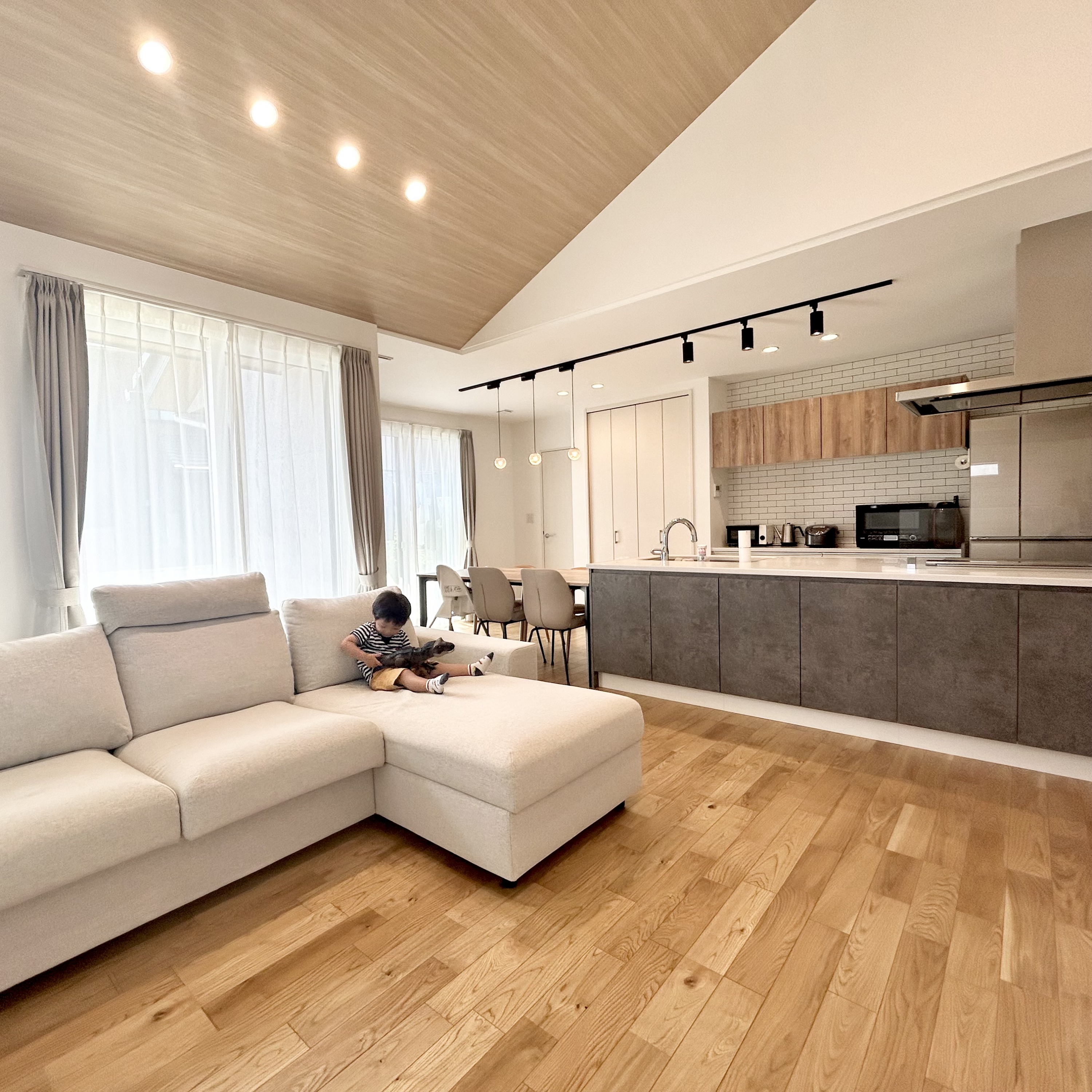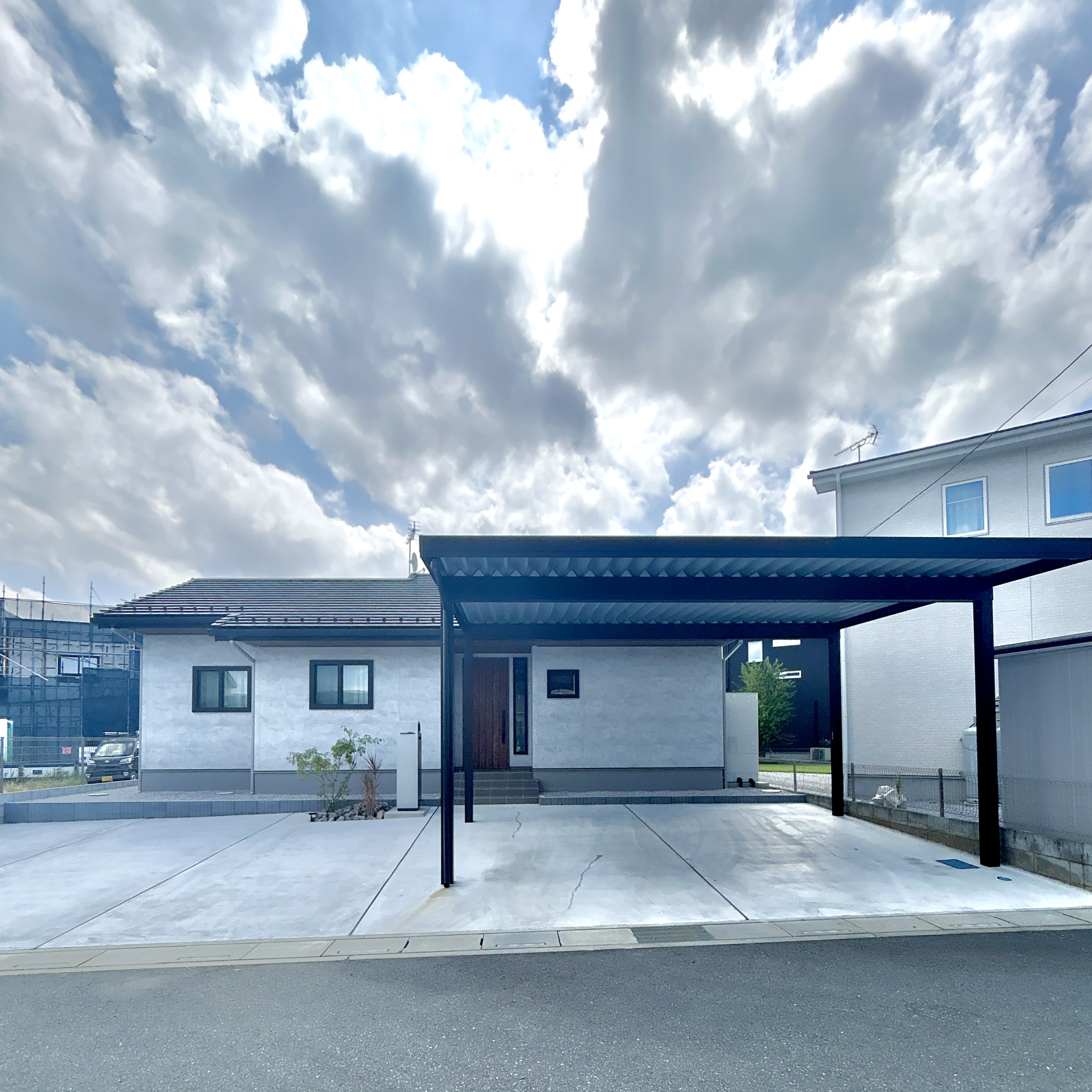 シンプルでありながら存在感を放つスタイリッシュな外観のH様邸。室内は木目を活用した暖かみのある明るいデザインで、家族がホッとできるような空間を創り出しています。間取りは毎日忙しい家族を助ける工夫がたっぷり。回遊動線やファミリークローゼット、キッチンとダイニングが横並びになった設計など暮らしがラクになるこだわりが盛りだくさんです。また、駐車場スペースが広く取られた平屋なので親戚やお友達を呼んでホームパーティーをするのにもぴったり。老若男女問わず快適に暮らせる平屋です。