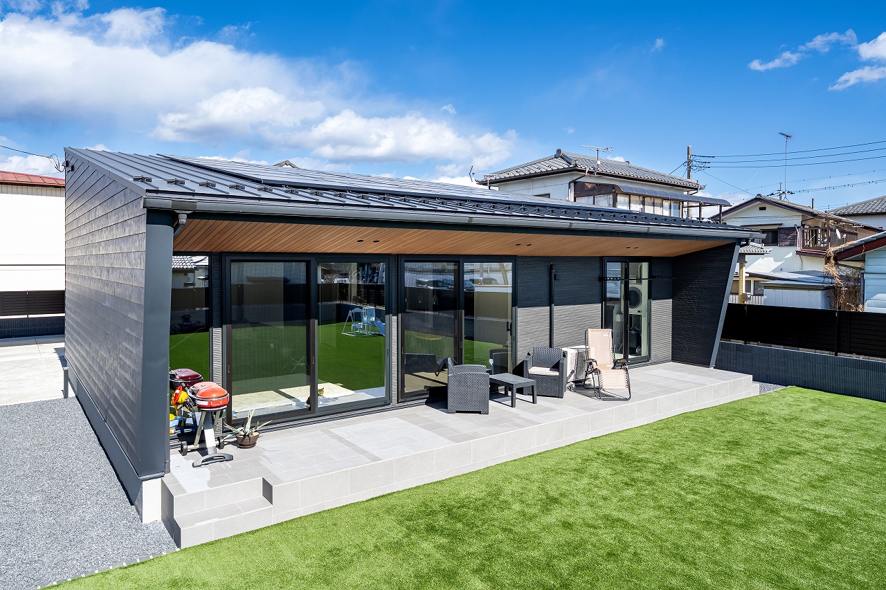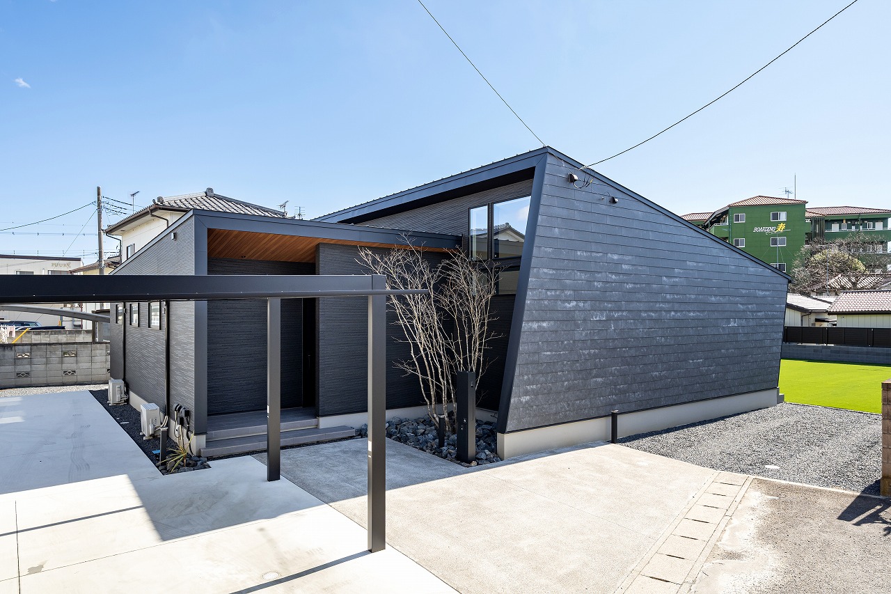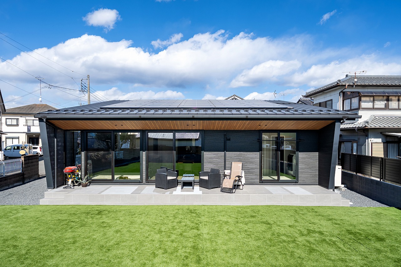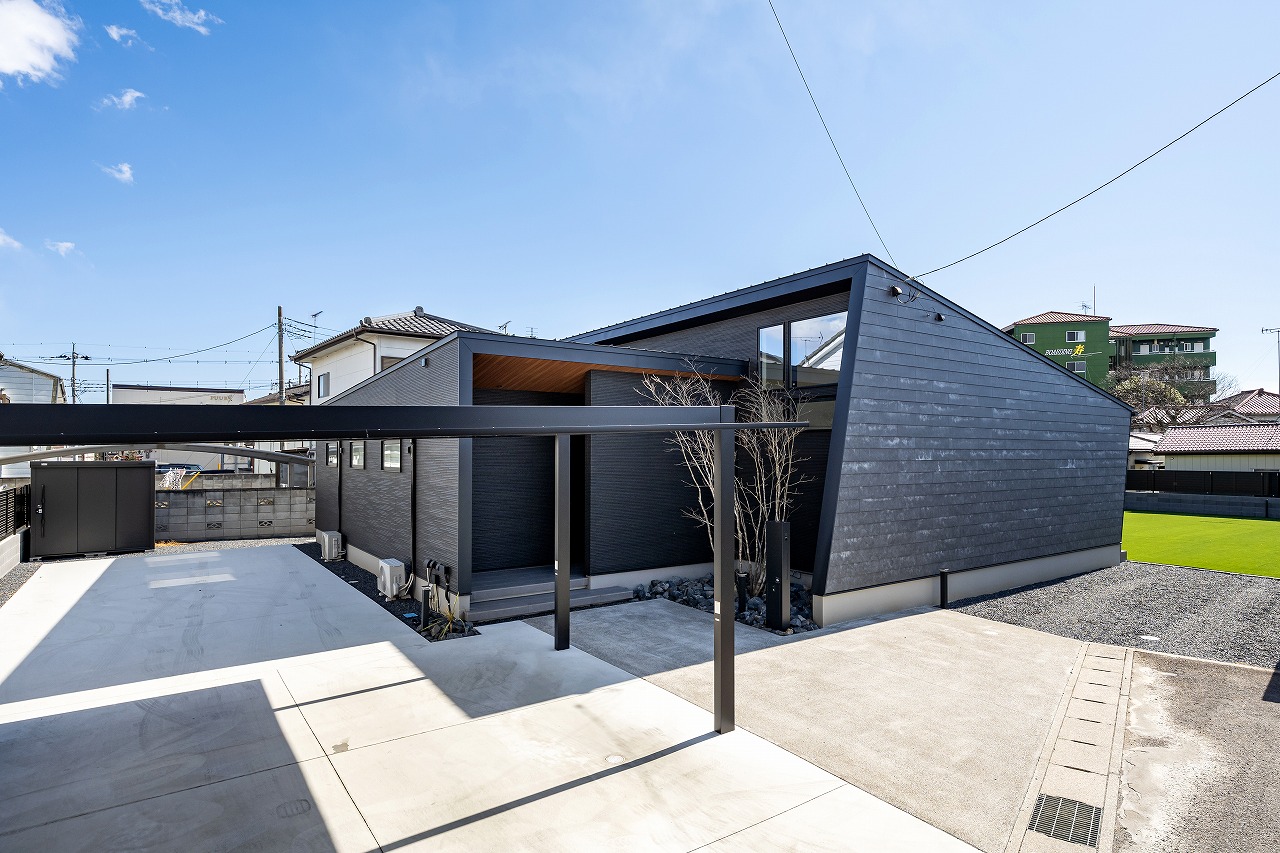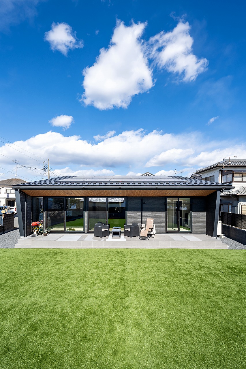 広大な土地を生かして広々としたお庭に建つ平屋のT様邸。室内と外がつながる開放的な設計が魅力で、リビングと庭をつなぐ大きな窓からはBBQや猫ちゃんが日向ぼっこをする様子が広がります。デザイン面では室内外ともにモダンな雰囲気で統一。植栽や木目の天井、ペンダントライトなどをアクセントにスタイリッシュな雰囲気に仕上げました。さらにリビングの壁は外壁と同じ素材を使用することで視線が抜け、まるで外と中が一体化したような開放感を演出します。他にも、キッチンとダイニングの横並び配置や贅沢な回遊動線、ファミリークローゼット隣接のランドリールームなど、家事のしやすさにもこだわった暮らしやすく魅力あふれる住まいです。