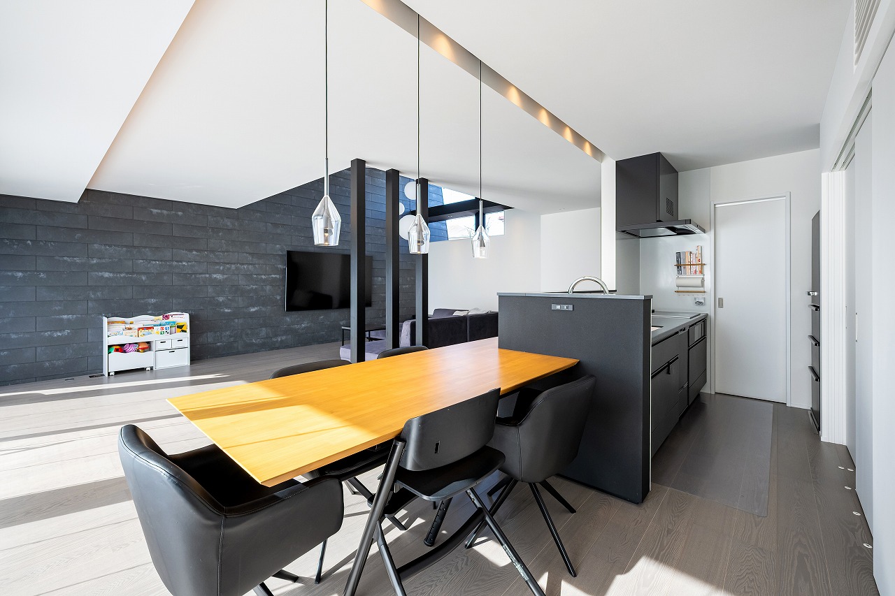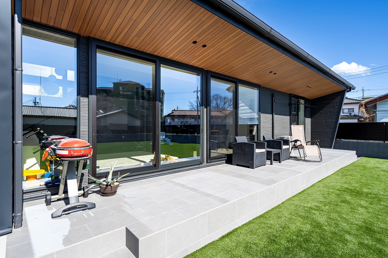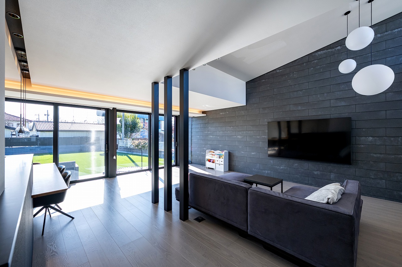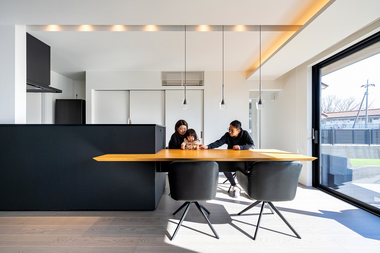 広大な土地を生かして広々としたお庭に建つ平屋のT様邸。室内と外がつながる開放的な設計が魅力で、リビングと庭をつなぐ大きな窓からはBBQや猫ちゃんが日向ぼっこをする様子が広がります。デザイン面では室内外ともにモダンな雰囲気で統一。植栽や木目の天井、ペンダントライトなどをアクセントにスタイリッシュな雰囲気に仕上げました。さらにリビングの壁は外壁と同じ素材を使用することで視線が抜け、まるで外と中が一体化したような開放感を演出します。他にも、キッチンとダイニングの横並び配置や贅沢な回遊動線、ファミリークローゼット隣接のランドリールームなど、家事のしやすさにもこだわった暮らしやすく魅力あふれる住まいです。